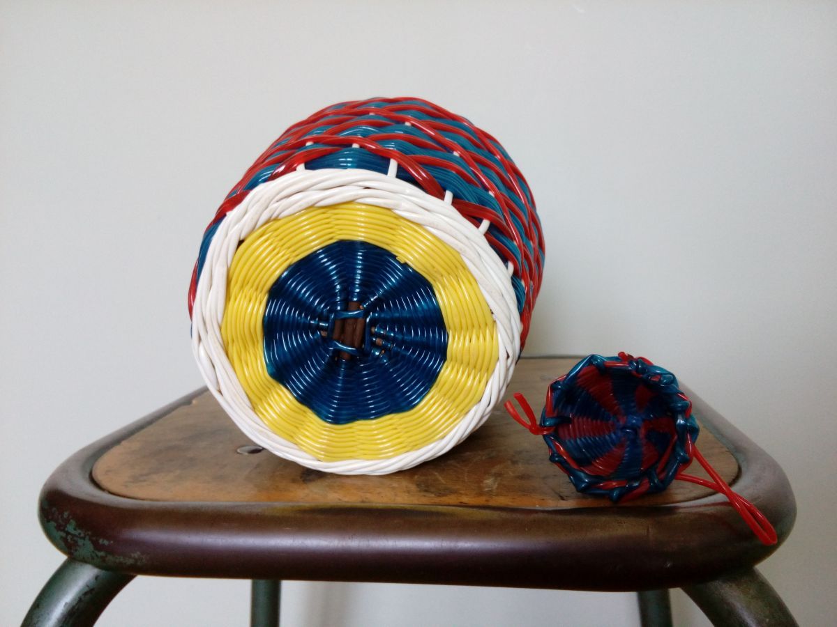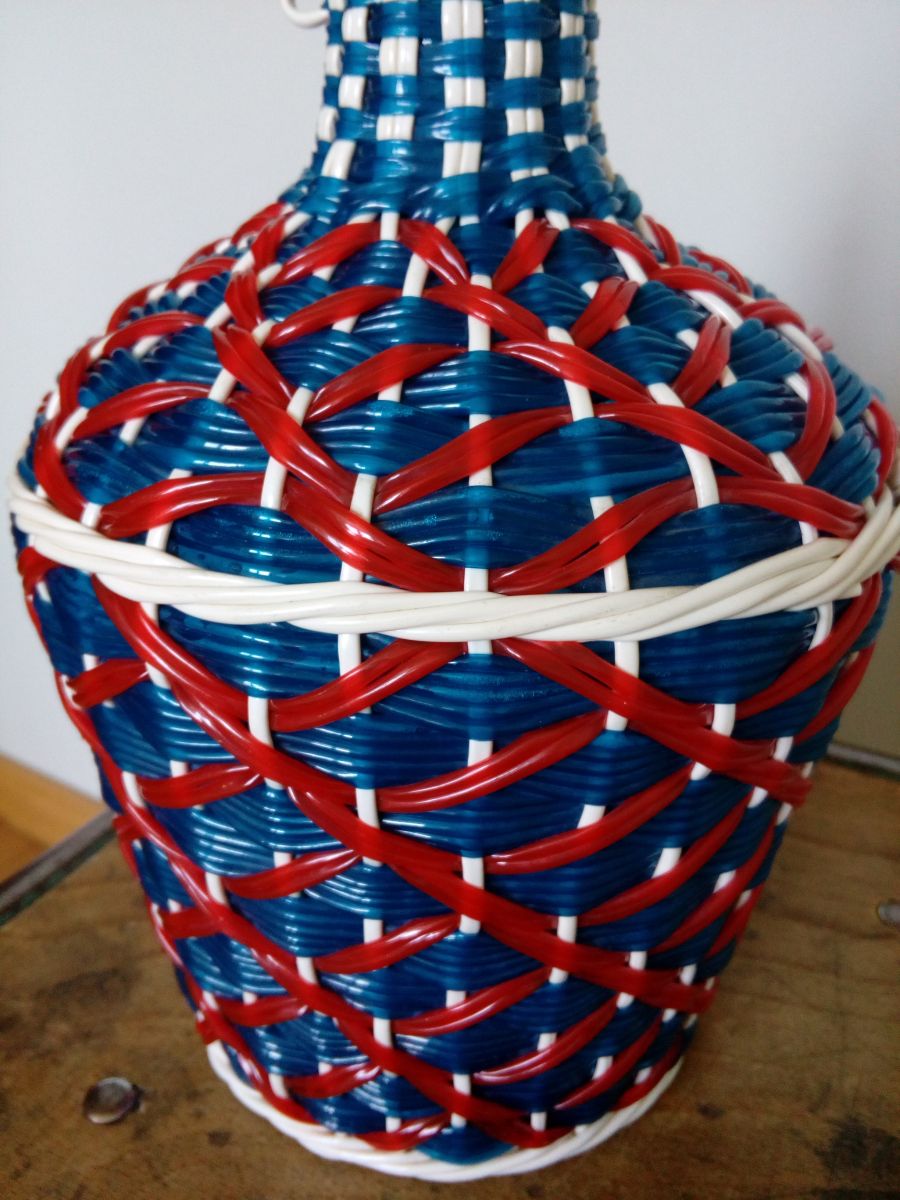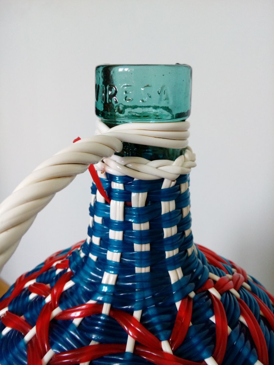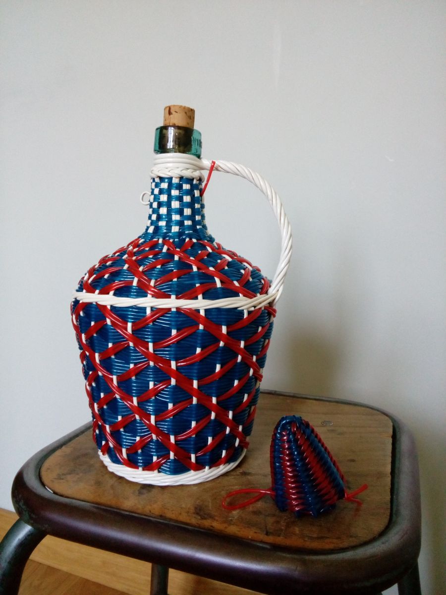 Jolie bouteille de marque Viresa en verre de couleur vert eau, recouverte de fils « scoubidou » tressés, de couleurs bleu, rouge et blanc. Typique des années 60, vintage à souhait, sa forme de bonbonne ou dame-jeanne à anse la rend assez originale. Le capuchon en fil tressé est présent, ce qui n'est plus toujours le cas après tant d'années. Il est en bon état, hormis le fil qui le reliait à la bouteille, qui est coupé. Le bouchon en liège est présent aussi. La bouteille est en très bon état, aucun fil cassé, à peine une très légère usure sur le fond. Le fond comporte aussi un tressage (de couleur jaune notamment) et est doublé d'osier. Je suppose que c'était pour amortir les chocs quand on posait la bouteille. L'ensemble a été nettoyé avec soin. Elle mesure 26 cm de haut, 31 cm environ avec le capuchon, et 18 cm environ de large. Et pèse un peu plus de 1 kg.