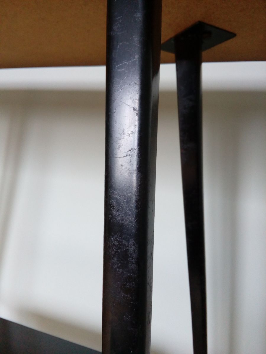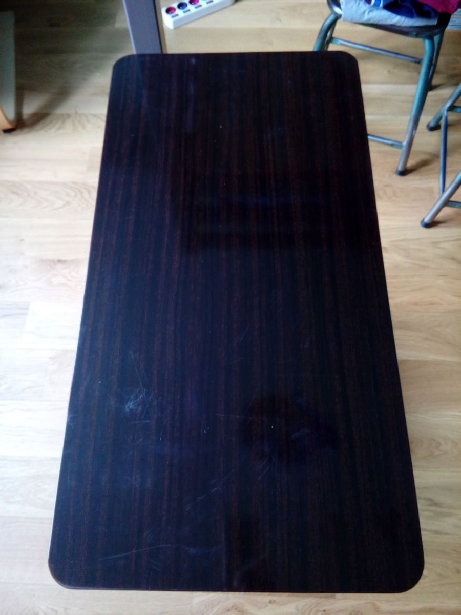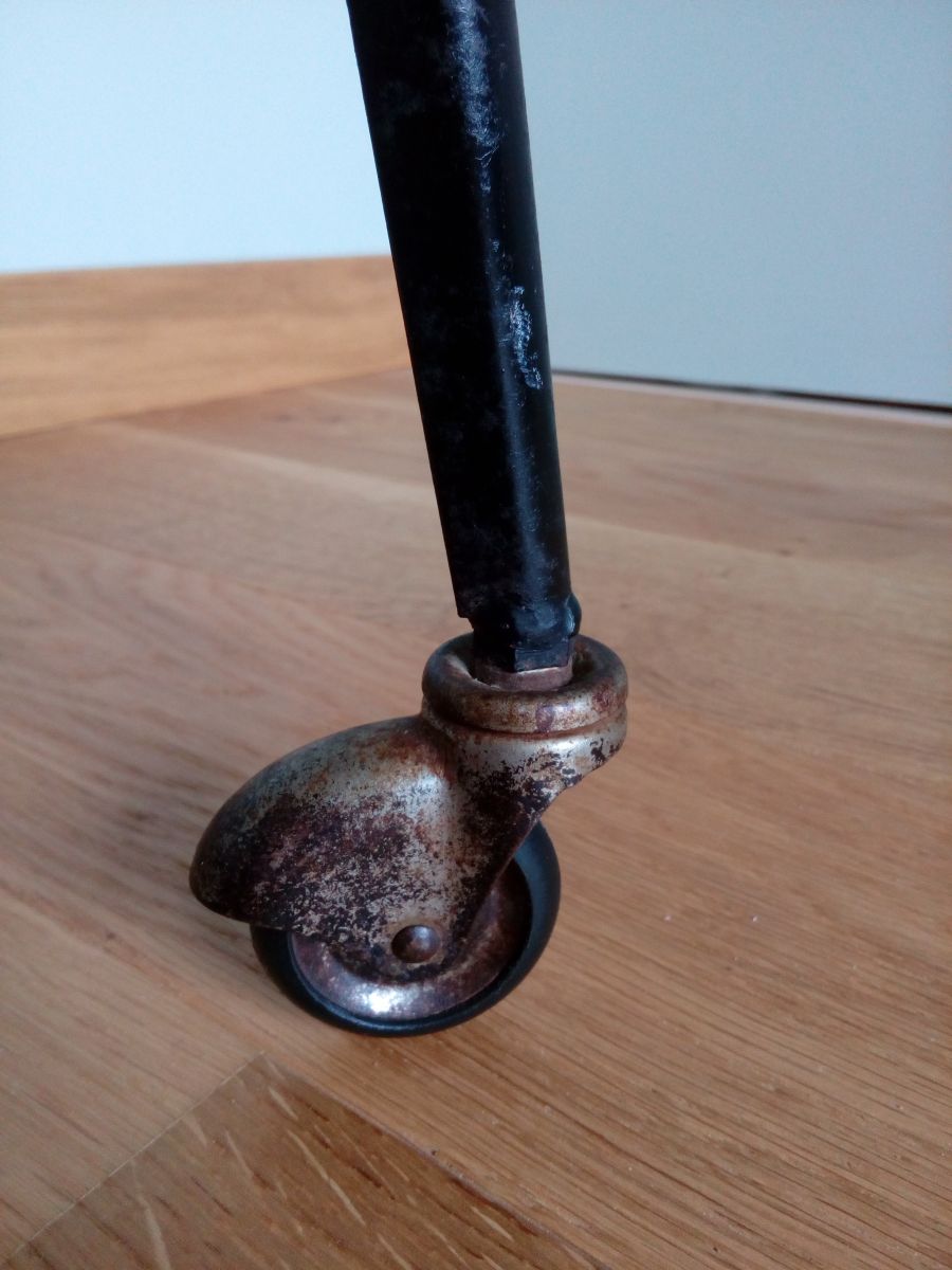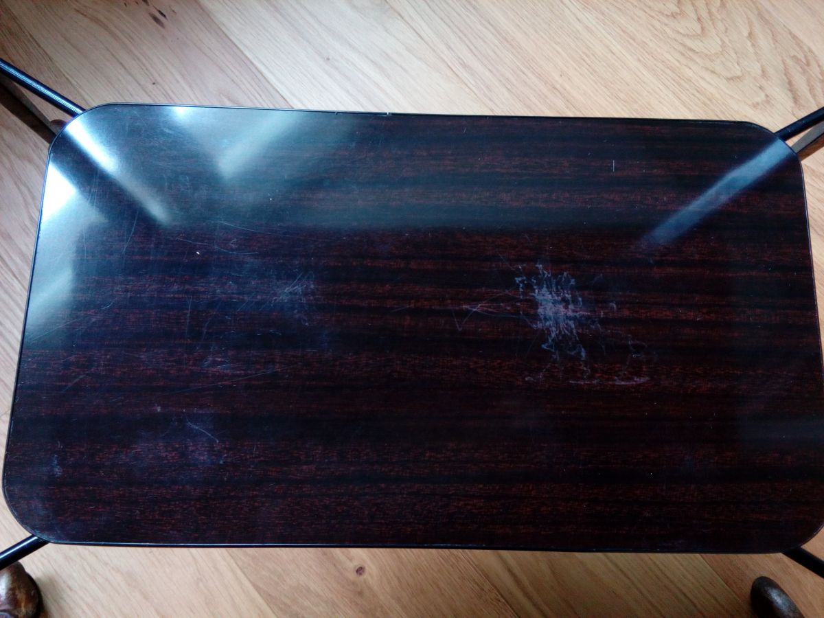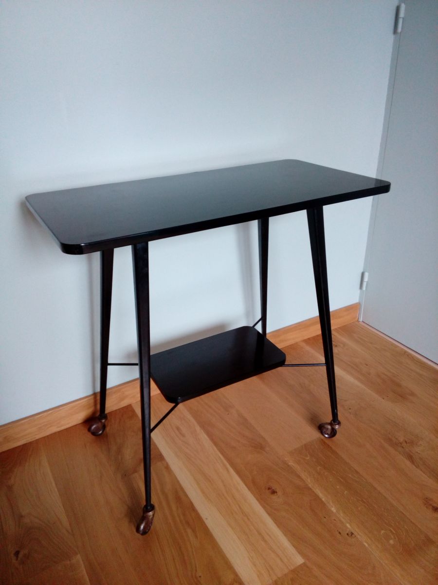 Cette desserte ou table d'appoint roulante, est typique des années 50 ou 60 mais aussi assez originale et charmante grâce à ses pieds « compas » composés d'une feuille épaisse de métal, pliée et laquée en noir. Les deux plateaux sont en formica imitation bois foncé brillant (léger veinage), ils sont en bon état général mais présentent aussi des traces caractéristiques de leur âge : quelques rayures peu profondes, éparses sur le grand plateau, et plus rassemblées sur le plateau bas (elles sont plus ou moins visibles selon l'angle de vue et la lumière, mais globalement, elles ne se voient pas trop). La « bande de chant » en plastique noir autour des tablettes est en très bon état. Les roulettes sont encore fonctionnelles mais la couleur laiton d'origine est absente sur une bonne moitié de surface des roulettes, et piquetée de rouille. La peinture noire sur les pieds présente des « tâches » un peu plus claires, nombreuses et un peu de piquetage de rouille...une couche de peinture noire serait probablement du plus bel effet ;) L'ensemble a été nettoyé soigneusement. Cette desserte mesure 72 cm de haut, le plateau du bas est à 27 cm de hauteur. Le plateau du haut mesure 74 cm par 38 cm, celui du bas mesure 35 cm par 20 cm . L'encombrement au sol est de 60 cm par 40 cm environ. L'ensemble pèse environ 8 kg. Cette table roulante sera livrée entière, non démontée et emballée avec soin.