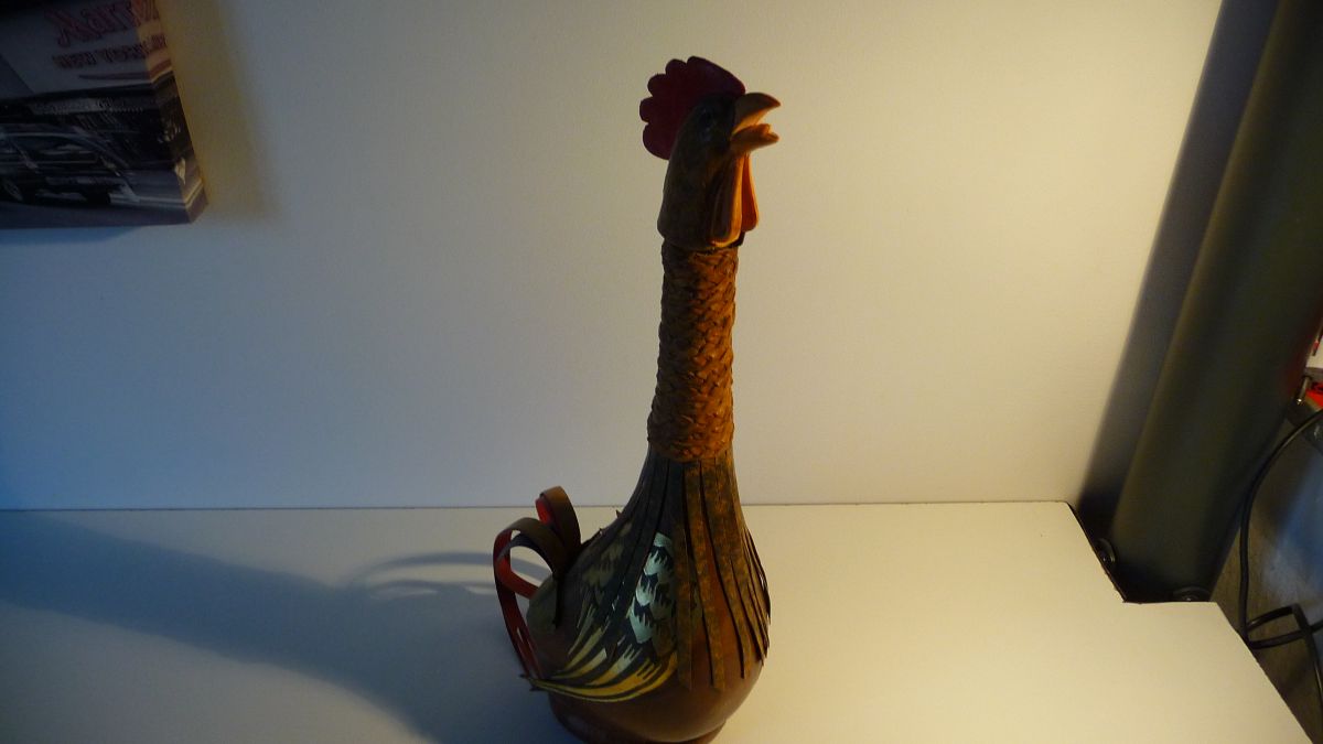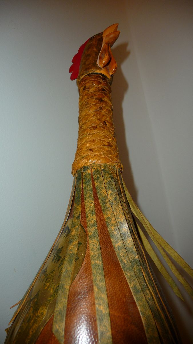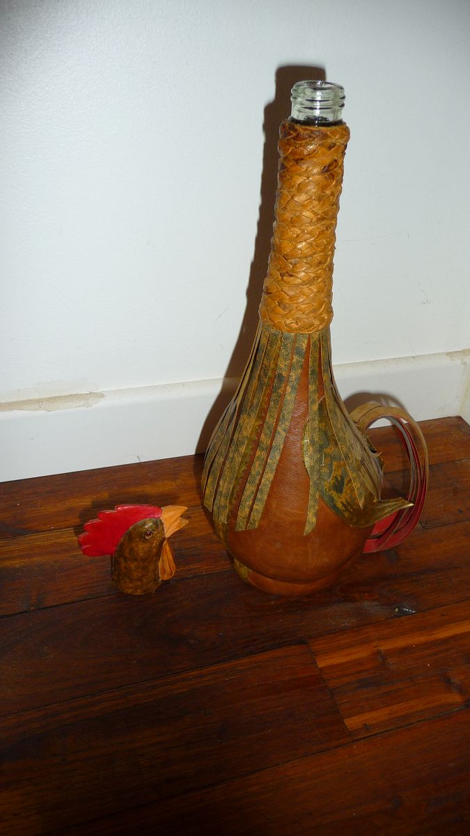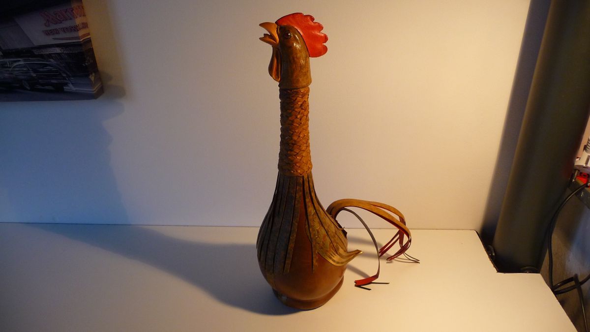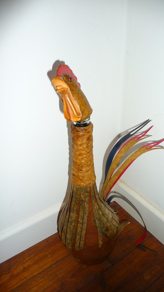 Superbe bouteille vintage recouverte de cuir représentant un coq; Les plumes du jabot et la queue sont en lanière de cuir, le cou en cuir tressé; 39 cm de hauteur. Bouteille utilisable qui peut contenir une boisson. Bouchon à vis.