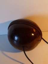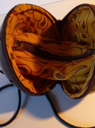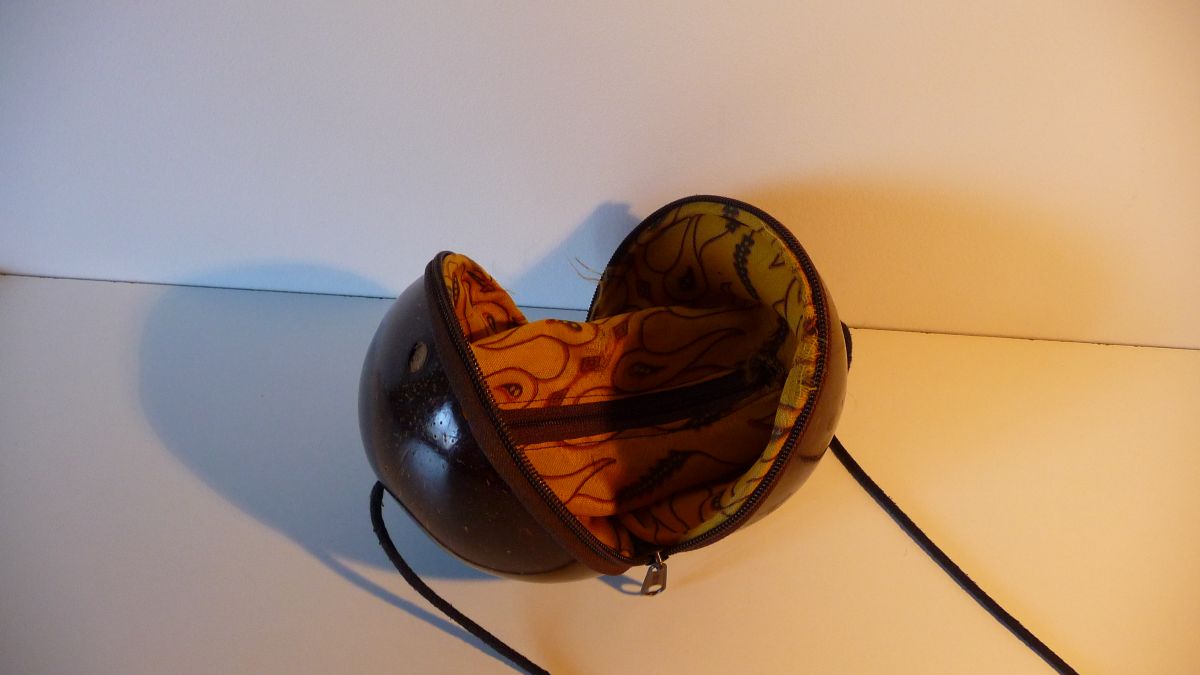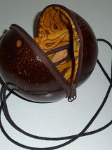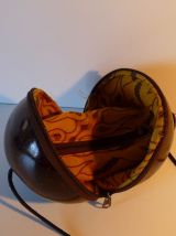 Petit sac à main vintage, fait dans une noix de coco polie et vernie. La noix de coco est coupée en 2, les 2 parties se ferment par une fermeture éclair. L'intérieur est en tissu avec une fermeture éclair.