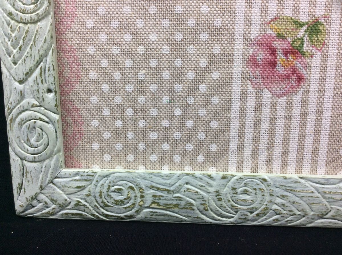 Fond en tissu : imprimé motif roses, rayures petits pois et liseret dentelle
