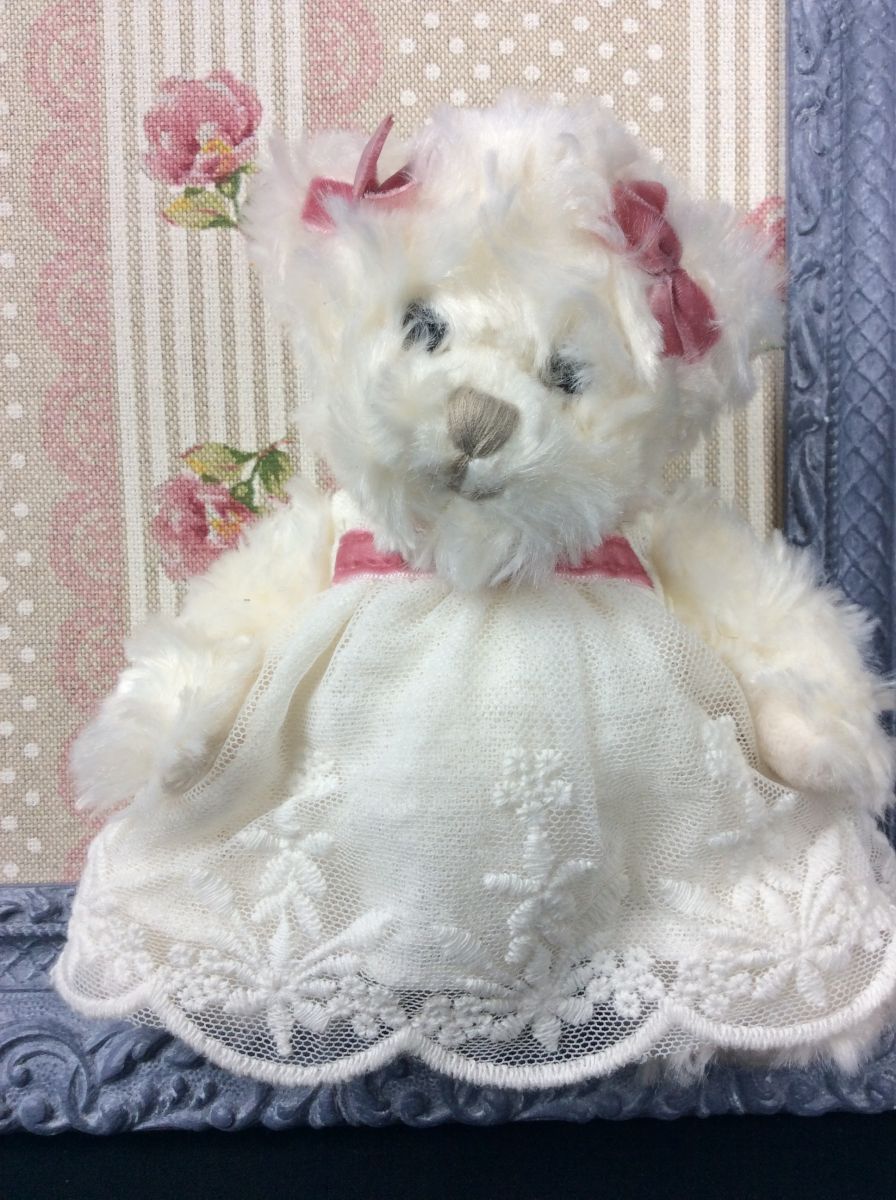 Petite ourse avec robe blanche dentelle et petits noeuds rose, assise sur l'encadrement
