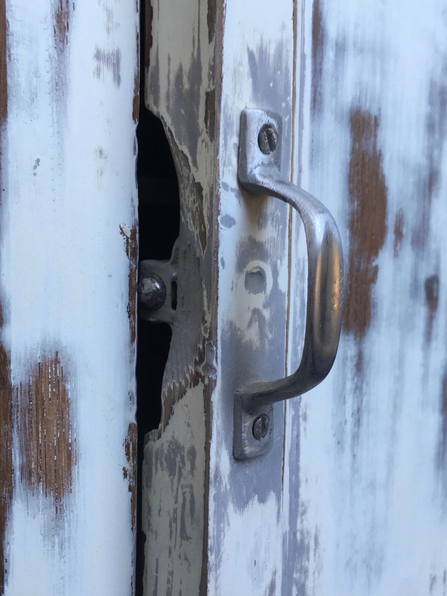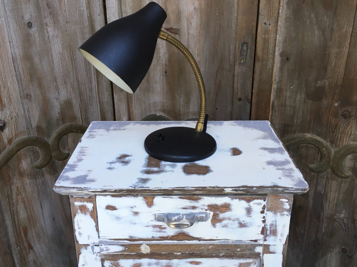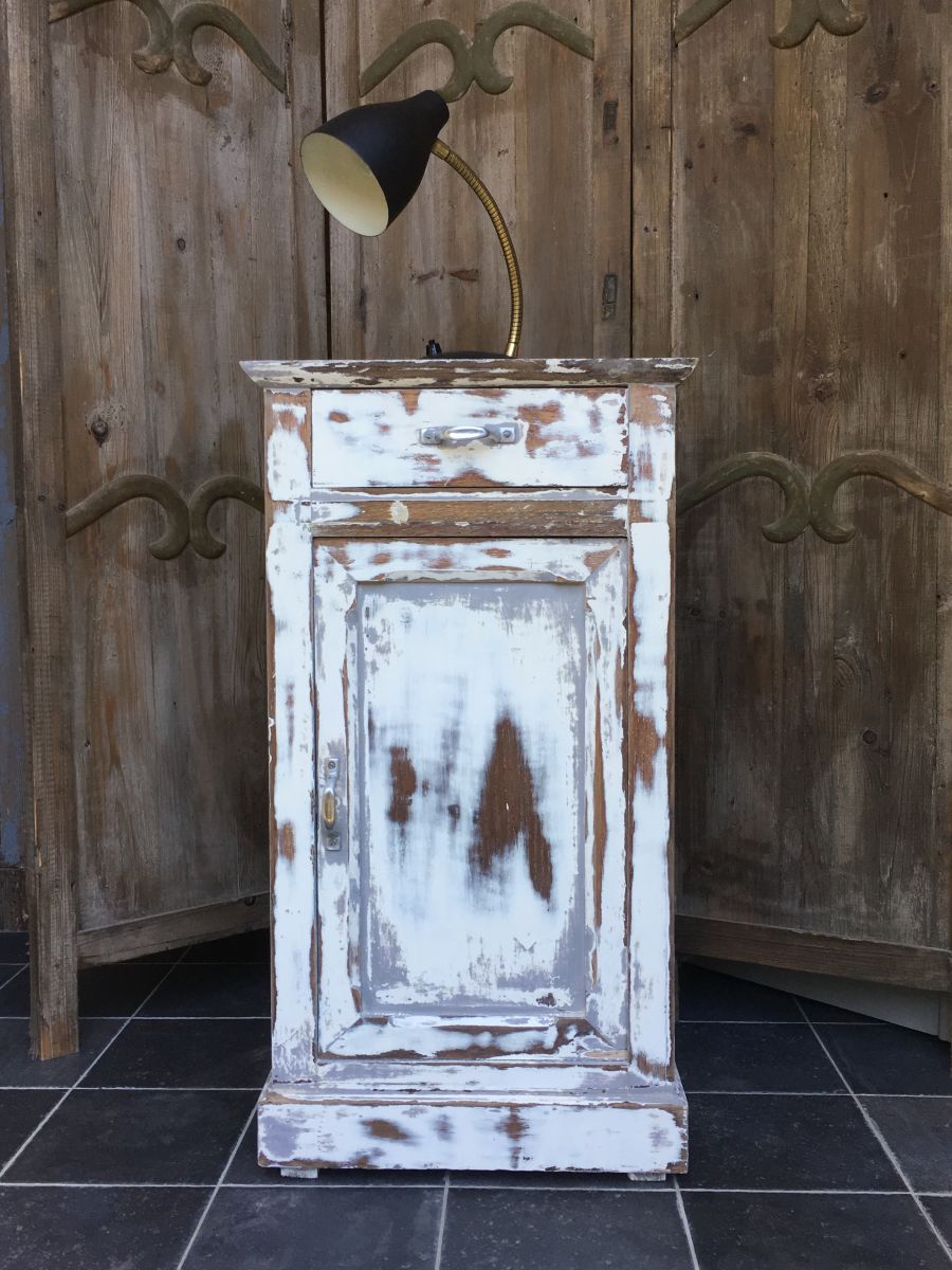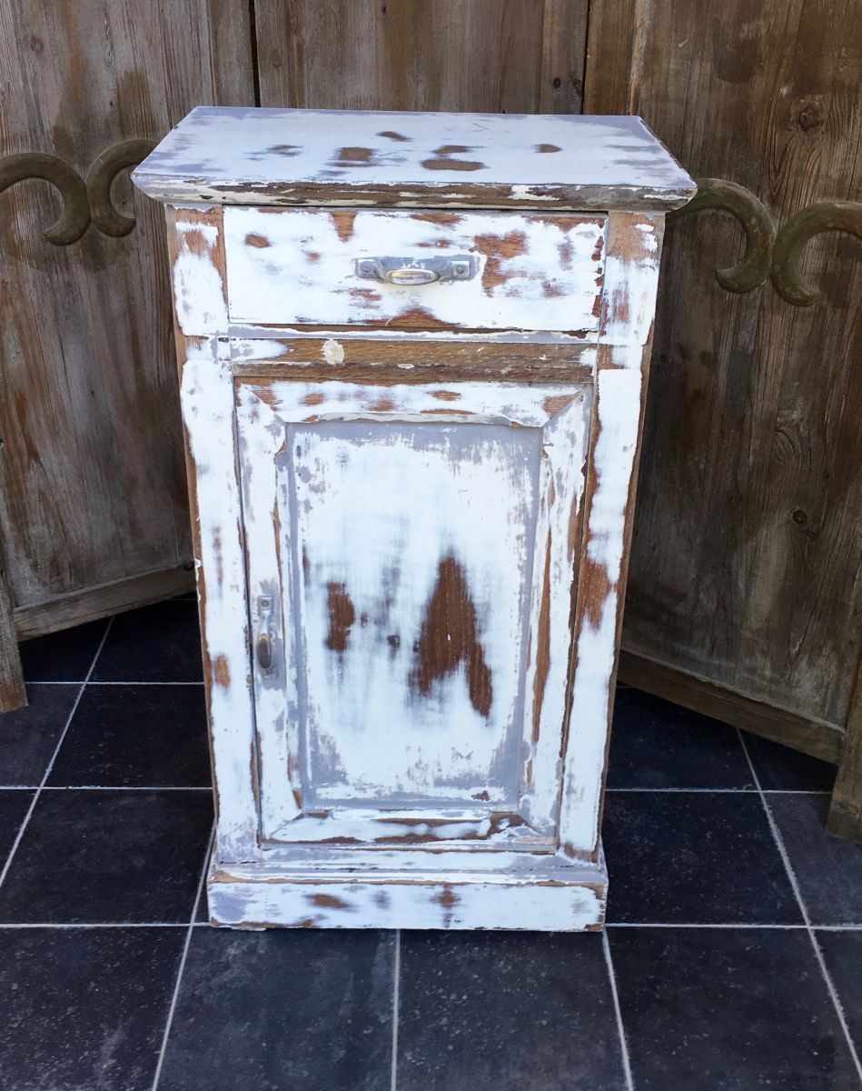 Cette ravissante table de chevet a subi plusieurs couches de peinture au fil des utilisations. Nous avons choisi de la poncer légèrement pour lui donner ce côté shabby entre bois brut, peintures grise et blanche. Des traces de passage d'insectes sont visibles mais le meuble a subi un traitement complet.