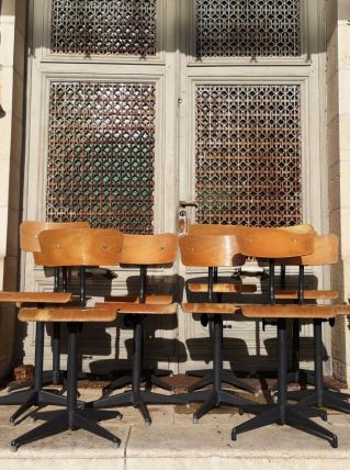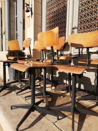 Lot de 4 chaises vintage de laboratoire, d'atelier, d’architecte ou de meuble de métier datant des années 50’-60’. Les chaises disposent d’un pied en métal à 4 branches, ainsi que d’assises et de dossiers en bois. Les assises sont réglables en hauteur, pivotent à 360° et les dossiers sont inclinables.