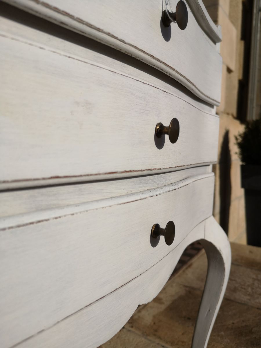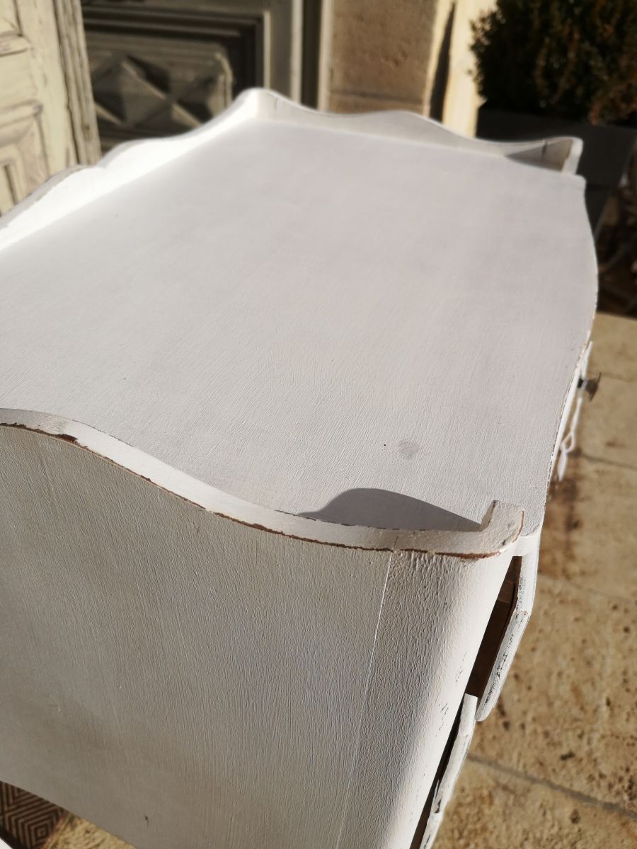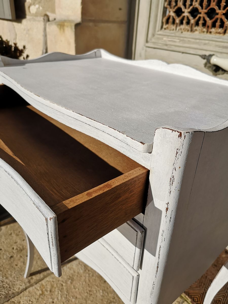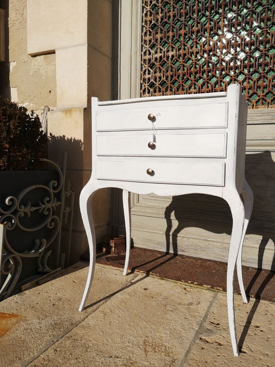 Meuble chevet à trois tiroirs, patine blanche réalisée en atelier.