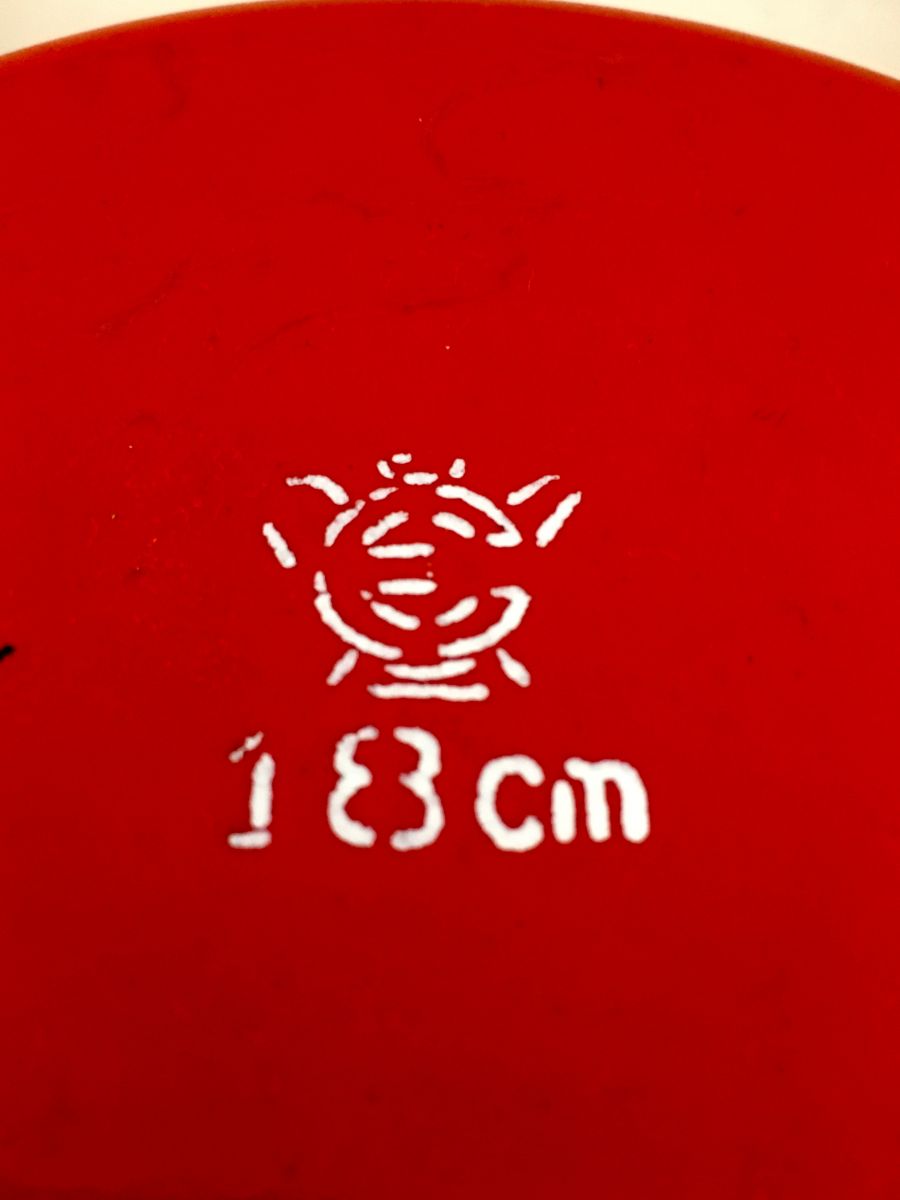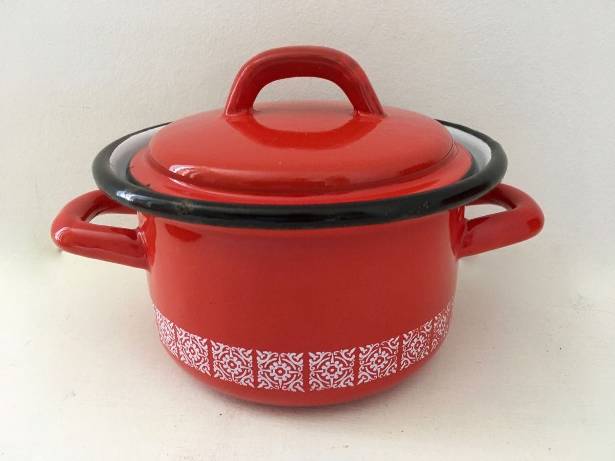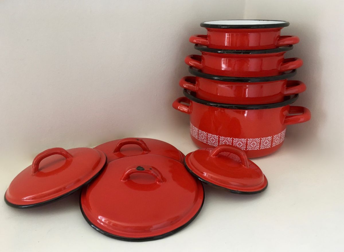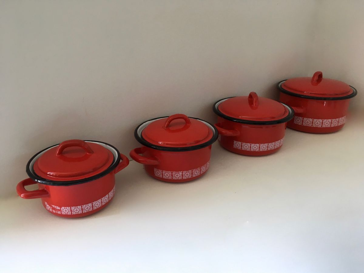 4 cocottes marmites en métal rouge émaillé de la fameuse marque française de quincaillerie JAPY. Les tailles indiqués sur le fond des marmites correspondent aux différents diamètres.