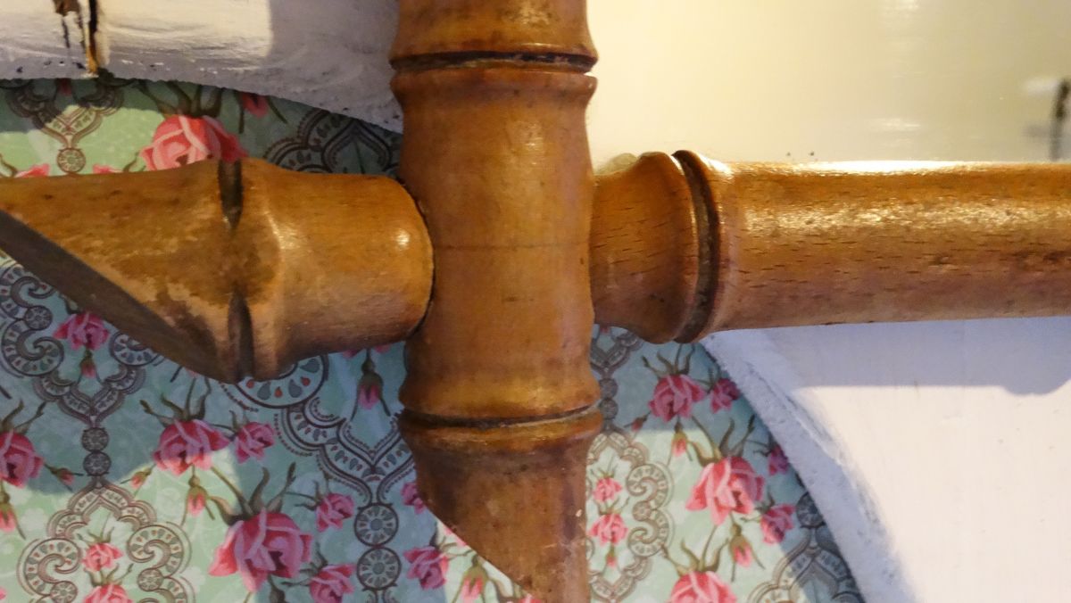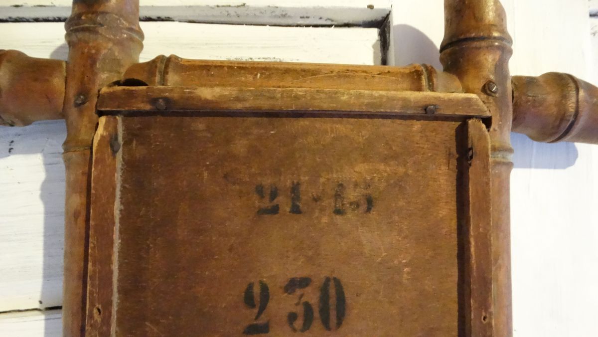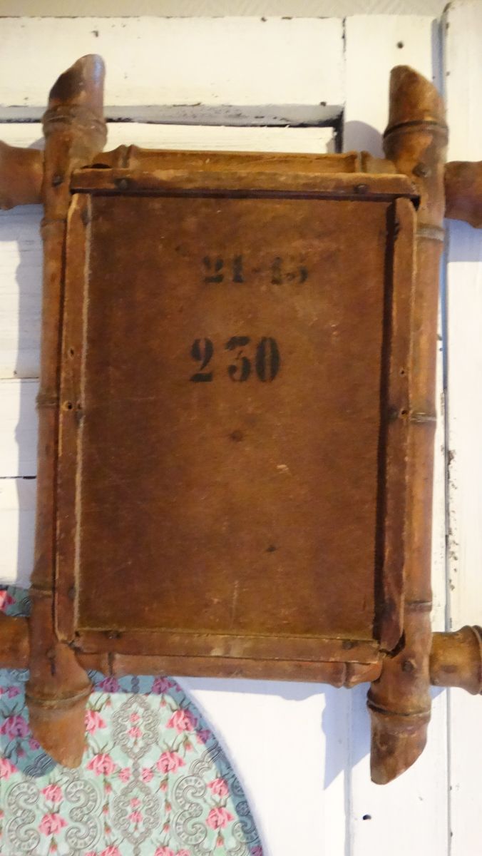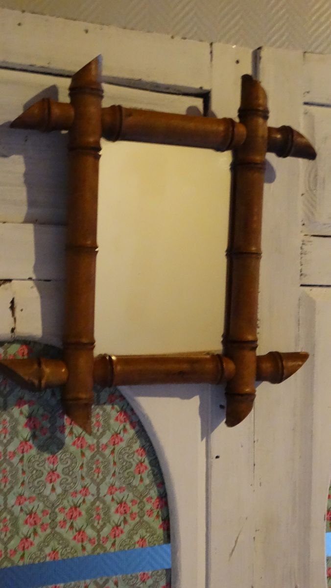 rop mignon petit miroir ancien 1900 en bois imitation bambou, plaque de bois au dos numéroté
