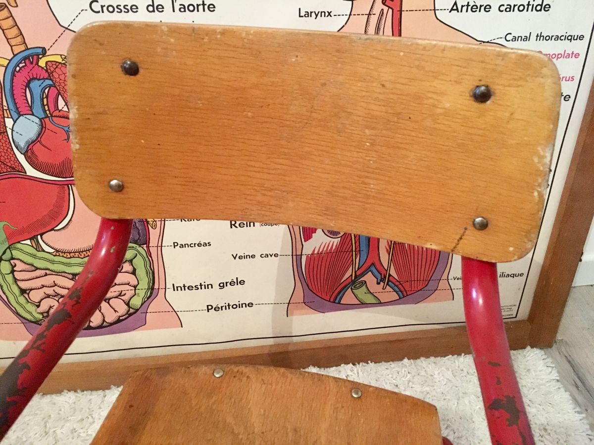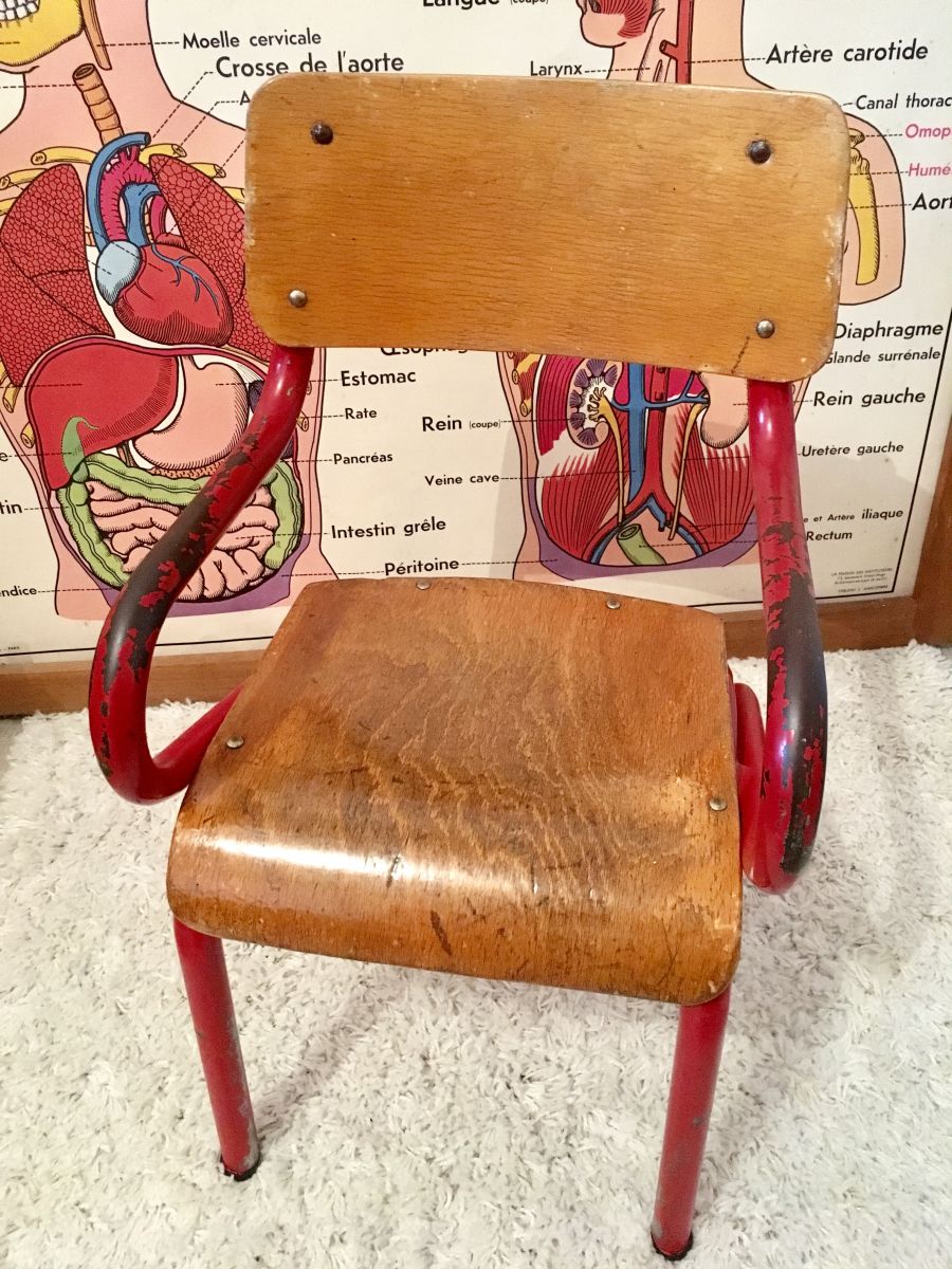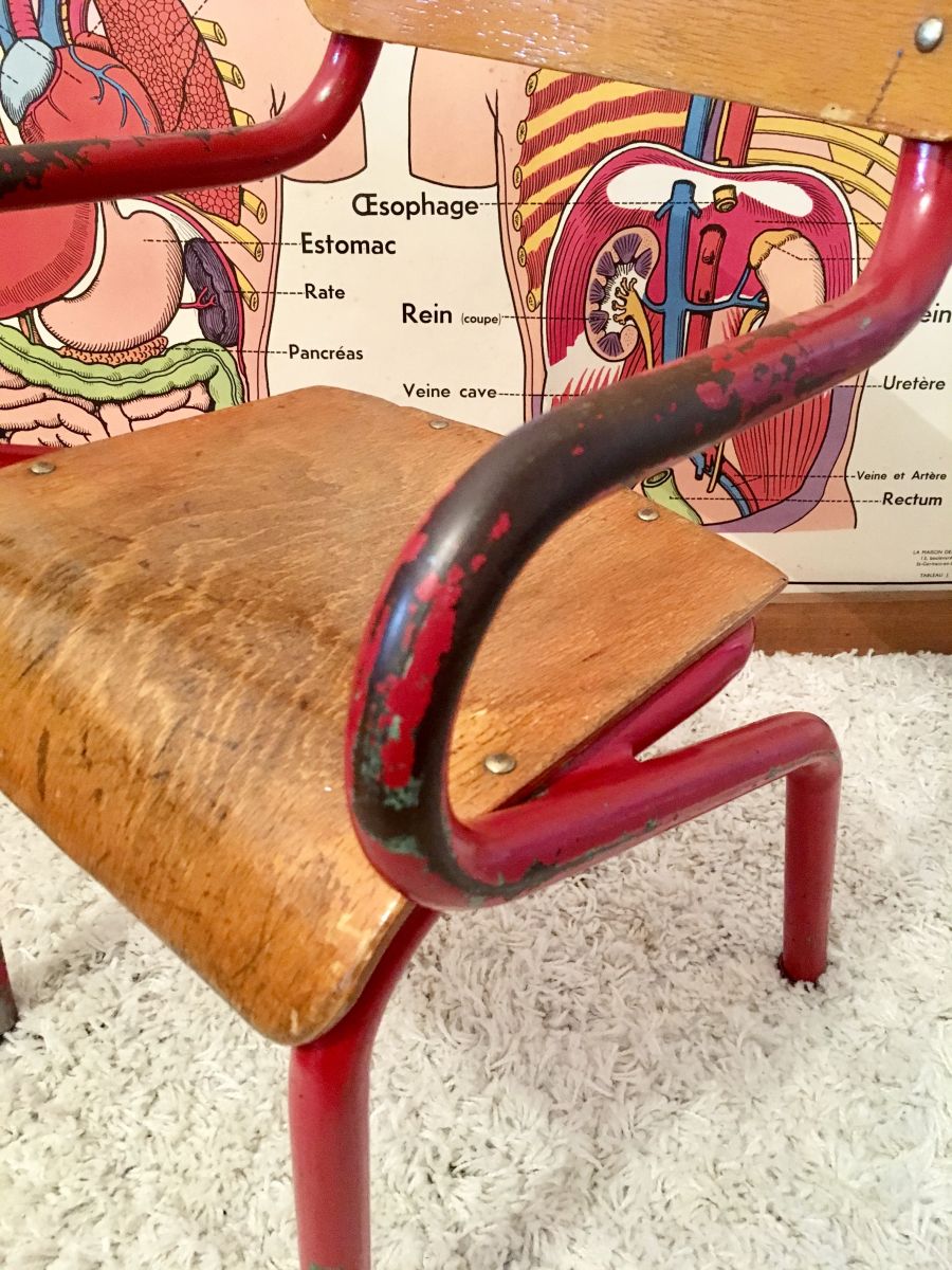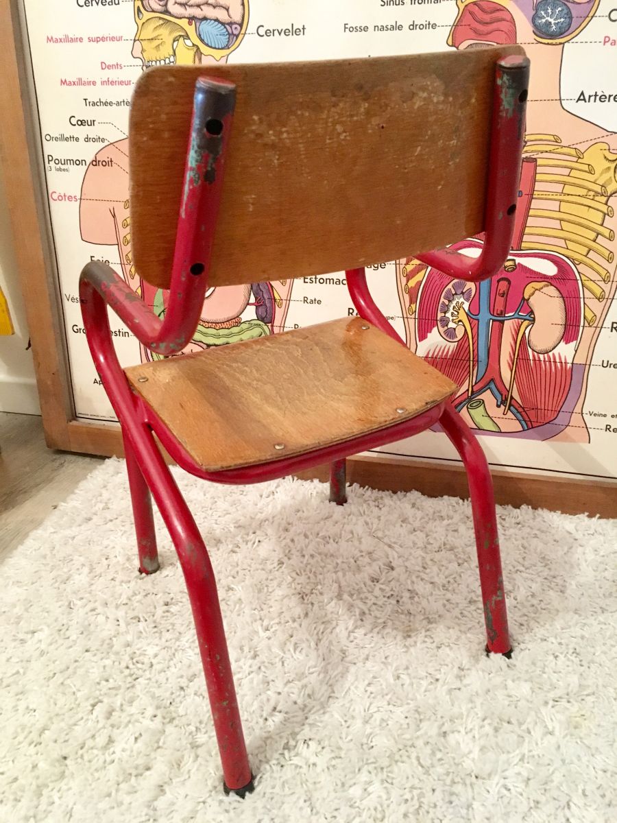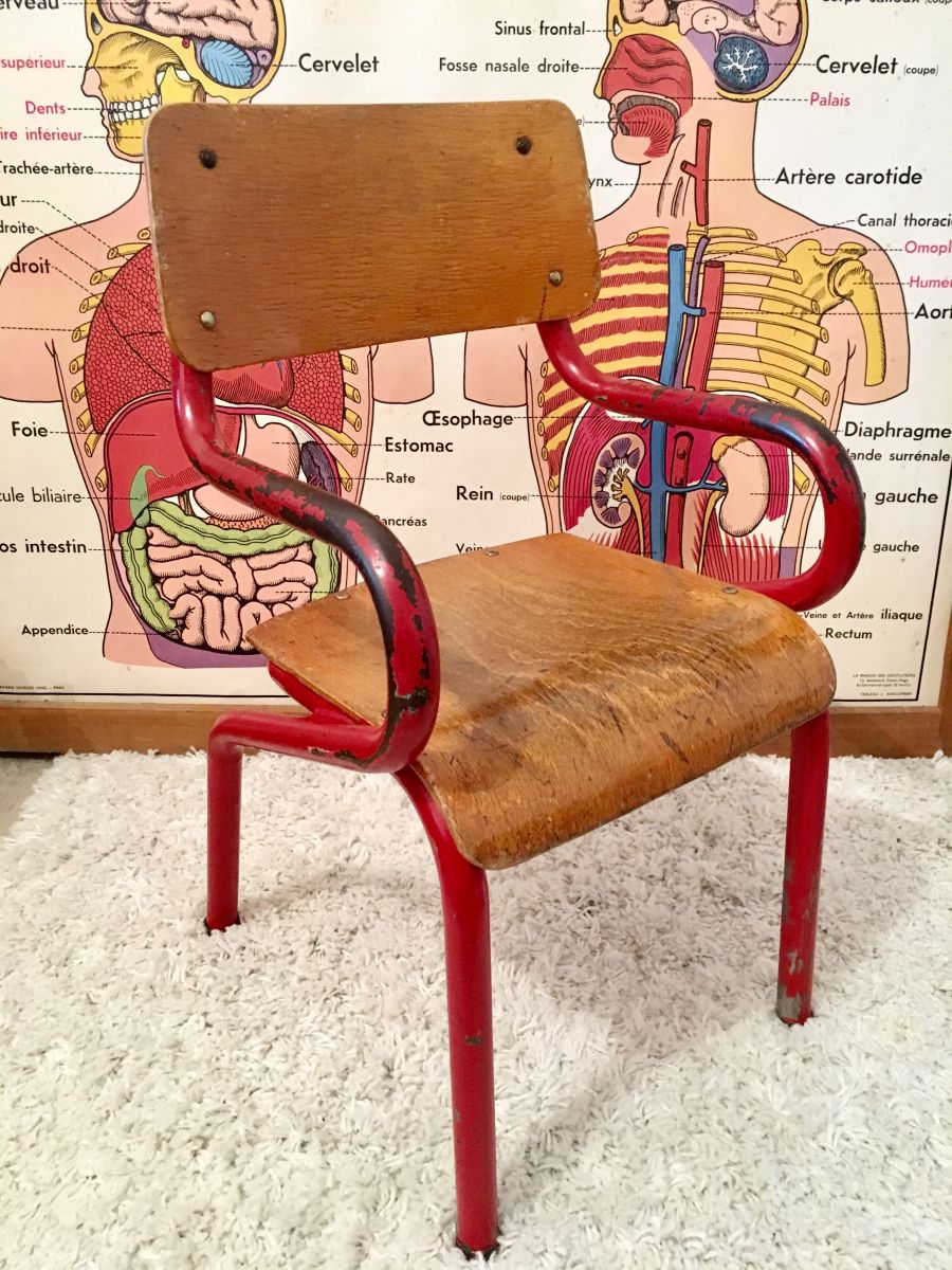 Petite chaise de maternelle des années 50, 60 avec accoudoirs courbés. La peinture rouge présente une jolie patine qui lui confère tout son charme. Stable, robuste et à la fois légère, elle trouvera parfaitement sa place dans la chambre d’un enfant à partir de 12 mois.
