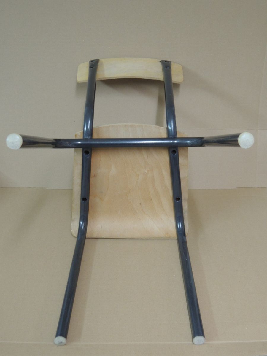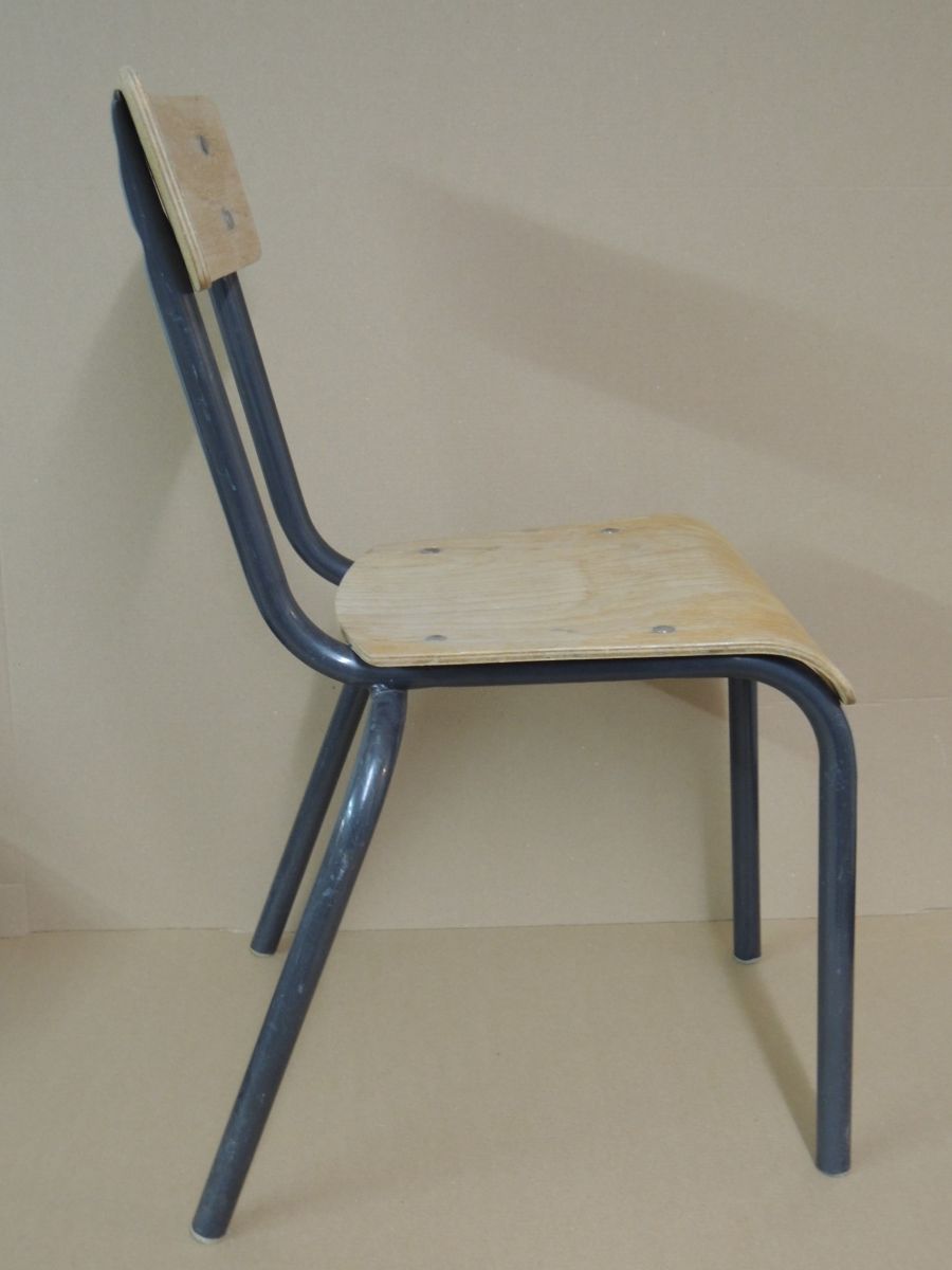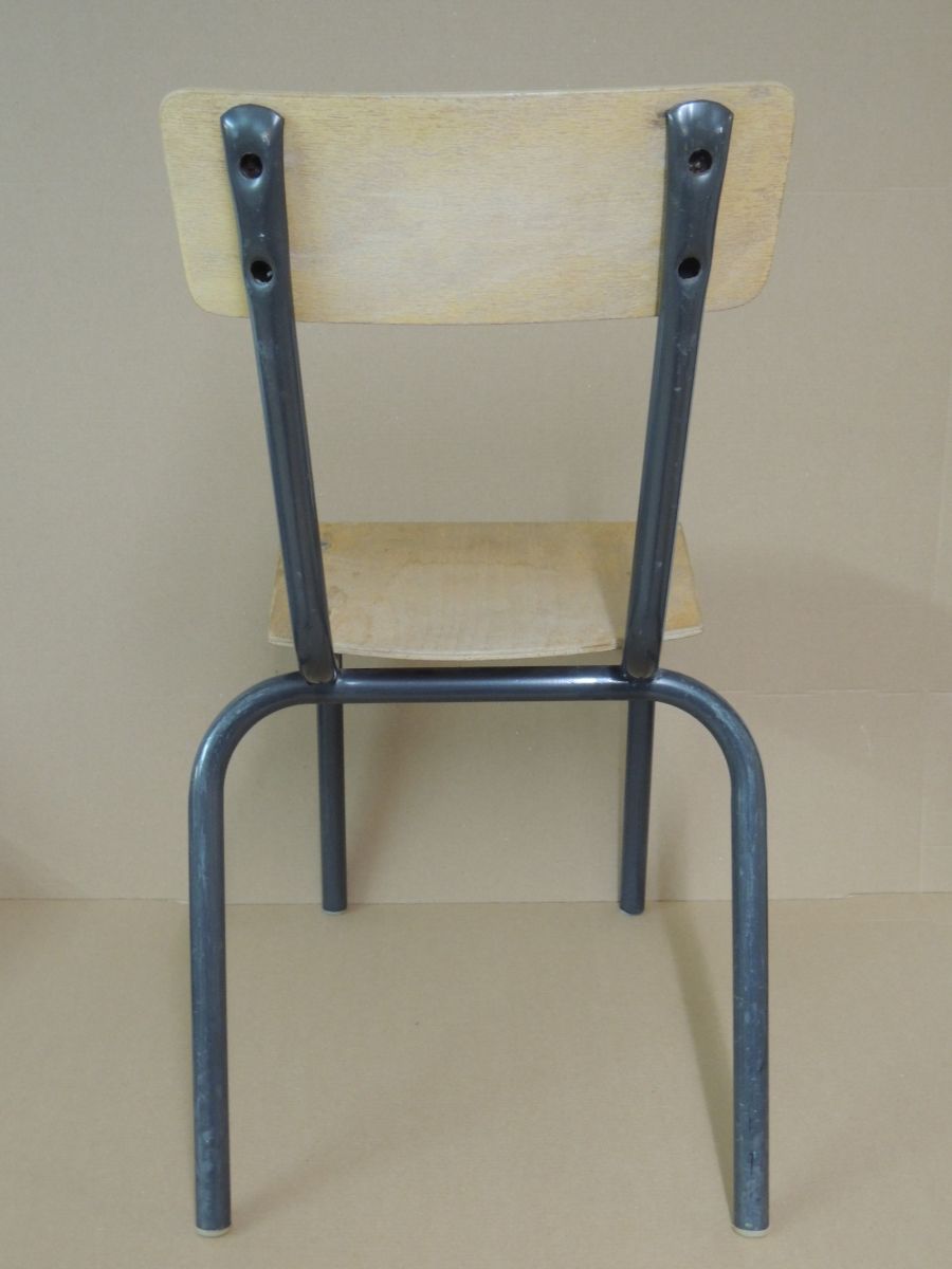 Petite chaise d'école, avec assise à 33 cm, piétement tubulaire gris anthracite, bon état général, trace d'usure normale, vernis passé. Chaise type Mullca miniature. Hauteur dossier 68cm, largeur assise 33 cm, Profondeur totale 38 cm, Poids 2.5 kg