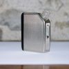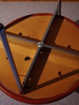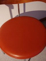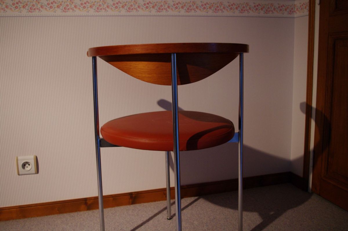 Assise en cuir, dossier en bois de teck, piétement chromé.