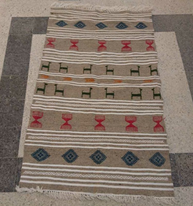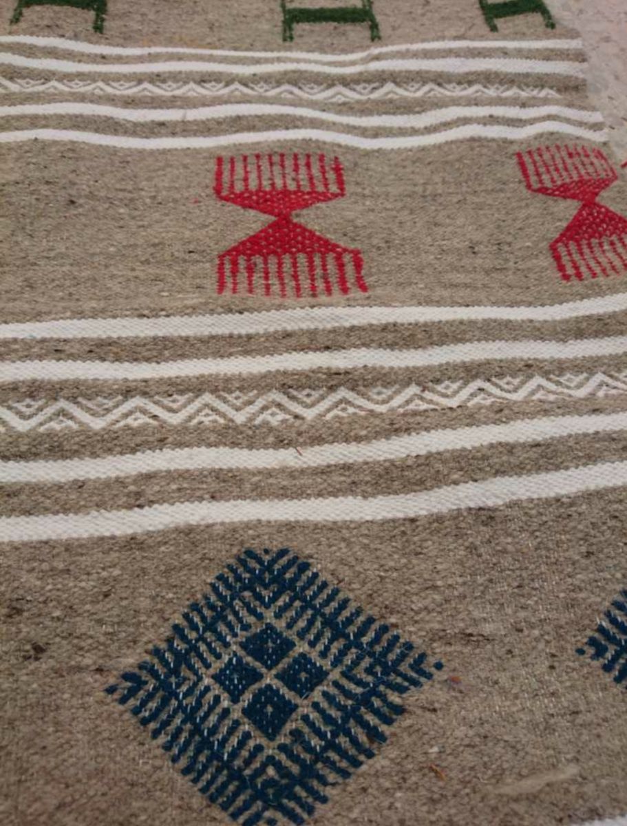 Matière: laine. Longueur: 187cm. Largeur: 115cm. Tapis tissés à la main en laine de mouton pure. Ils sont ornés de motifs géométriques et abstraits dans une association chromatique de moutarde rouge, bleue et jaune. Tous nos kilims proviennent de différentes régions de Tunisie.