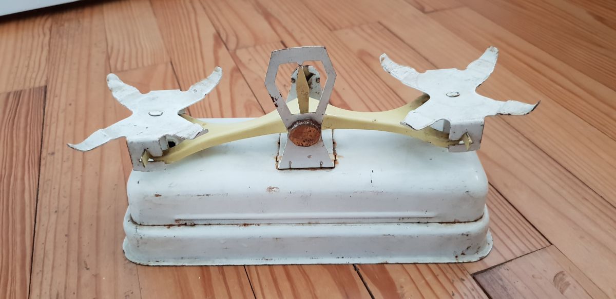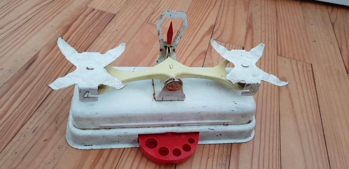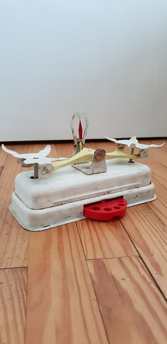 Balance de marchande vintage, en métal et plastique, manque quelques éléments.