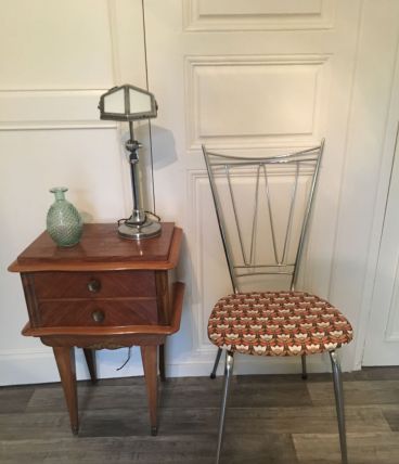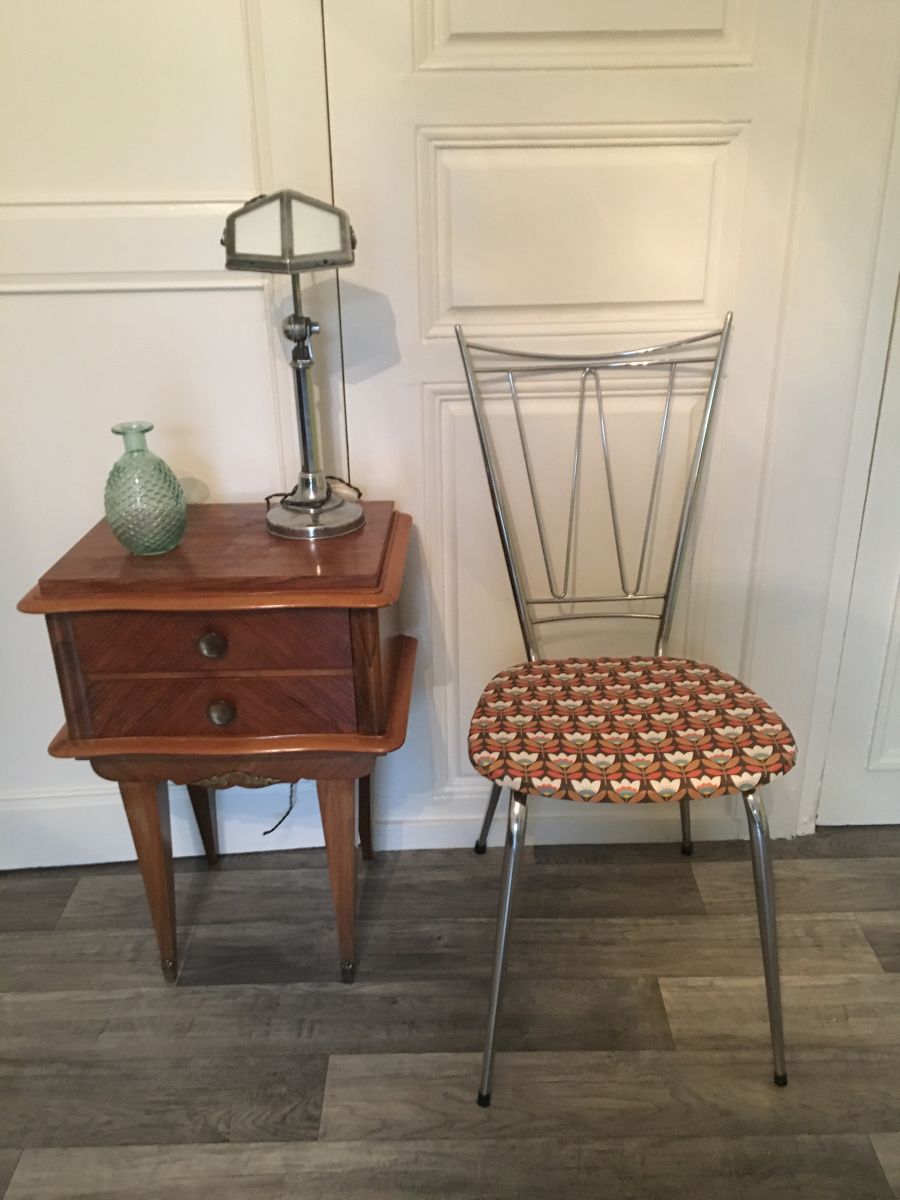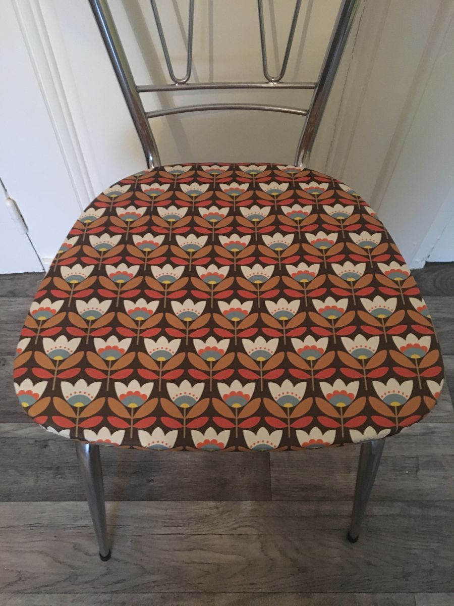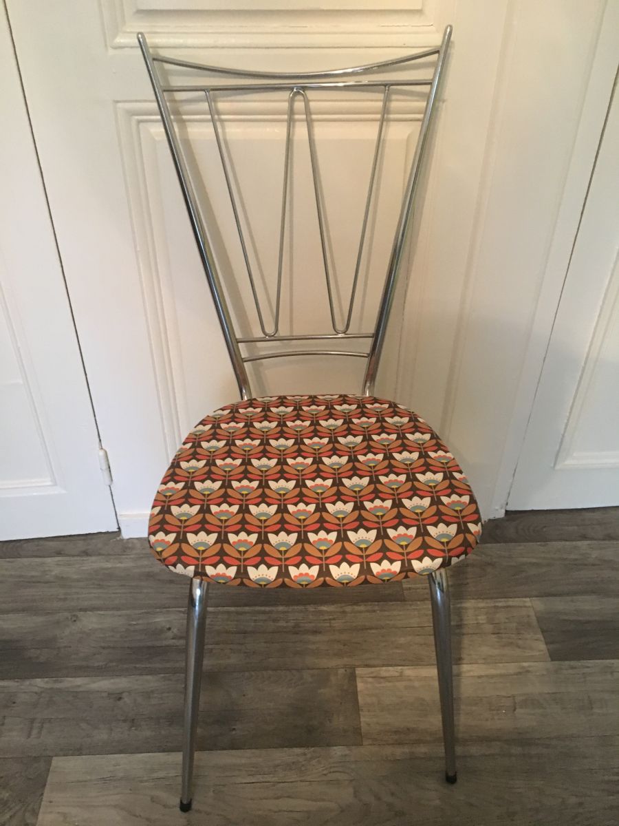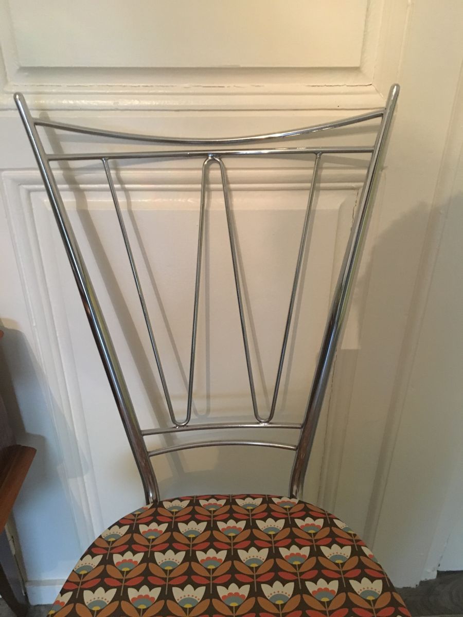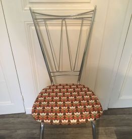 Chaise chromée année 70 tapissée par mes soins avec du tissus simili cuir vintage donc très facile à nettoyer