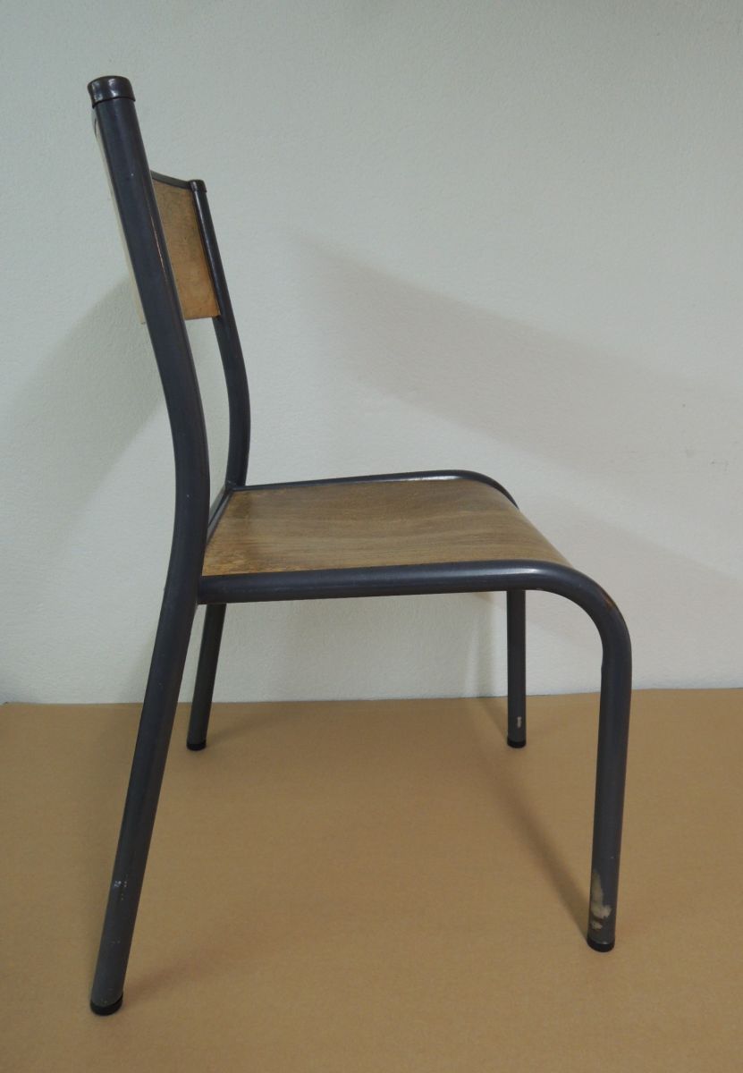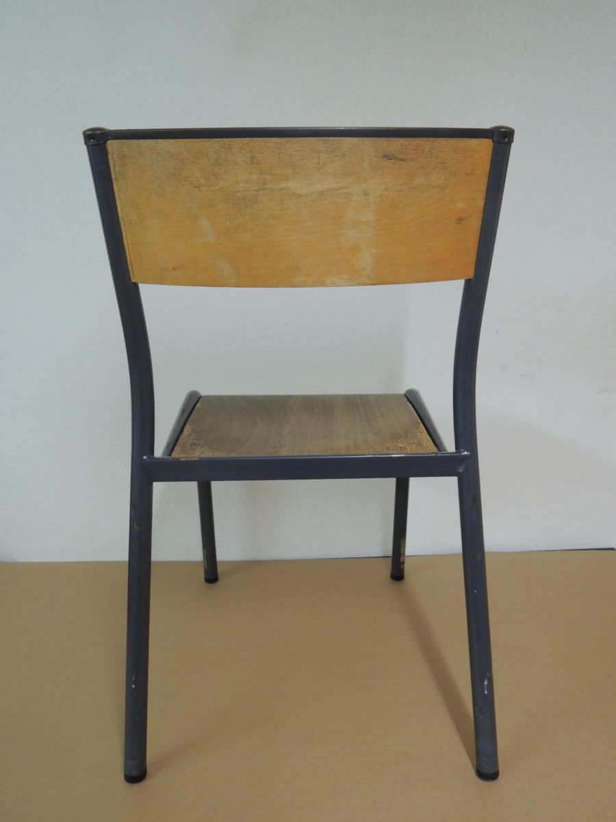 Chaise d'école primaire, Mullca 510, pour enfant, assise à 37 cm, traces d'usure normale sur peinture gris anthracite, assise et dossier bois patinés, embouts de pieds neufs. hauteur assise 37 cm. Hauteur69xLargeur38xProfondeur46 cm, poids 3.5kg. 2 chaises disponibles, prix indiqué par chaise
