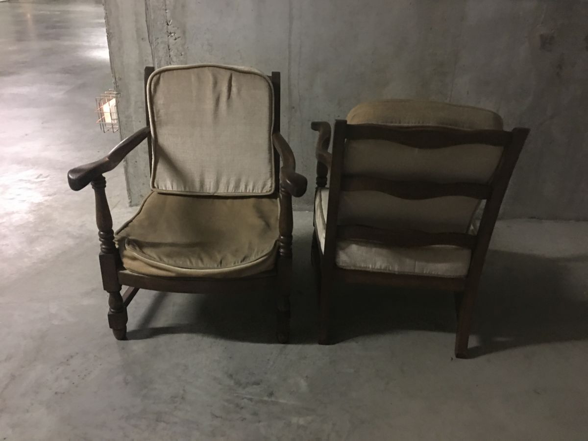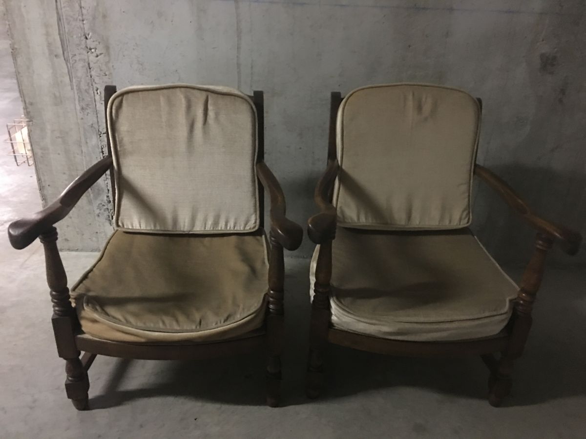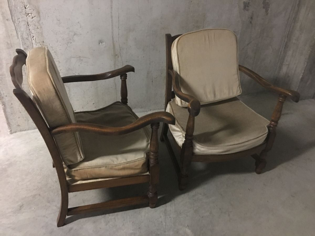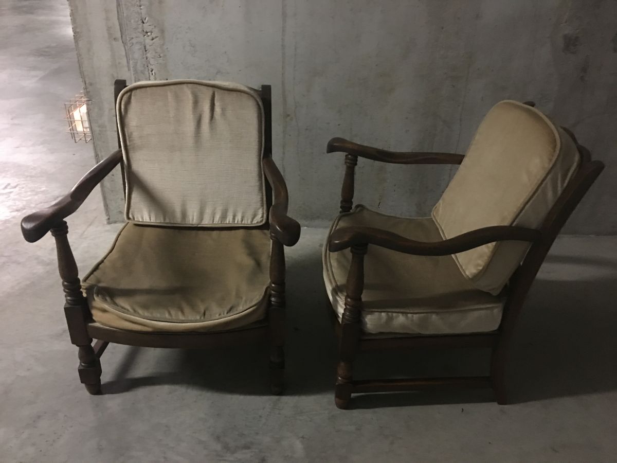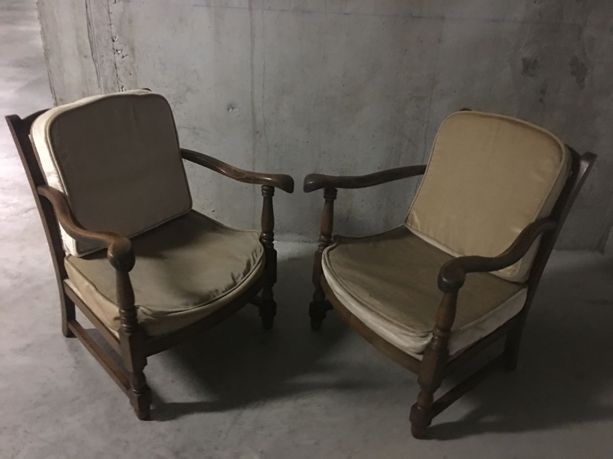 Paire de fauteuils bohèmes en bois massif, coussins en velours beige, l’un des coussins est un peu affaissé et serait à regarnir, hauteur totale 76cm, hauteur assise 32cm, assise 51x41cm, dimensions totales (cm) : L.65xH.76xP.60, bon état.