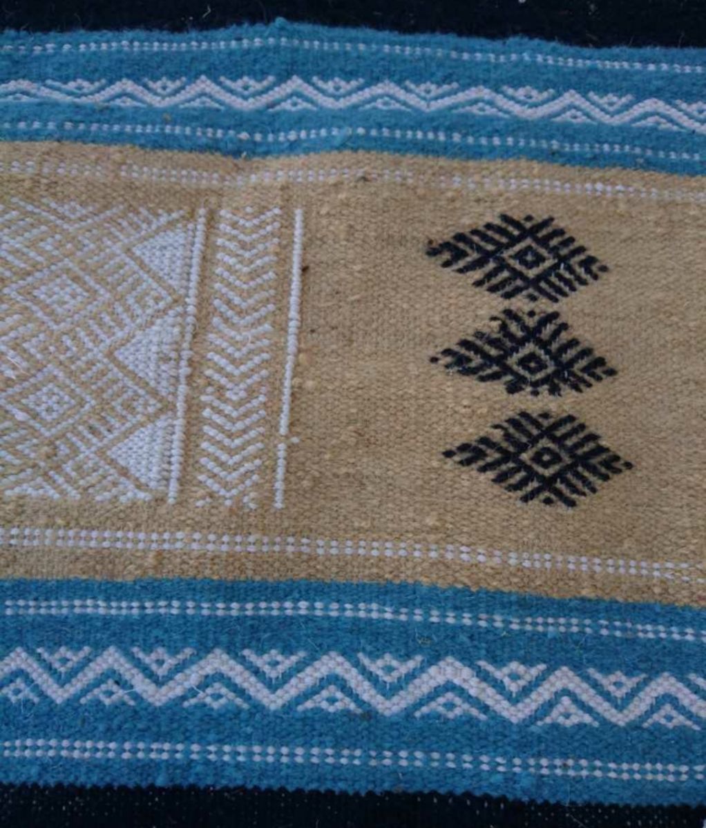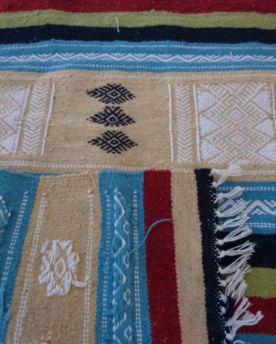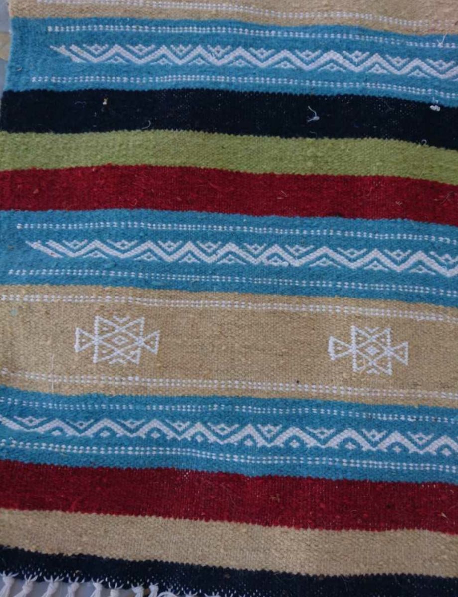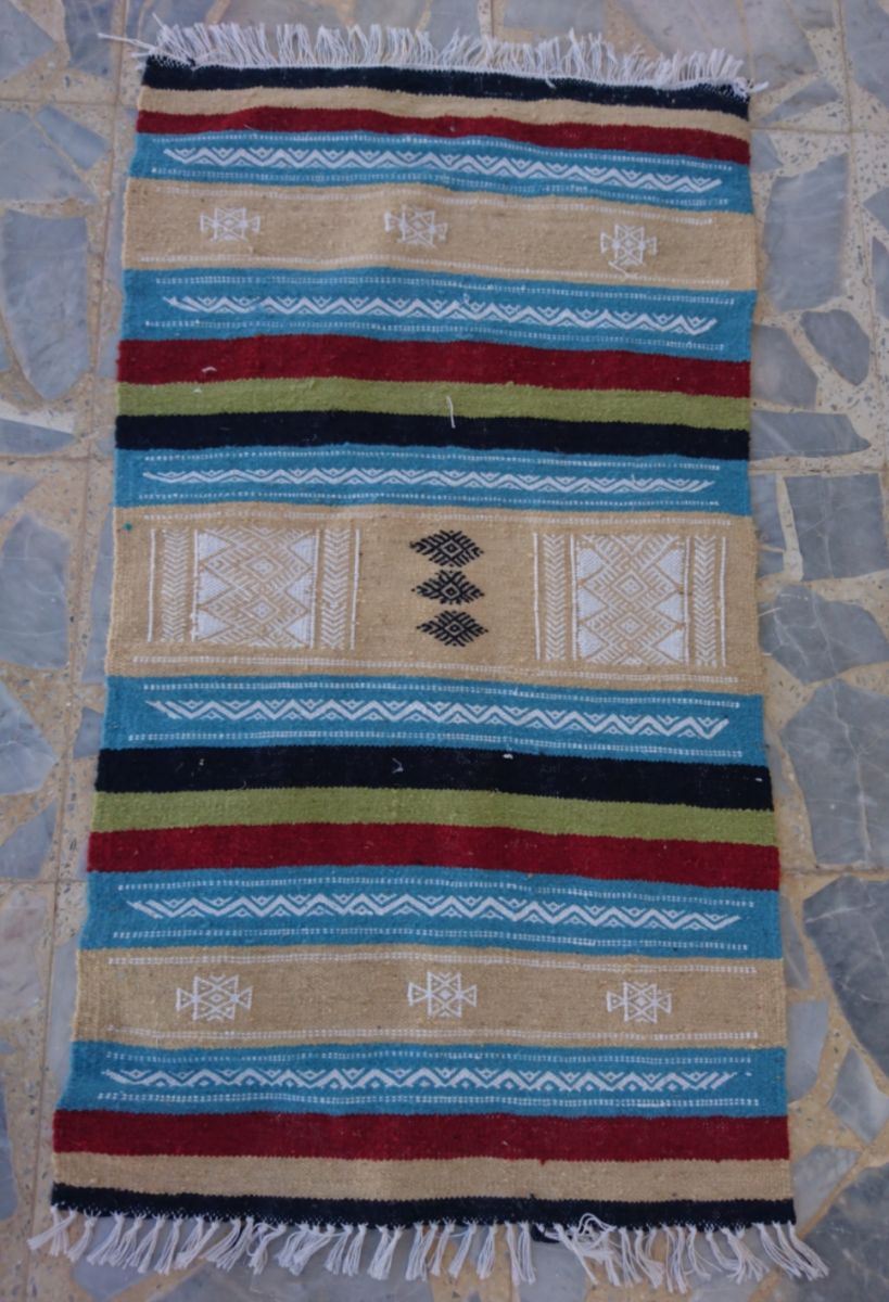 Description: matière: laine . Longueur: 115cm. Largeur:60cm. Tapis tissés à la main en laine de mouton pure. Ils sont ornés de motifs géométriques et abstraits dans une association chromatique de moutarde rouge, bleue et jaune. Tous nos kilims proviennent de différentes régions de Tunisie. Ils sont l'œuvre de femmes extraordinaires et talentueuses qui perpétuent un savoir-faire ancestral. À travers leurs métiers, ces artisanes transforment la laine brute en poèmes.