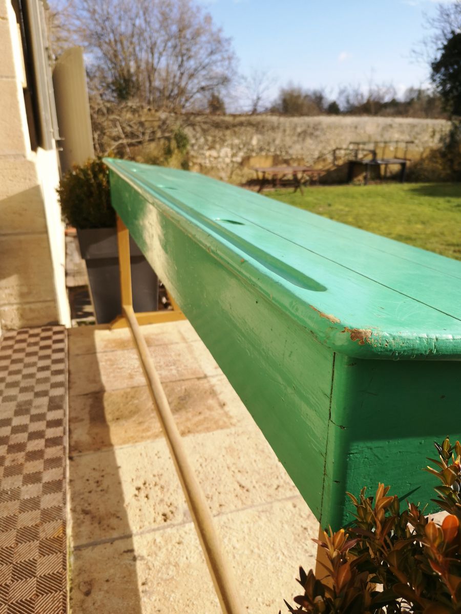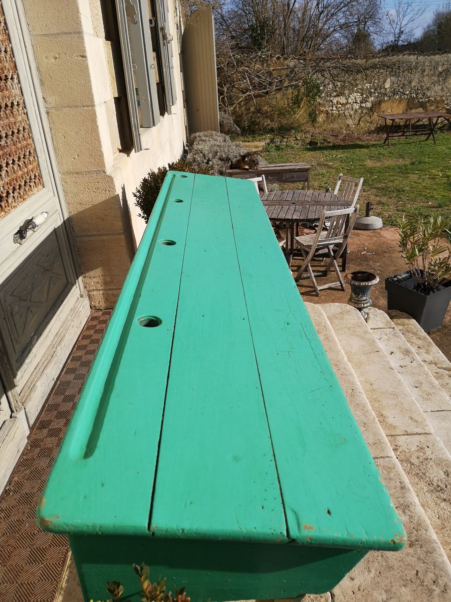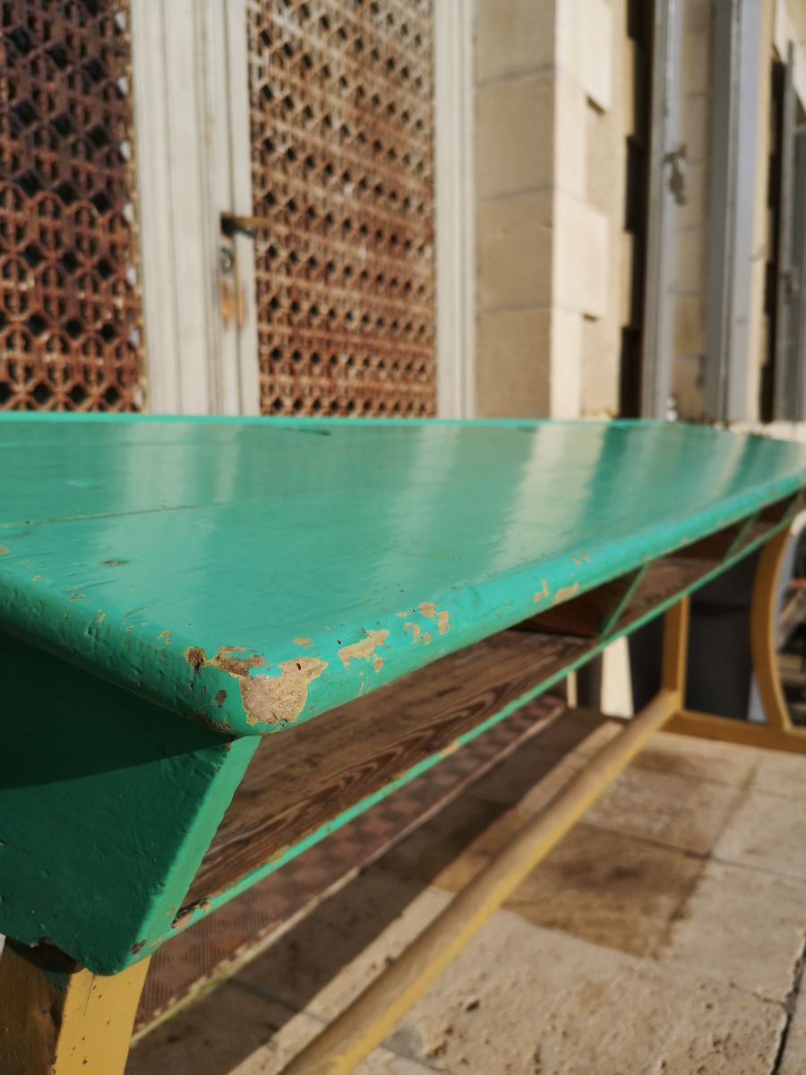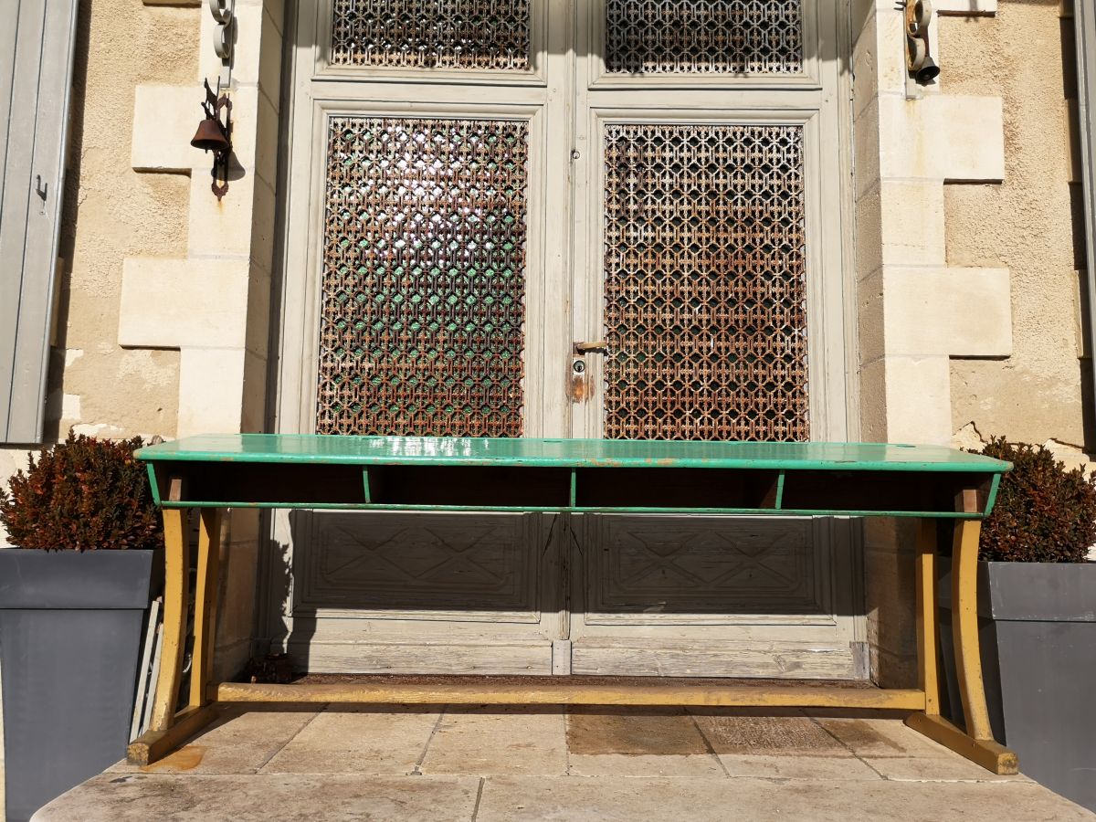 Pupitre d’écolier provenant d’un ancien lycée privé catholique. Rare par ses dimensions, peinture d’origine, dans son jus, non retouché. Le pupitre est légèrement incliné et dispose de 4 casiers et de 4 trous pour les encriers (non fournis).