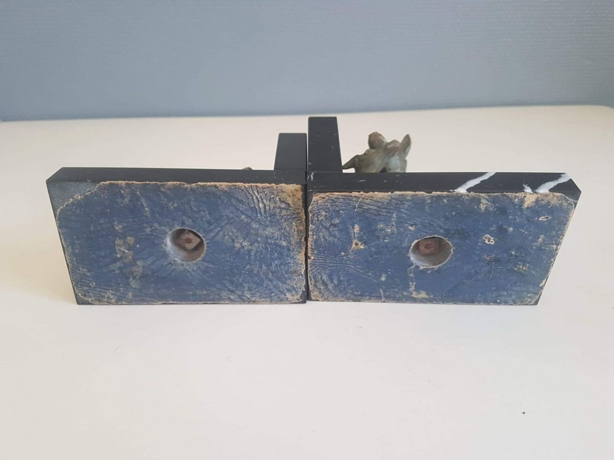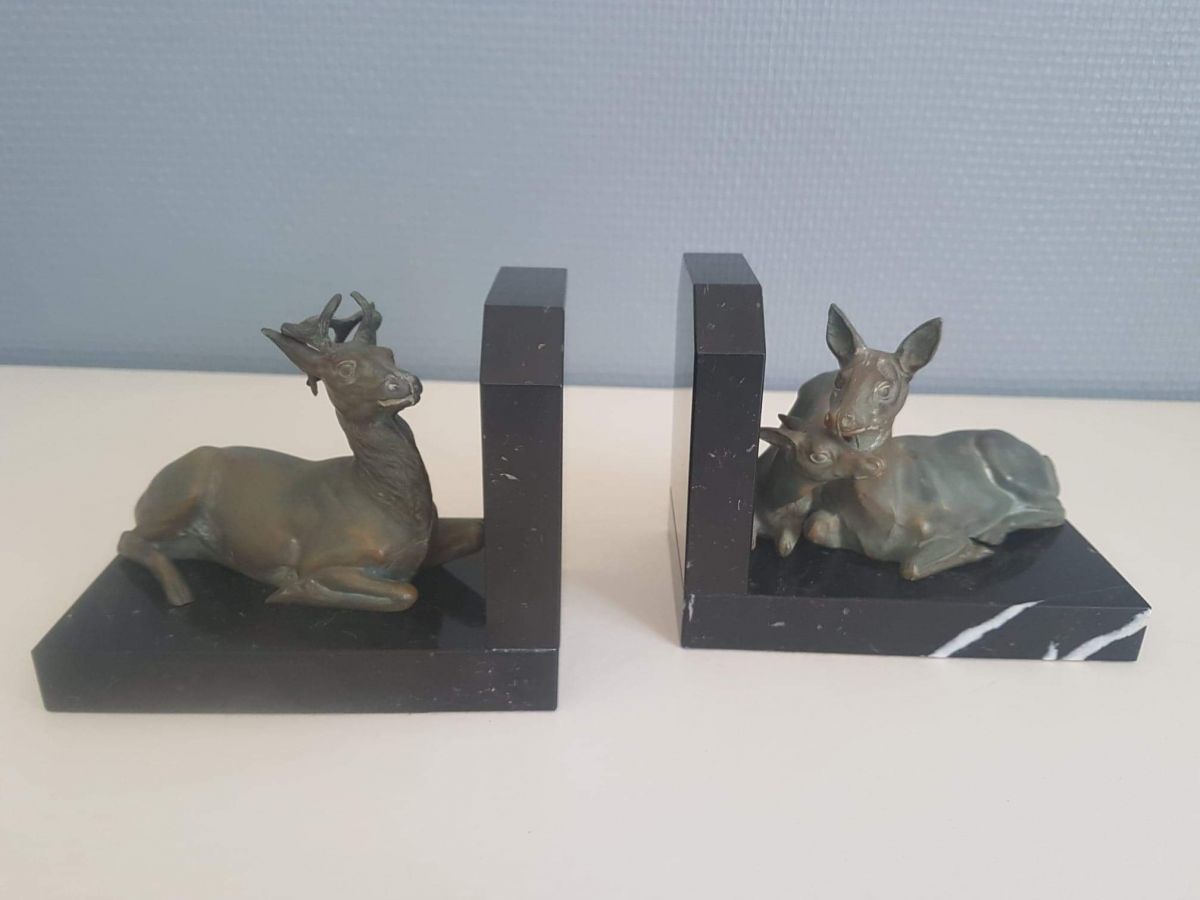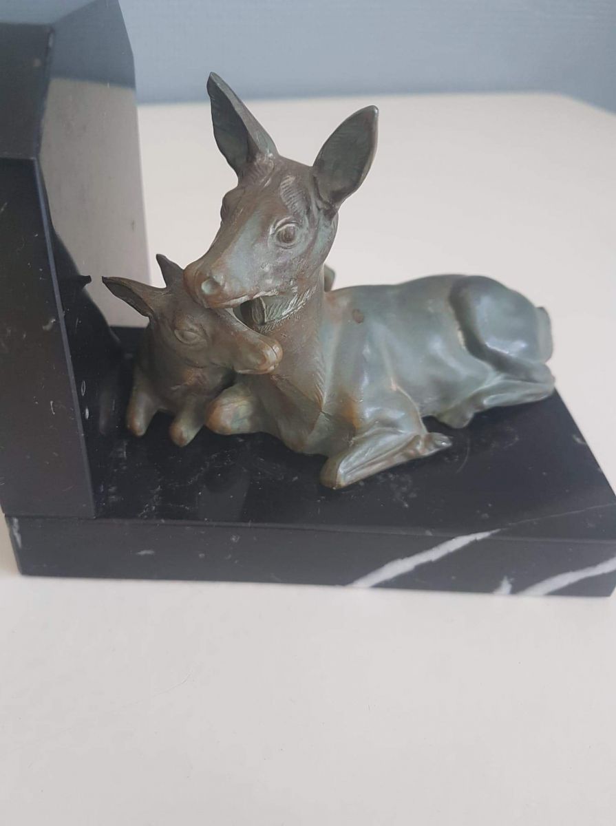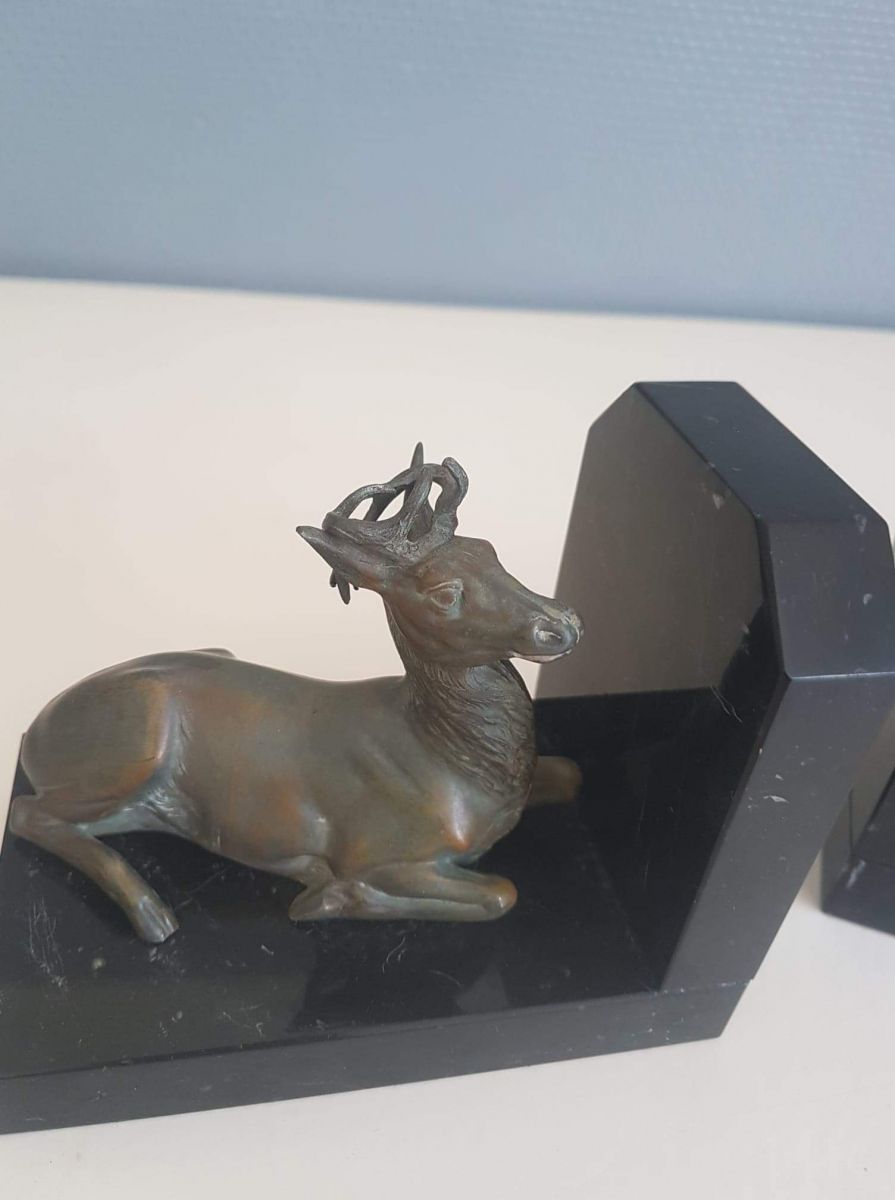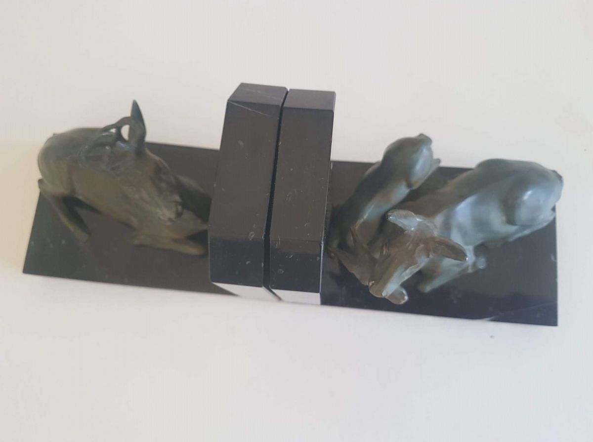 paire de serre livres art déco biche et cerf en régule et support en marbre noir