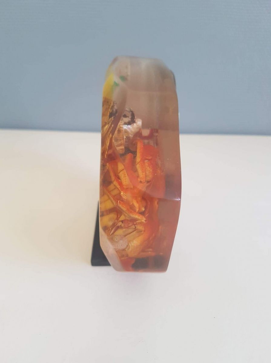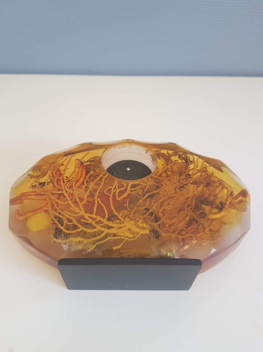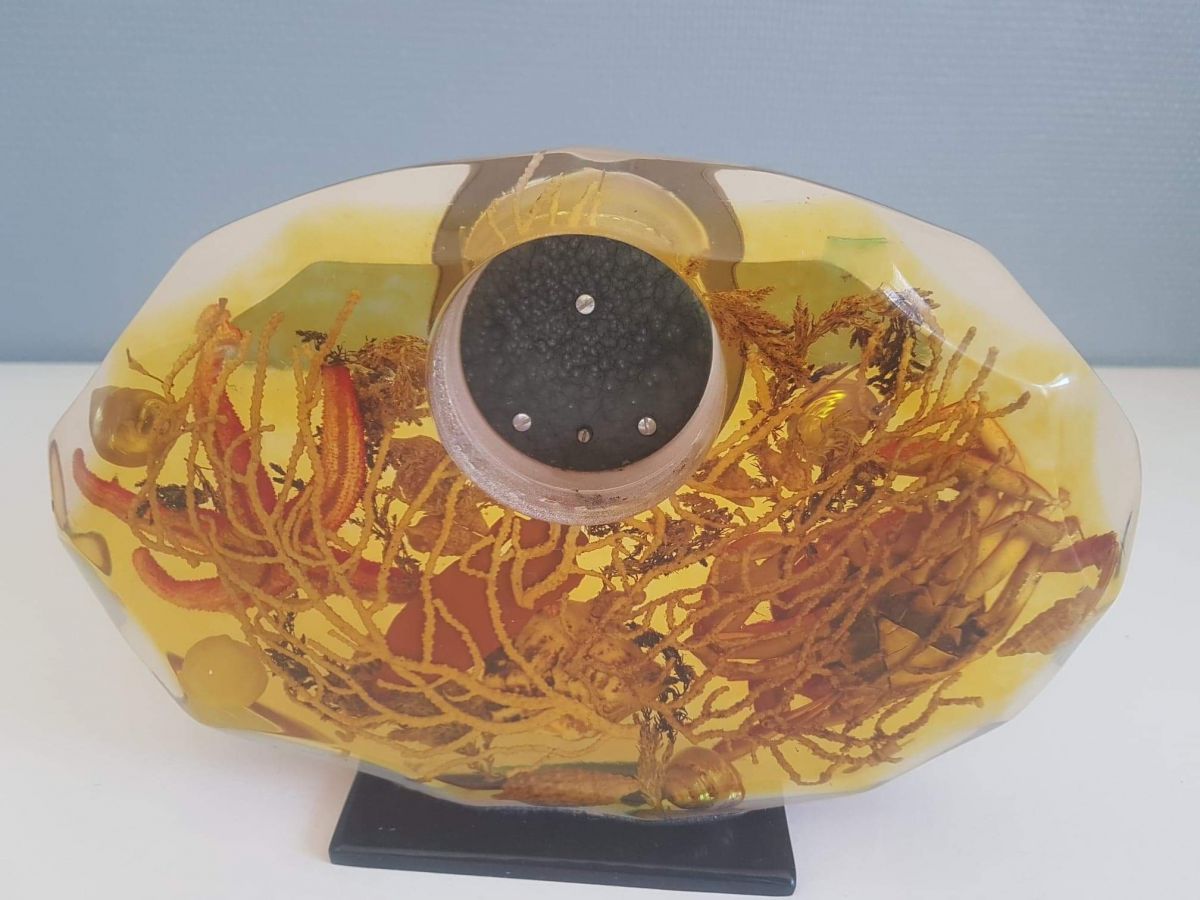 inclusion avec baromètre des années 70 avec crabe et étoile de mer.