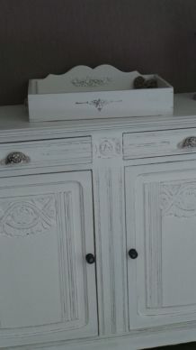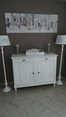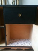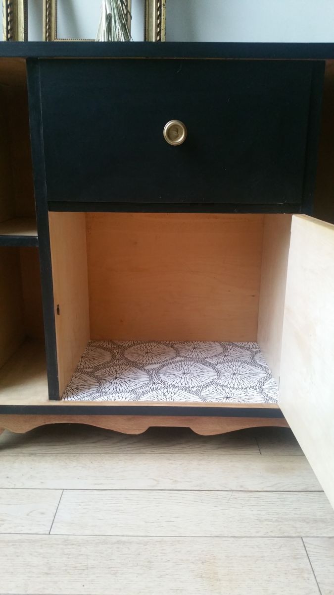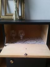 Buffet/enfilade Art déco relooké. Bois ciré et noir. 2 casiers fermés. Celui du haut ouverture à clapet (L45xH23 cm), on peut y ranger des verres, des assiettes, des couverts. Celui du bas (L45xH38 cm) pour y ranger assiettes, plats, bouteilles... 4 casiers ouverts - haut : L14xH29; bas : 14x31. Les 2 parties fermées ont été tapissées d'un joli papier peint pour plus de caractère. Ce meuble trouvera idéalement sa place dans un salon, une salle à manger, une cuisine, une entrée ou une salle de bains.