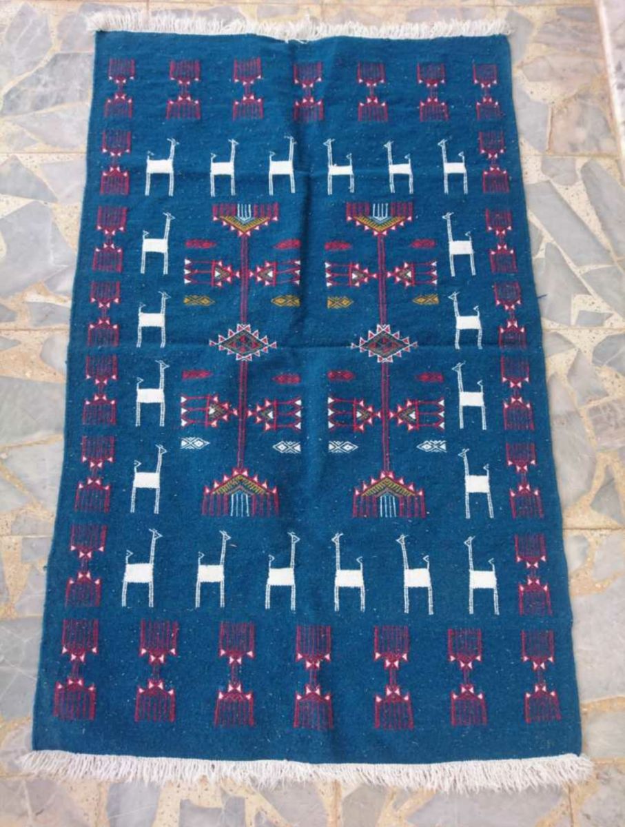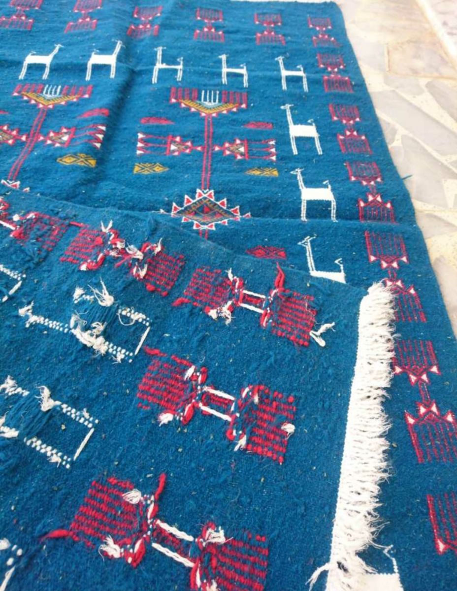 Description: matière: laine . Longueur: 150cm. Largeur:95cm. Tapis tissés à la main en laine de mouton pure. Ils sont ornés de motifs géométriques et abstraits dans une association chromatique de moutarde rouge, bleue et jaune. Tous nos kilims proviennent de différentes régions de Tunisie. Ils sont l'œuvre de femmes extraordinaires et talentueuses qui perpétuent un savoir-faire ancestral. À travers leurs métiers, ces artisanes transforment la laine brute en poèmes.