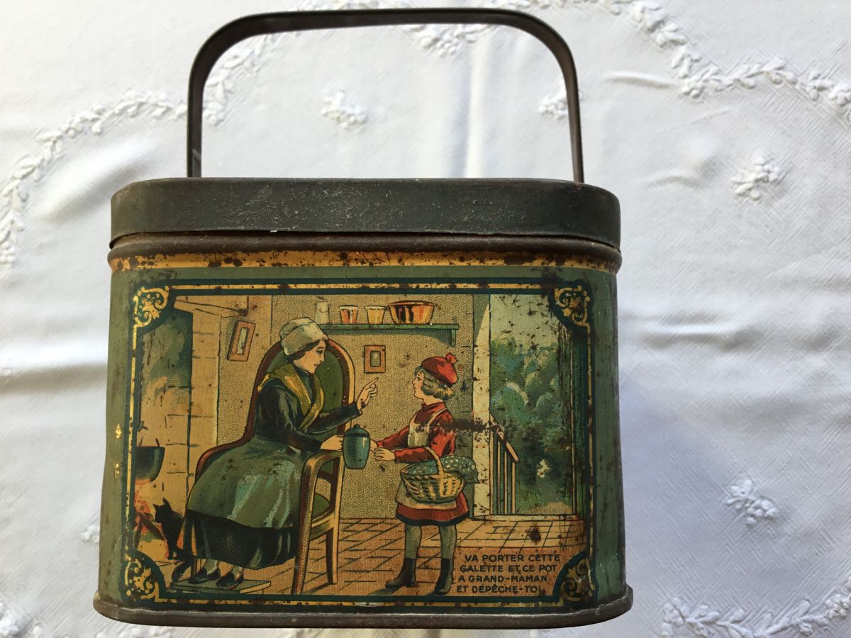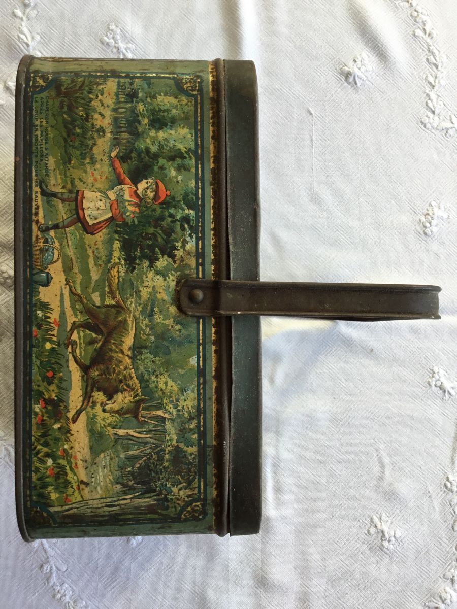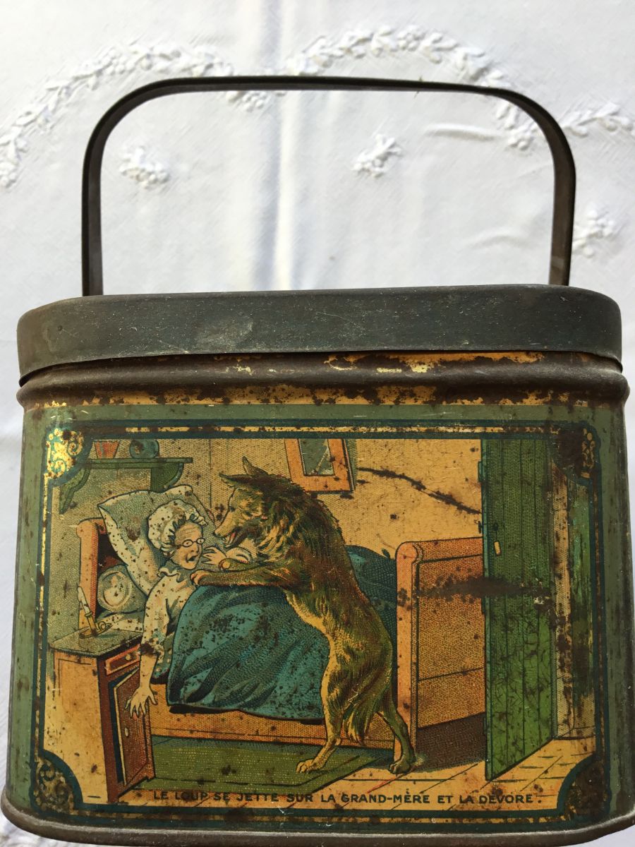 Toute l’histoire du petit chaperon rouge sur une boîte à biscuits forme panier du début du vingtième siècle.