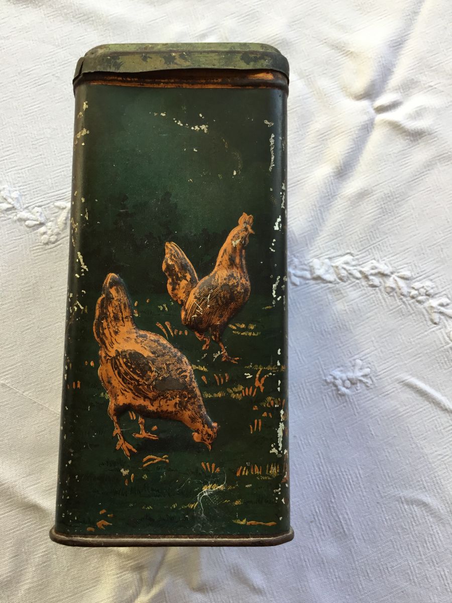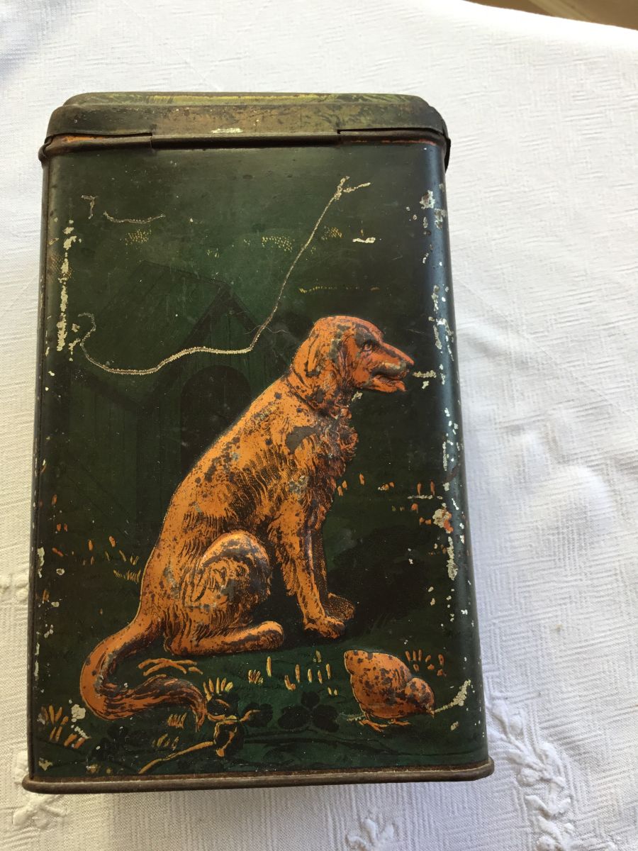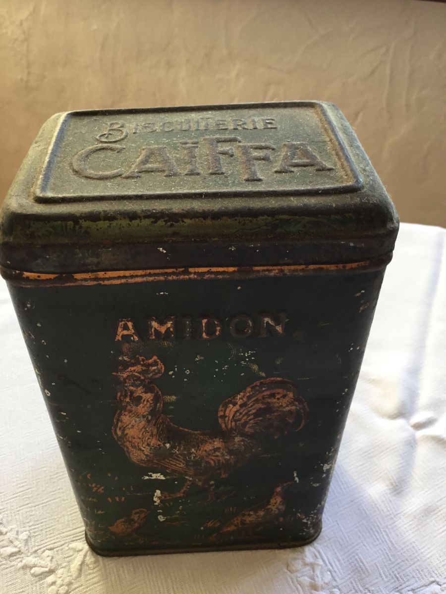 Très ancienne boîte à biscuits de la biscuiterie Caiffa avec animaux en relief.