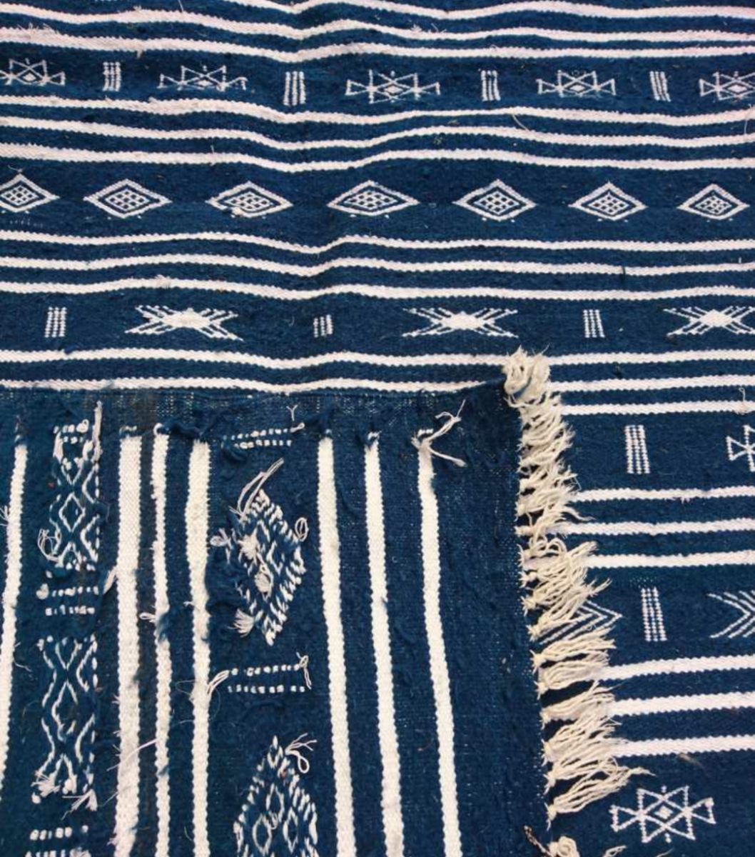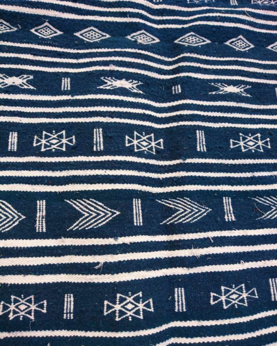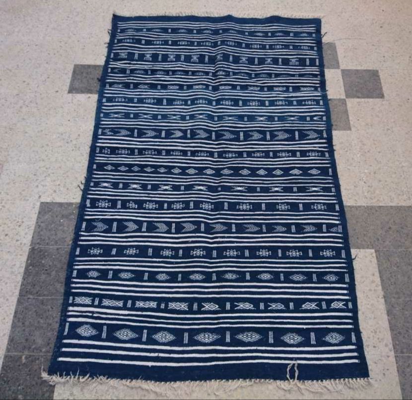 Matière: laine. Longueur: 235cm. Largeur: 140cm. Tapis tissés à la main en laine de mouton pure. Ils sont ornés de motifs géométriques et abstraits dans une association chromatique de moutarde rouge, bleue et jaune. Tous nos kilims proviennent de différentes régions de Tunisie.