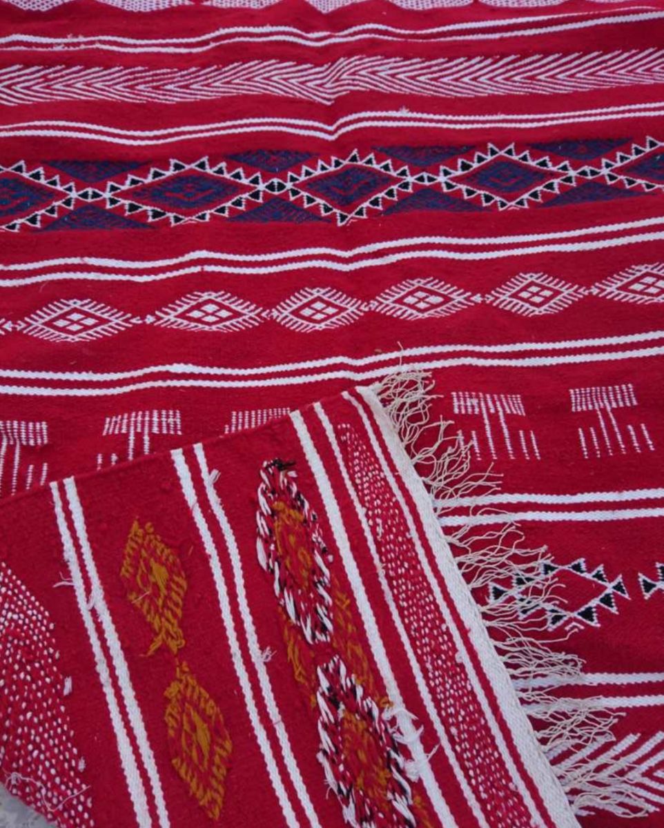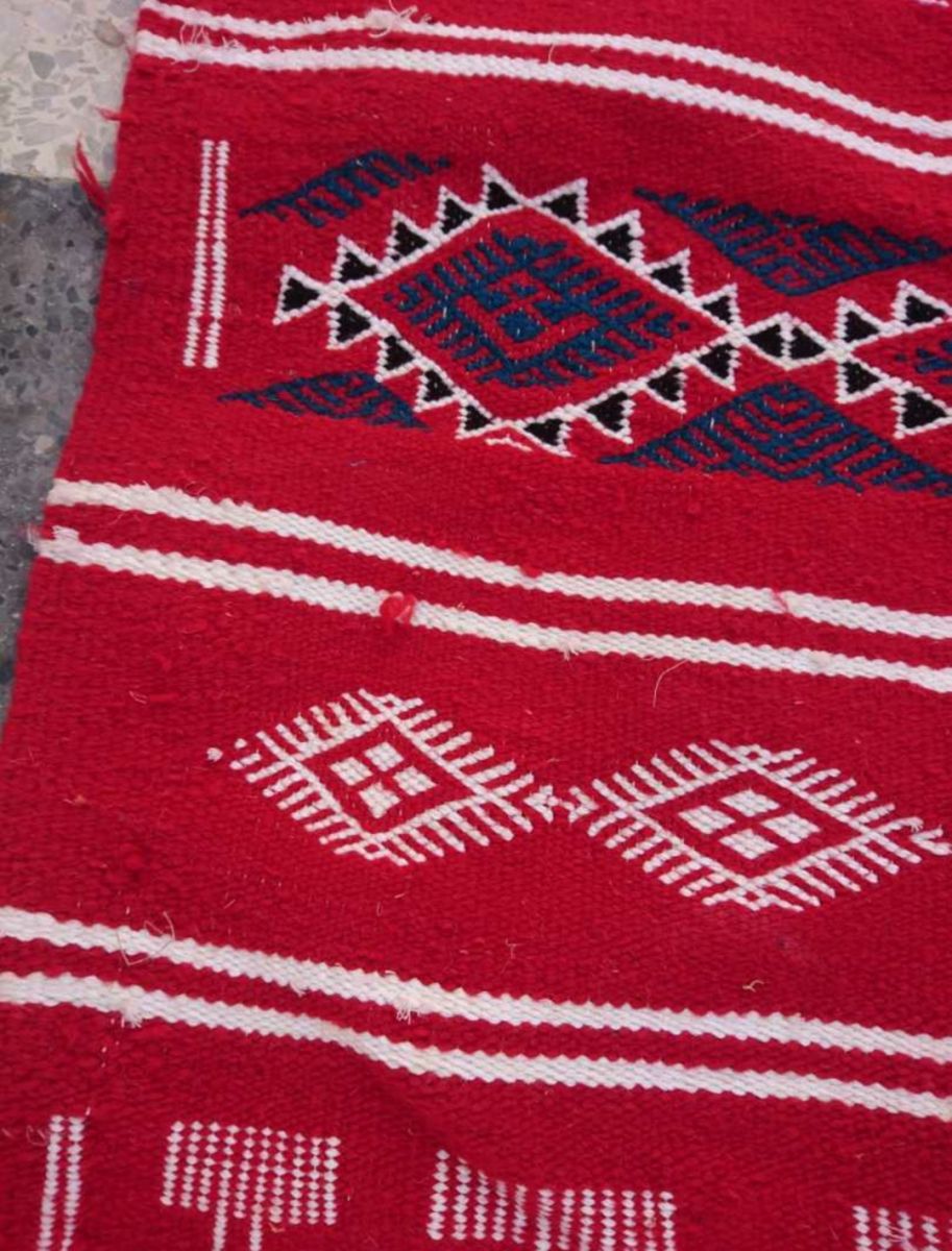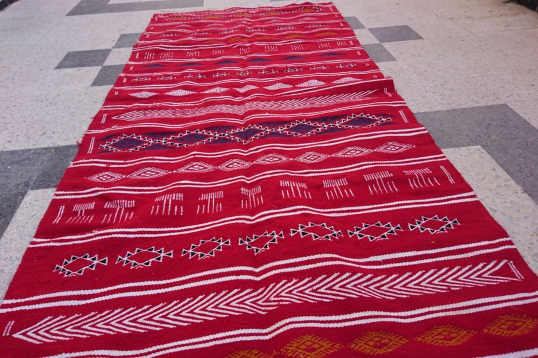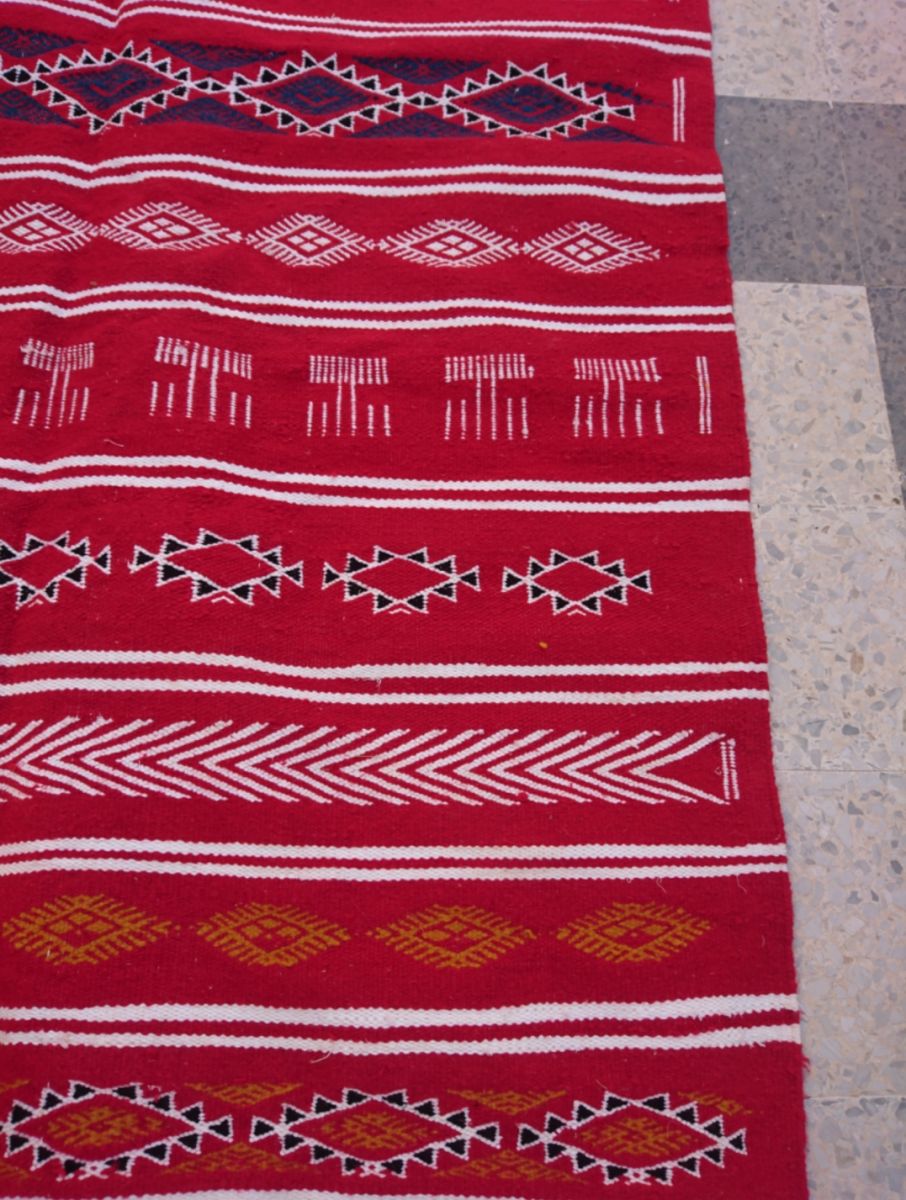Description: matière: laine . Longueur: 280cm. Largeur:125cm. Tapis tissés à la main en laine de mouton pure. Ils sont ornés de motifs géométriques et abstraits dans une association chromatique de moutarde rouge, bleue et jaune. Tous nos kilims proviennent de différentes régions de Tunisie. Ils sont l'œuvre de femmes extraordinaires et talentueuses qui perpétuent un savoir-faire ancestral. À travers leurs métiers, ces artisanes transforment la laine brute en poèmes.
