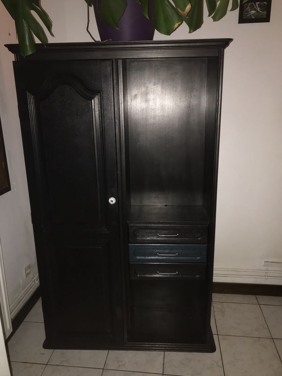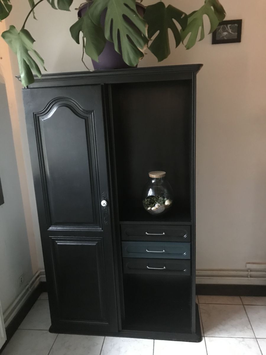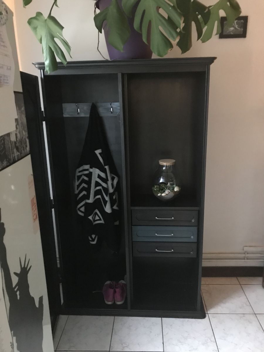 Meuble vestiaire original avec trois tiroirs et porte manteaux. Meuble entièrement rénové il est idéal pour une entrée. Peint en noir métallique et bleu métallique. Il mesure 170cm de haut pour 110cm de large et 60cm de profondeur.