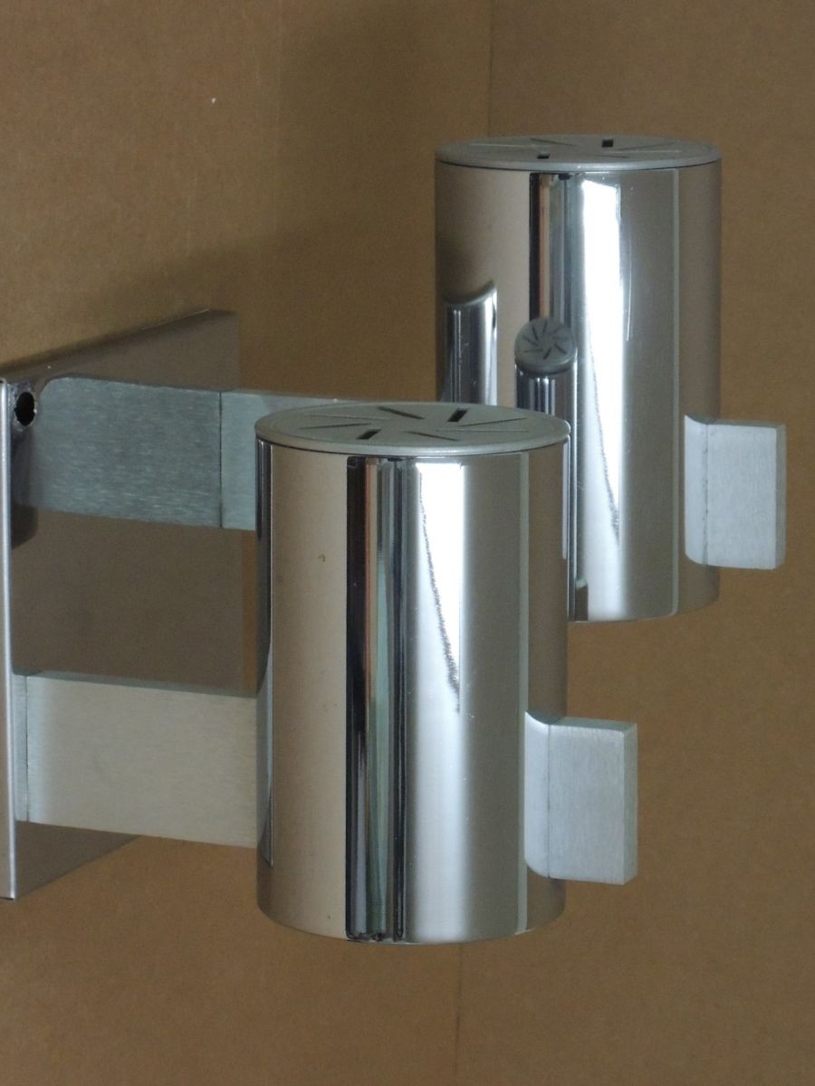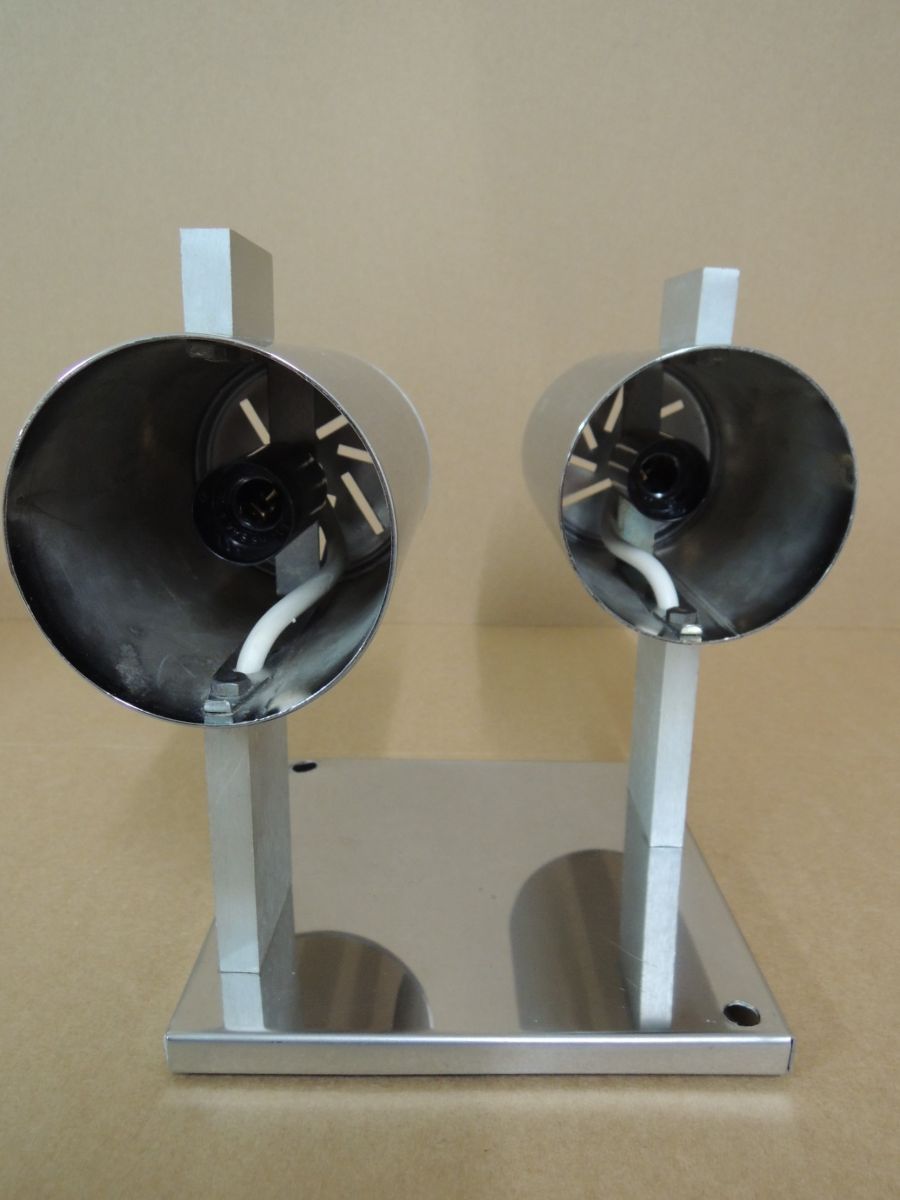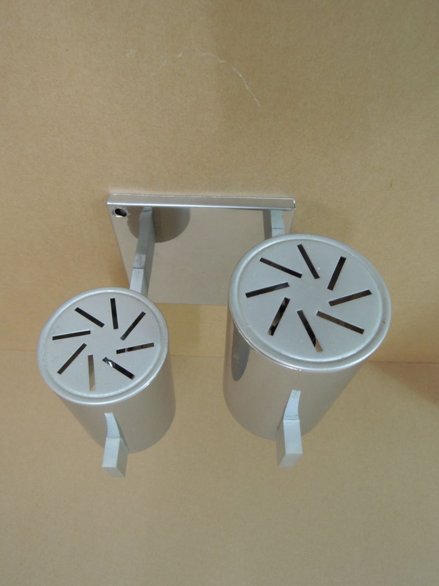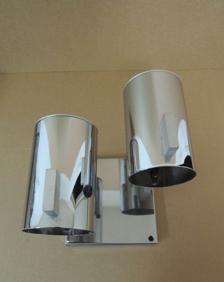 Applique murale en métal chromé (chrome intact), deux cylindres décalés de 8 cm de diamètre et 12 cm de long sur plaque carrée de 14 cm avec deux perçages de fixation. Électricité révisée, douilles à vis B14 neuves, dimensions : L20xP20xH20 cm