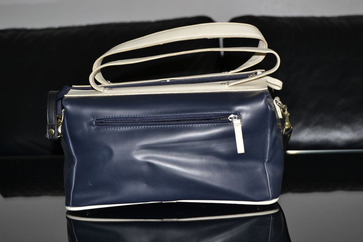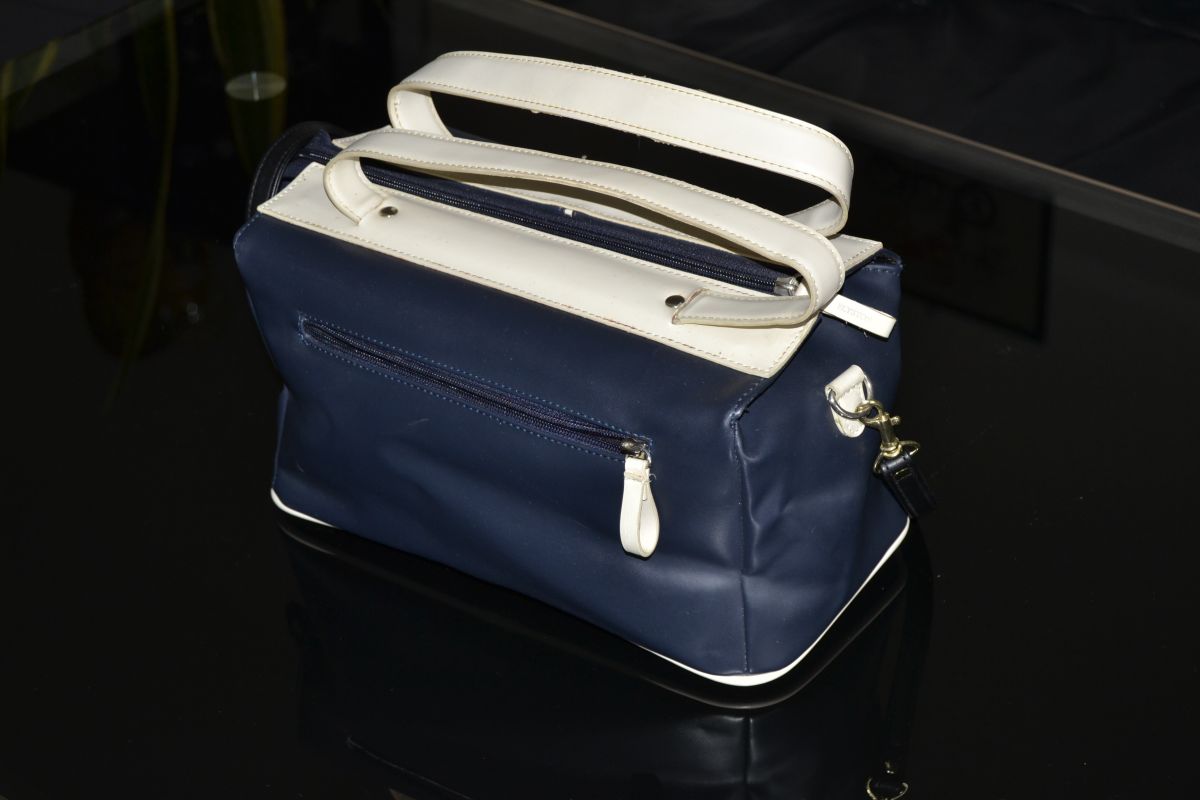 sac à main vintage en simili cuir bleu marine et beige marque Elyston au look d'un sac de bowling le dessous est clouté, la bandoulière a peut-être été remplacée ...,en super état malgré son âge (int comme ext)