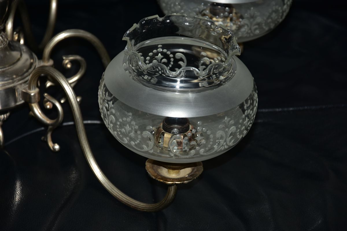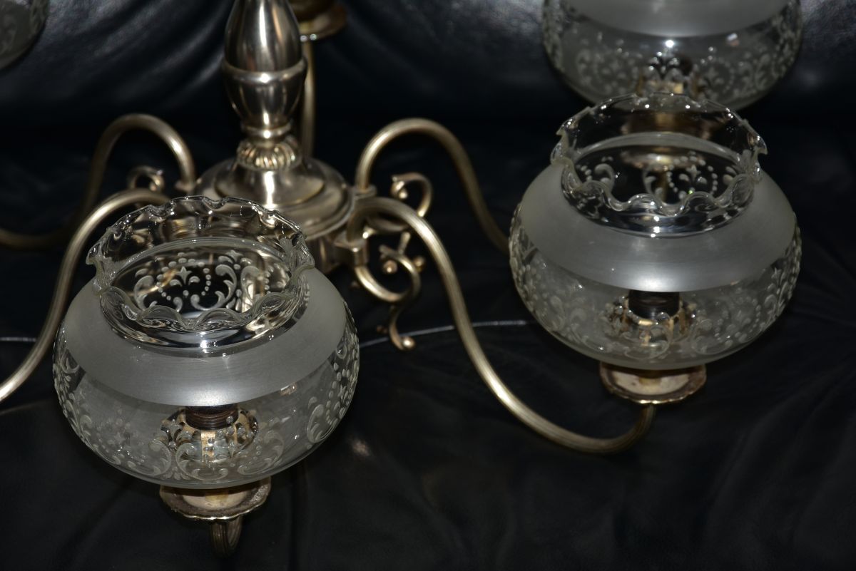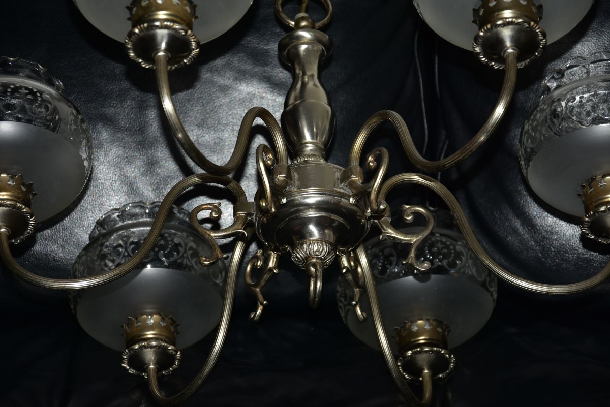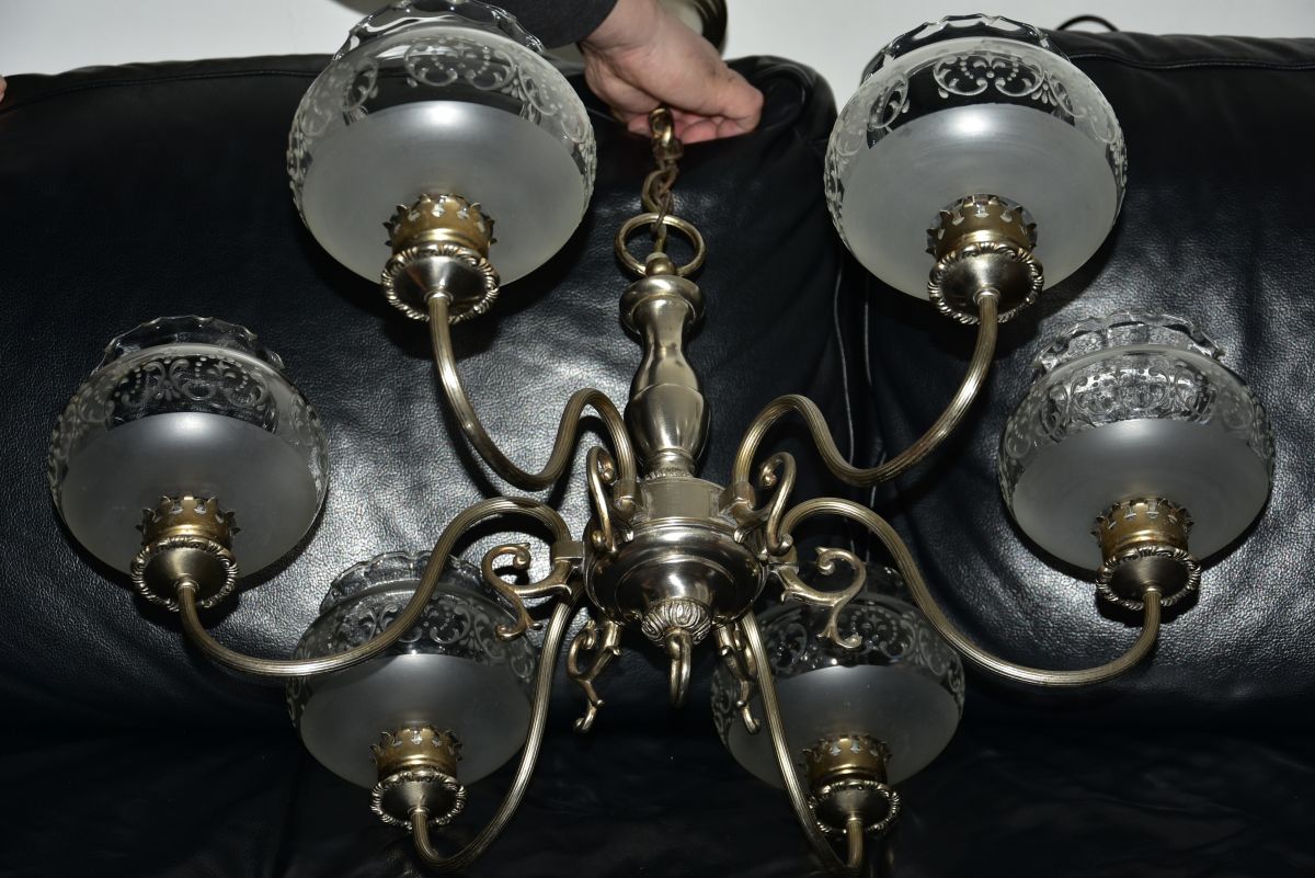 grand lustre en étain et verre au style western très belle qualité de fabrication après de nombreuses années de service je l'ai juste nettoyé il est équipé de 6 lampes à visser E14