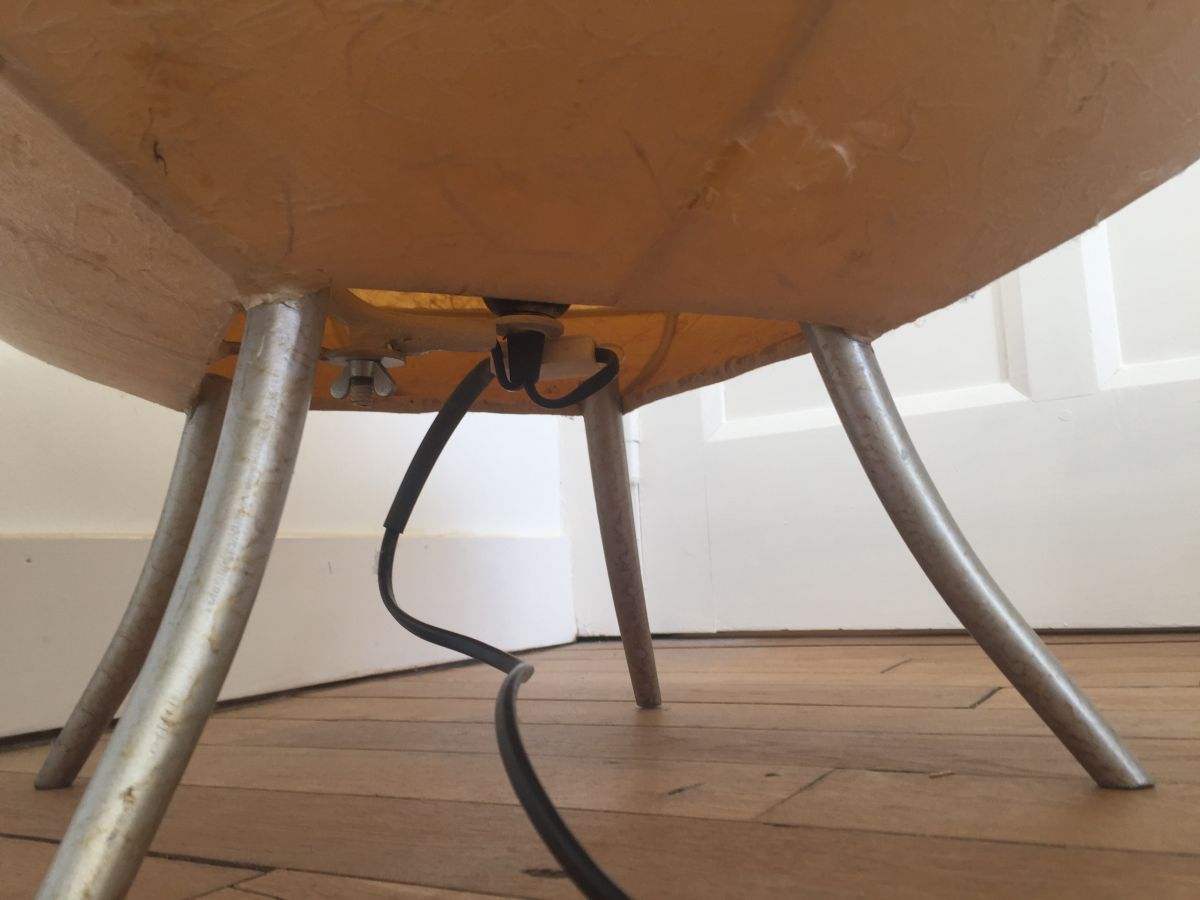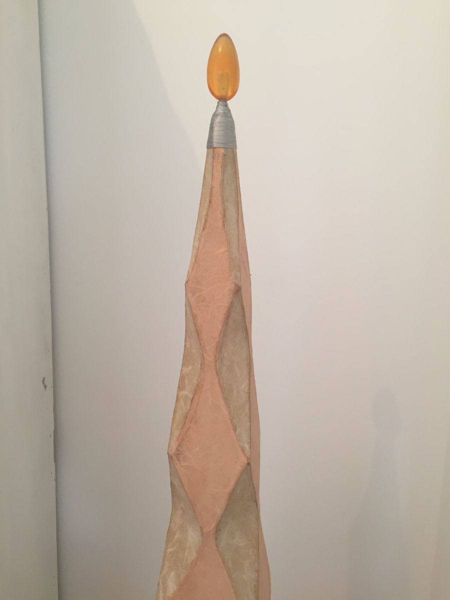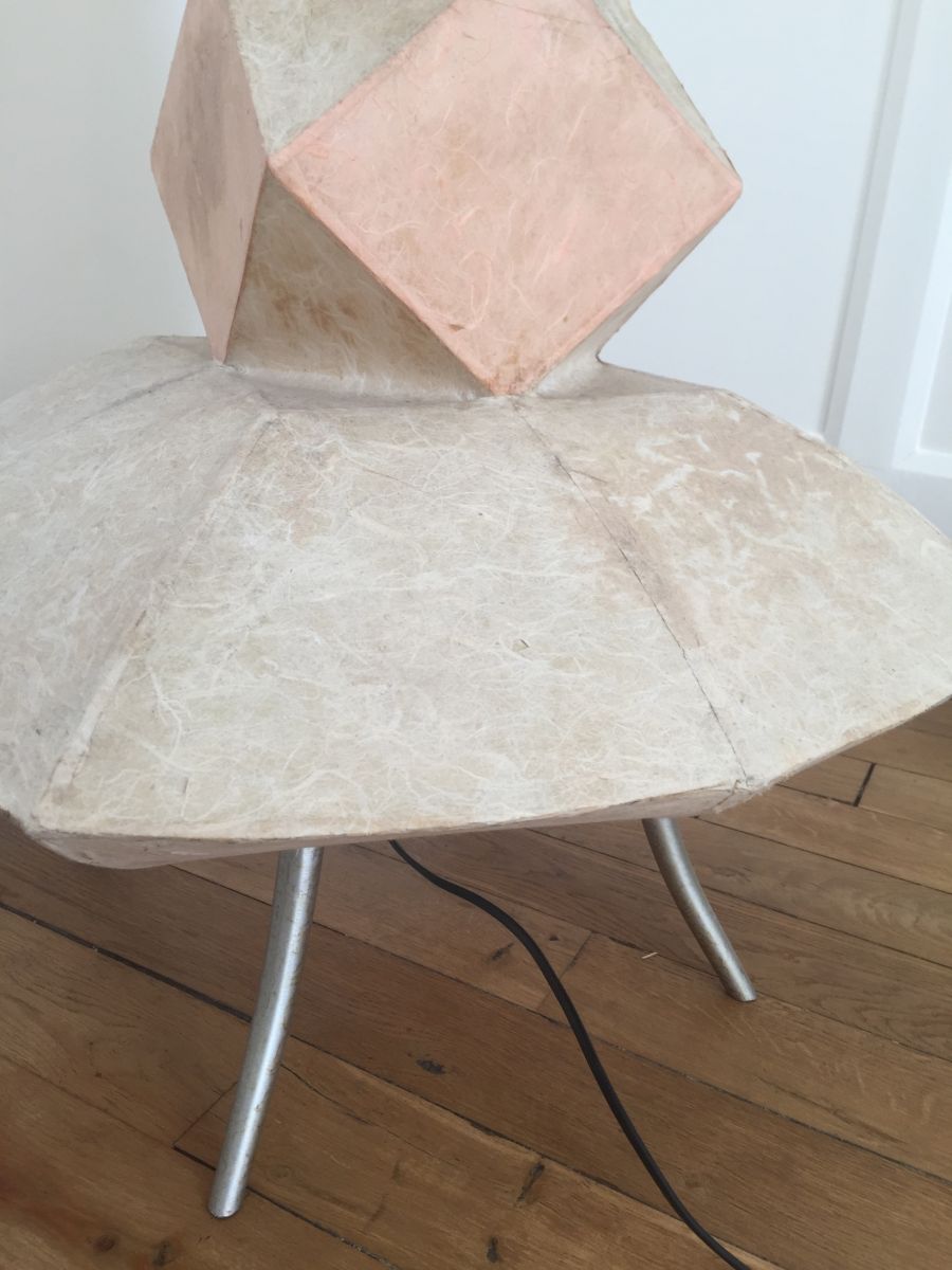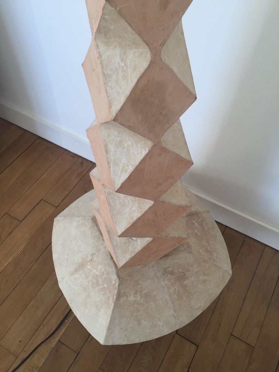 Superbe et authentique lampadaire des années 70 en plastique et papier maché, rare sur le marché, pieds métal, couleur jaune et orange, forme pyramidale, en bon état de marche, état du papier vintage dans son époque avec quelques réparations, embout tête en ambre, informations et photos supplémentaires sur demande, coût d'envoi si colis à rajouter en fonction car très fragile