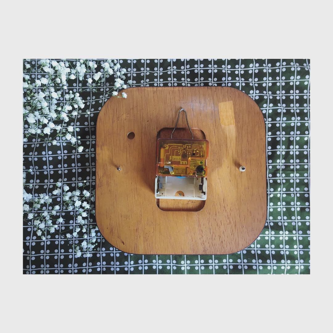 En très bel état. Le cadran est entouré d’une bordure dorée, peut-être du laiton. Il se maintient par deux vis fixées au dos (manque juste un petit écrou pour maintenir l’une des vis mais il tient bien en place). Le socle est en bois. Elle fonctionne. Date des années 1960.