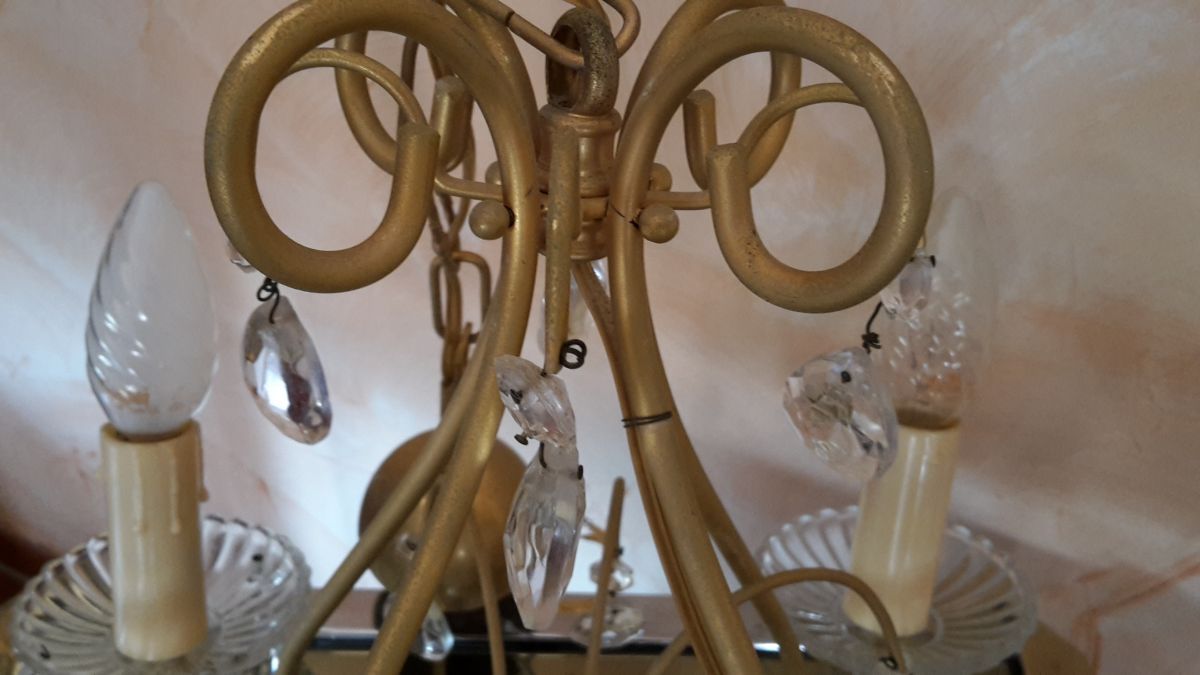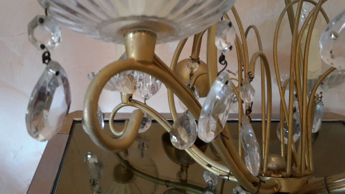 Lustre des années 70 à pampilles en verre, très chic car pas trop chargé, le modèle reste assez aéré. Ampoules à vérifier ou à changer.