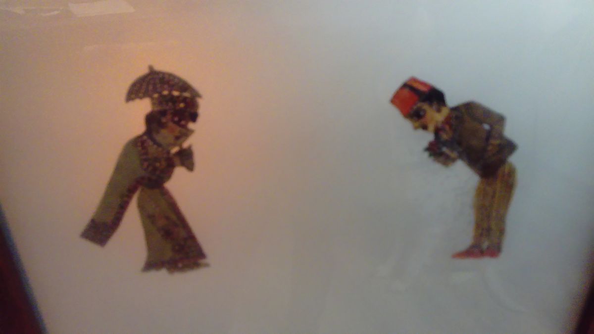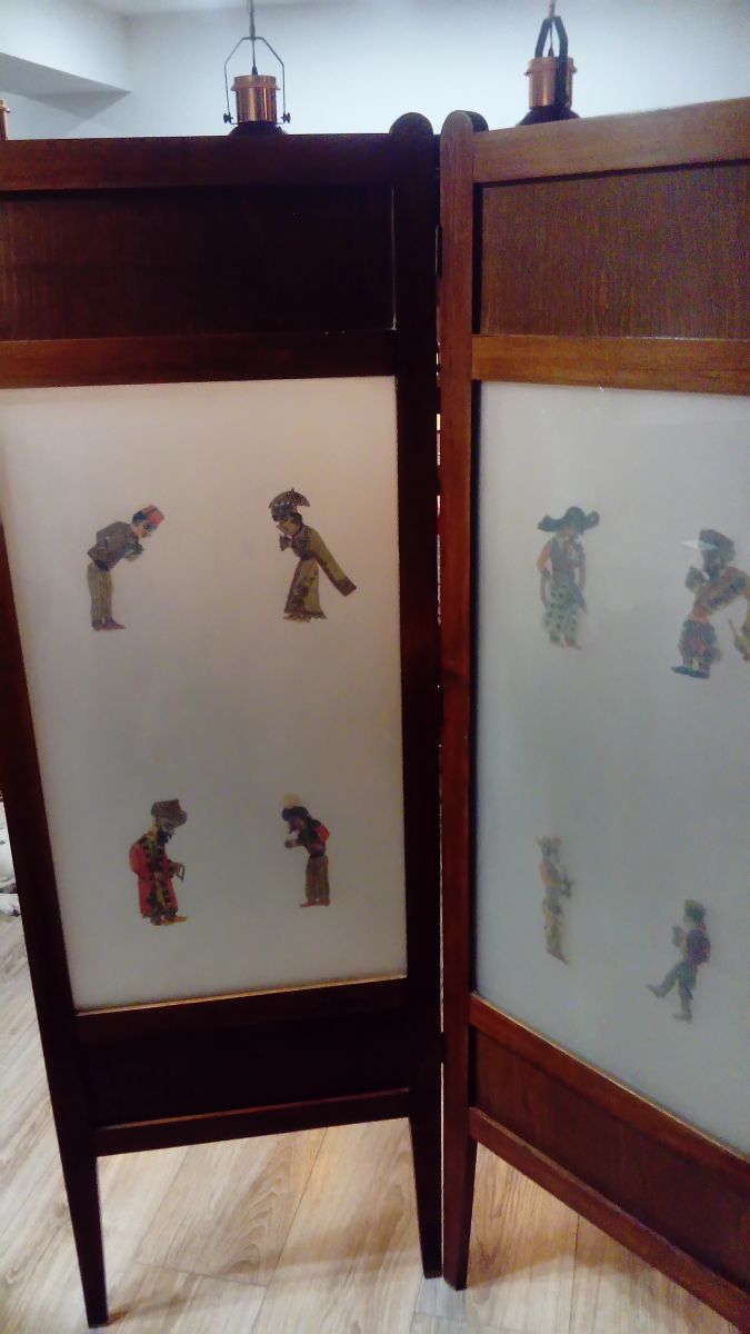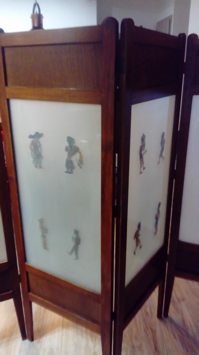Voici un magnifique paravent en bois et verre fumé très original de par ses petits personnages qui se trouvent entre les deux verres de chaque panneau du paravent.