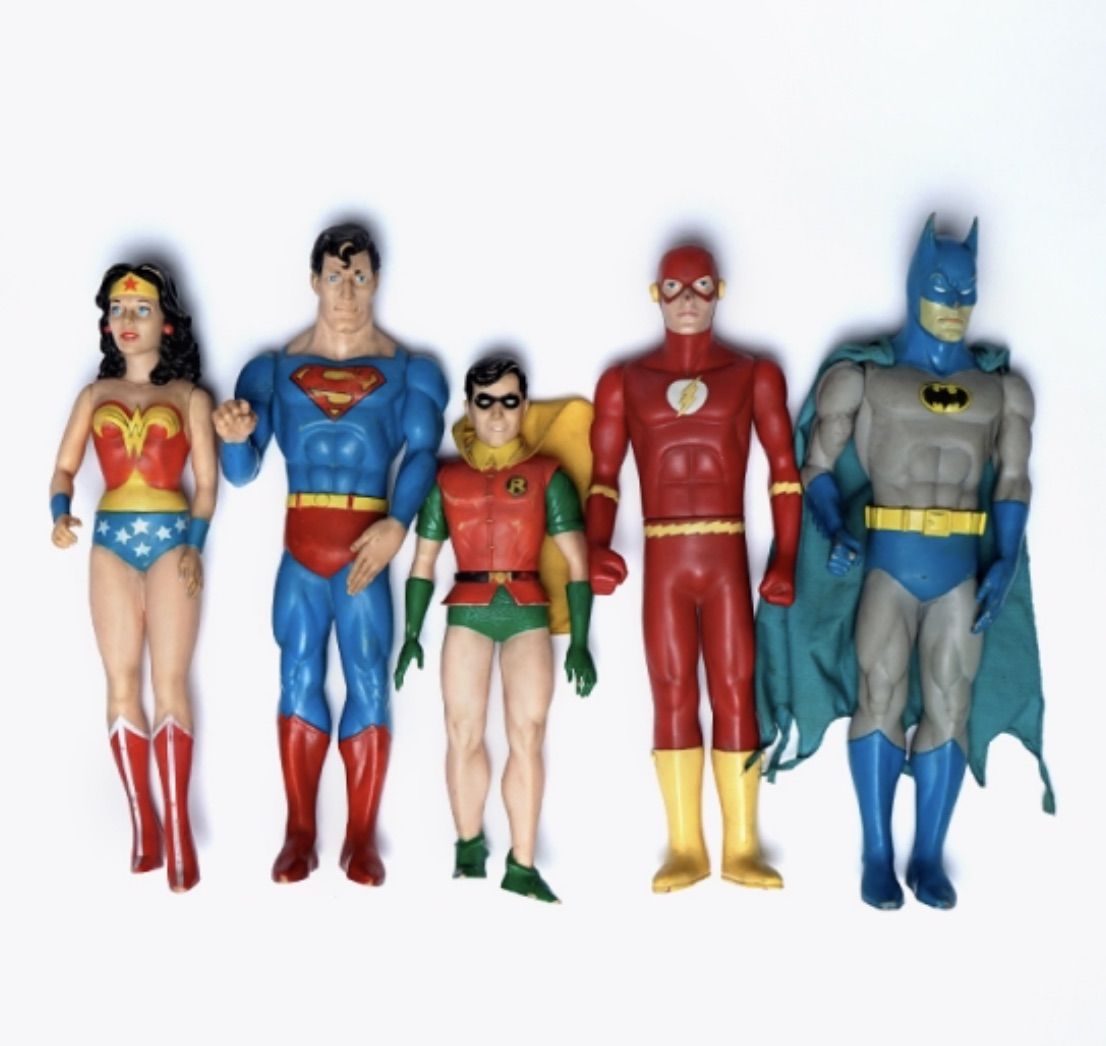 Figurine vintage collector, estampillés DC COMICS. Batman, Robin, Superman, Wonder Woman date de 1988 tandis que Flash Gordon date de 1993 (c'est indiqué sur leurs slip). Facile d'utilisation puisqu'en plastique dur, elles peuvent être autant conservés sous vitre que dans les mains d'un enfant.