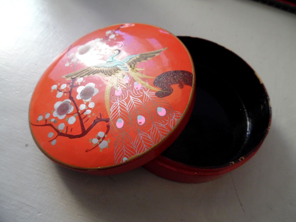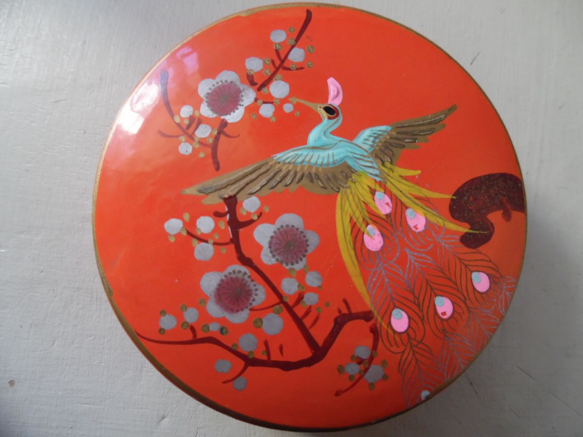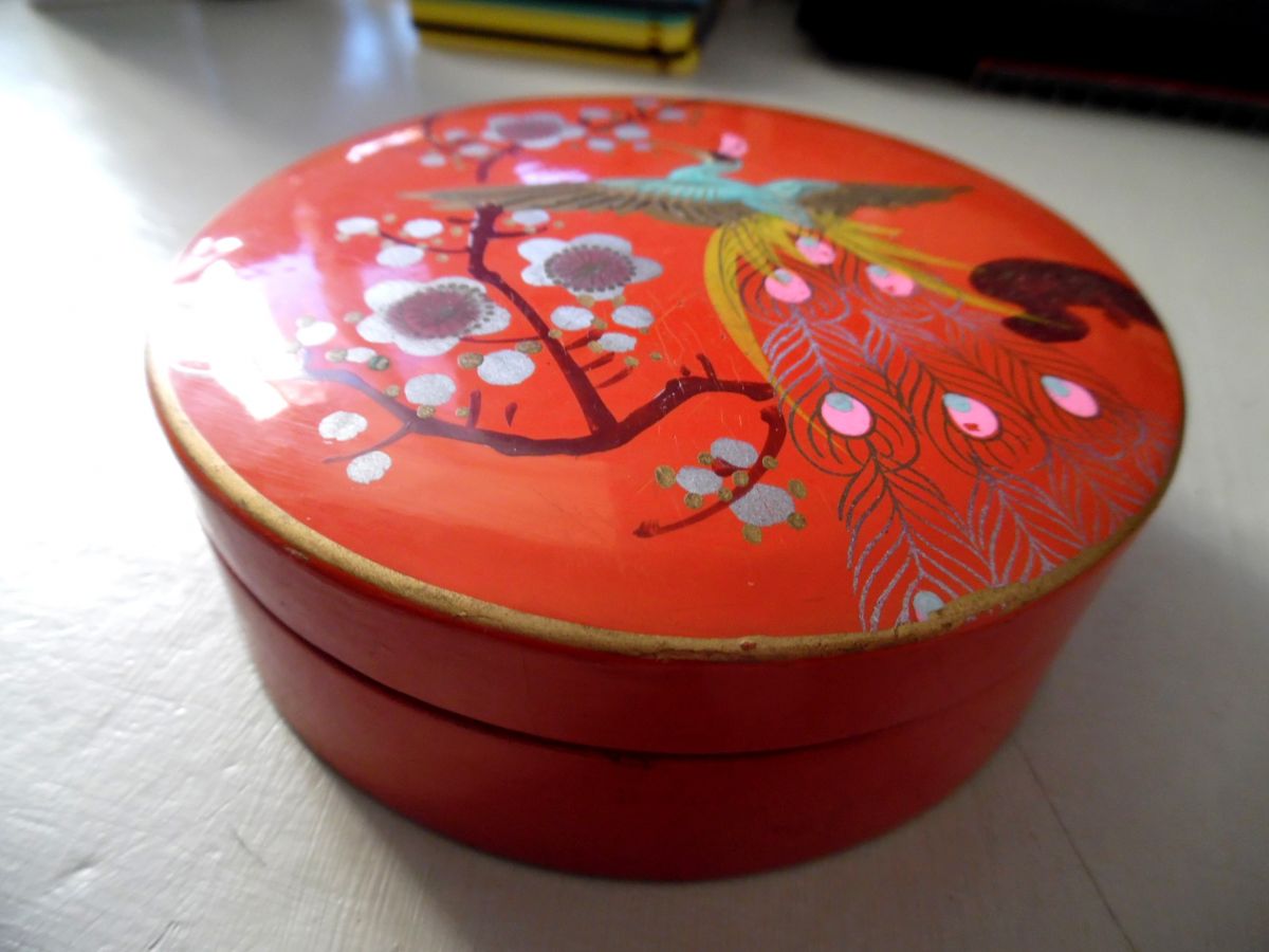 joli boite ronde de 12 ,50 cm de diamètre , thème asiatique,peinte à la main.