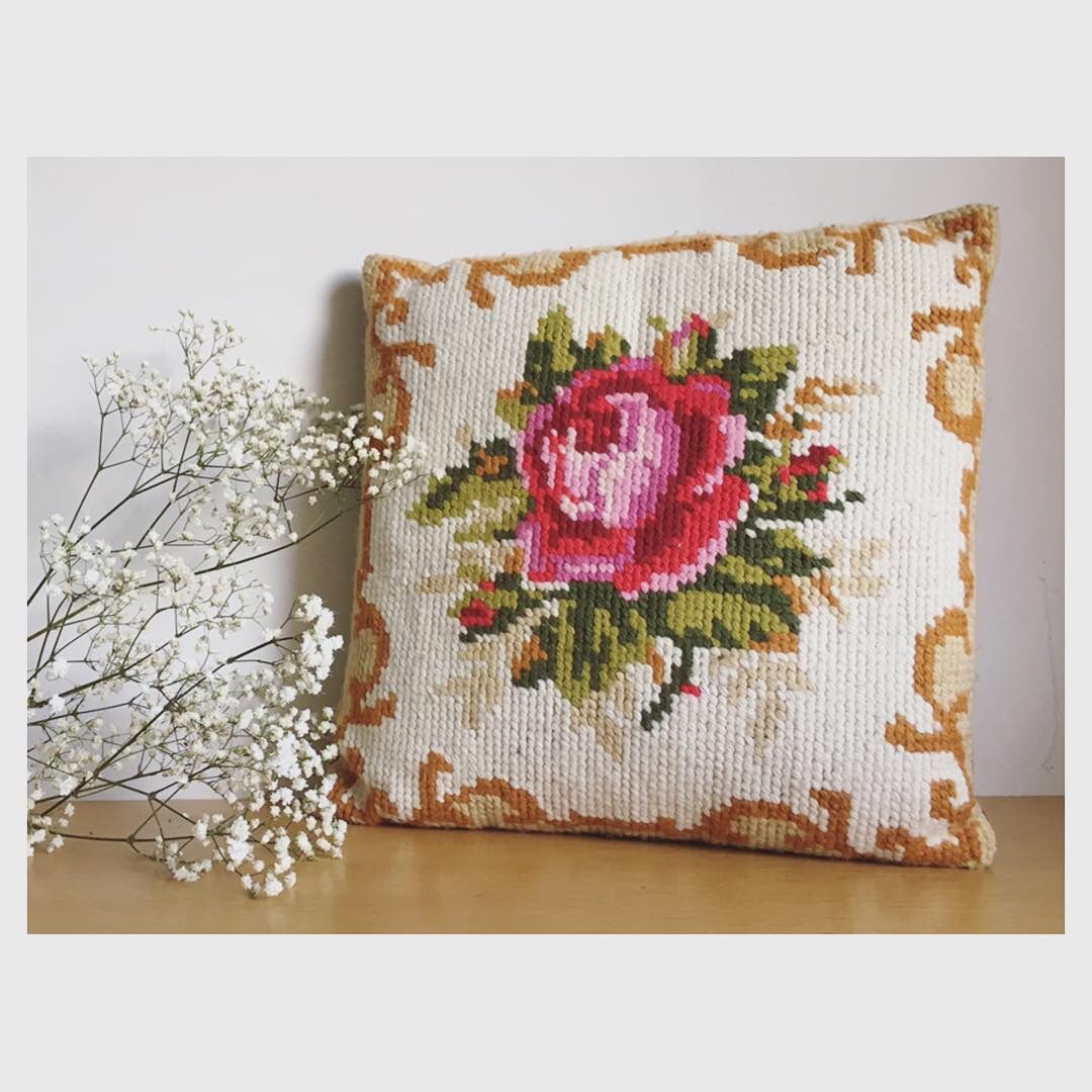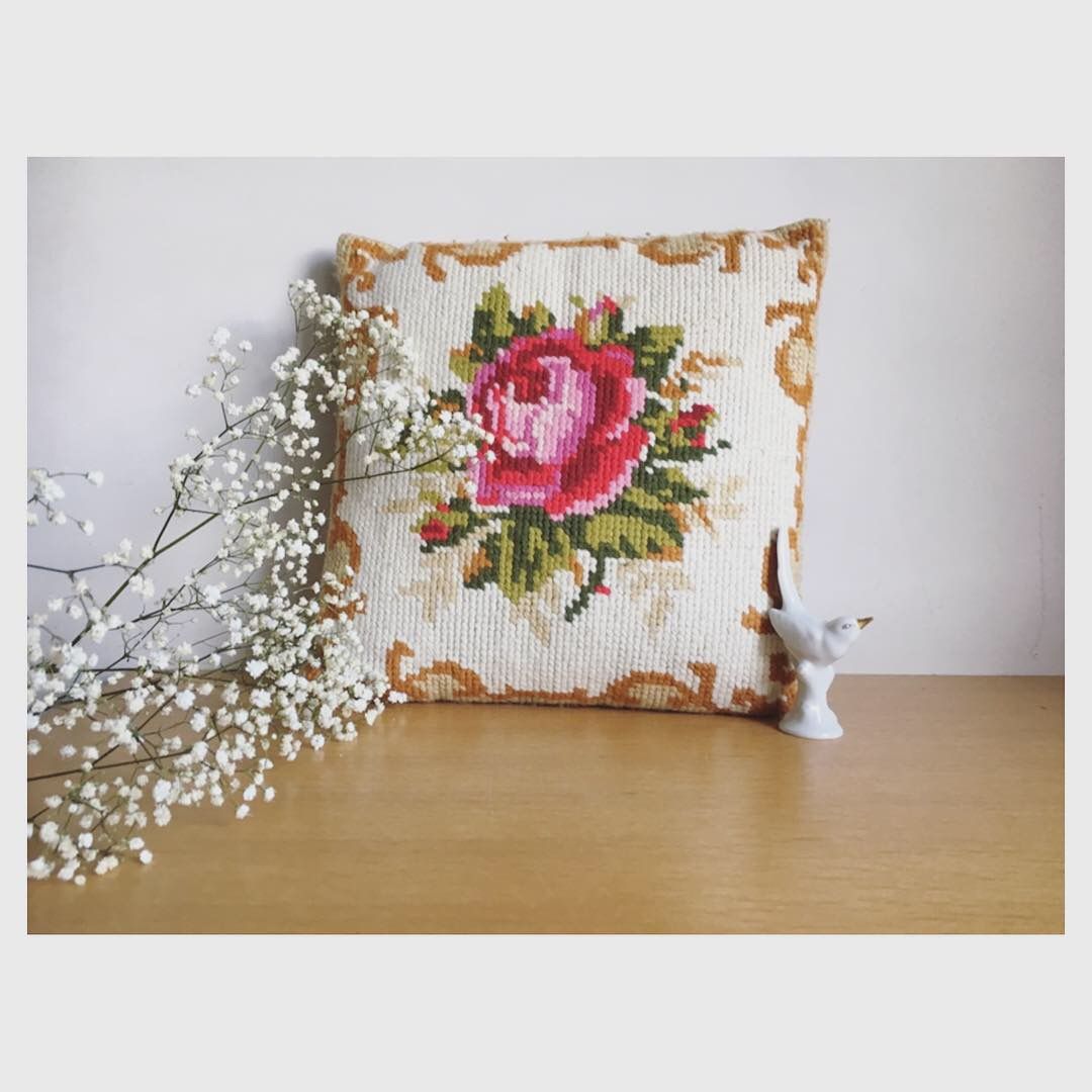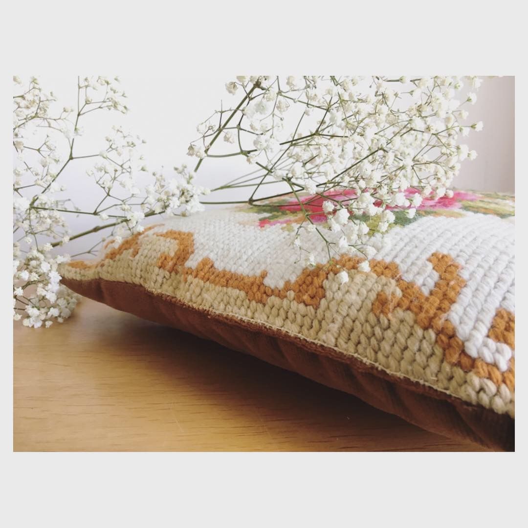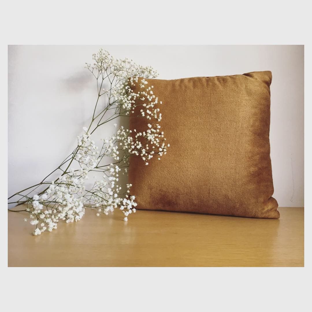 Un joli carré brodé sur un côté et en tissu velours marron doré au dos.