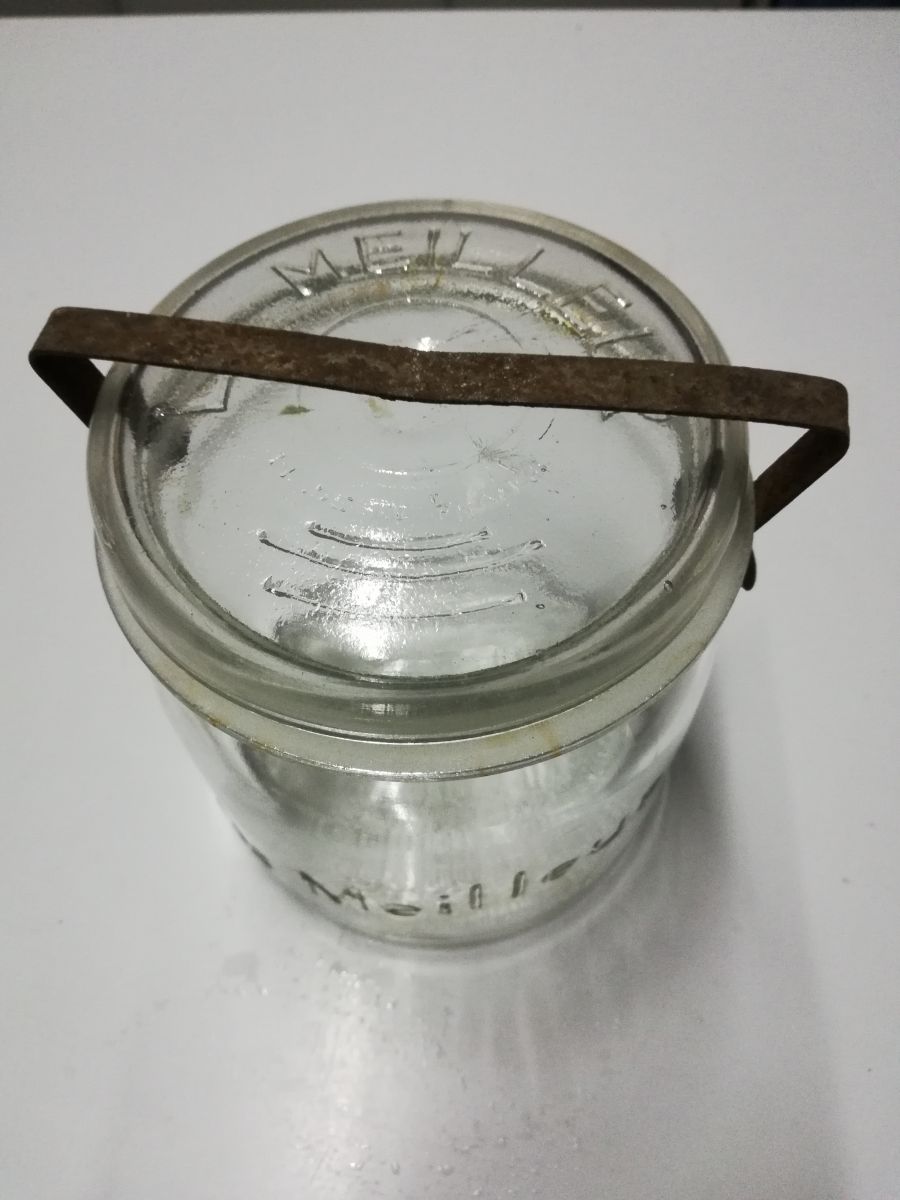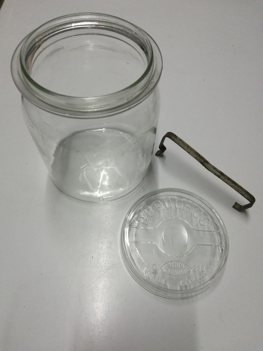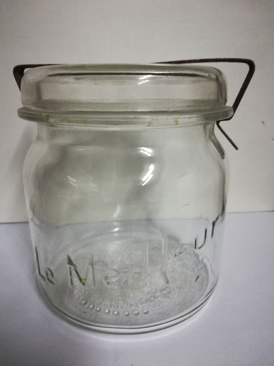 Bocal ancien complet avec couvercle et attache métallique de la marque "le meilleur".