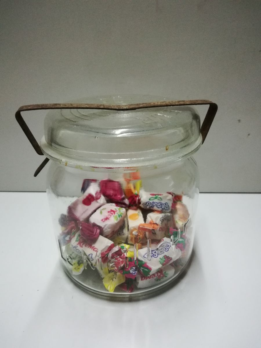 Très belle objet vintage pour stocker vos vivres ou utilisé comme bonbonnière... Attache métallique avec légères traces de rouille (rouille stoppée et traitée), normal vu l'âge!