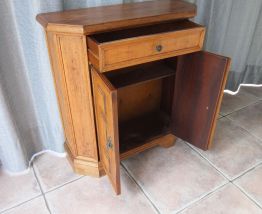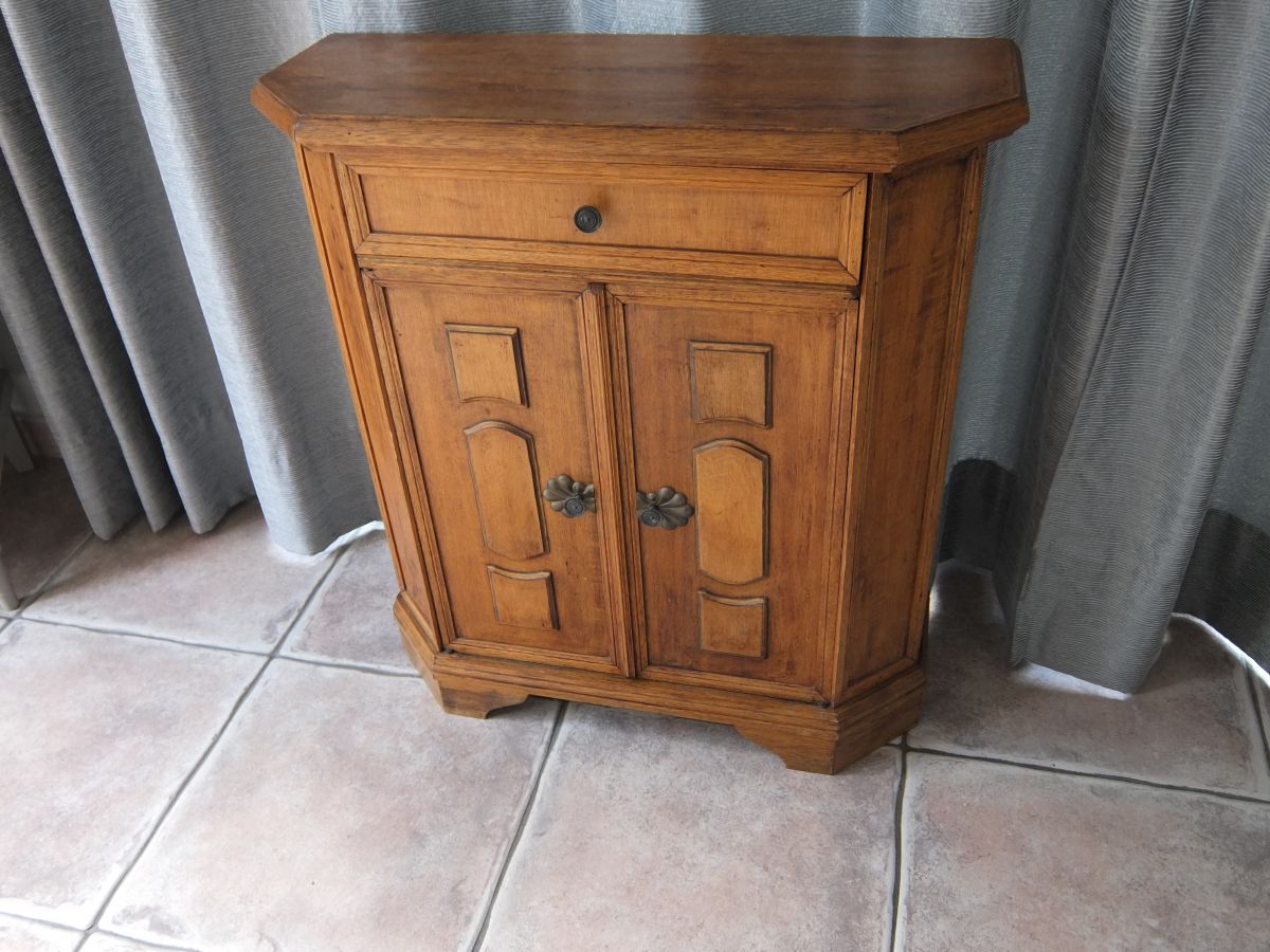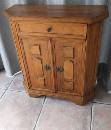Petit meuble d'appoint sympa, 2 portes 1 tiroir. Faible encombrement, largeur 70 cm, profondeur 26 cm, hauteur 76 cm.