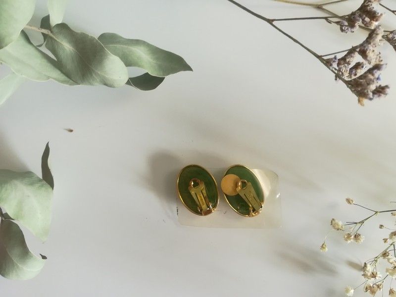 Comme neuve, très peu portée. Boucle d'oreille avec attache clip rétro. Contour en laiton doré et centre motif art-déco vert.