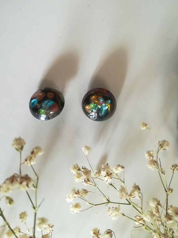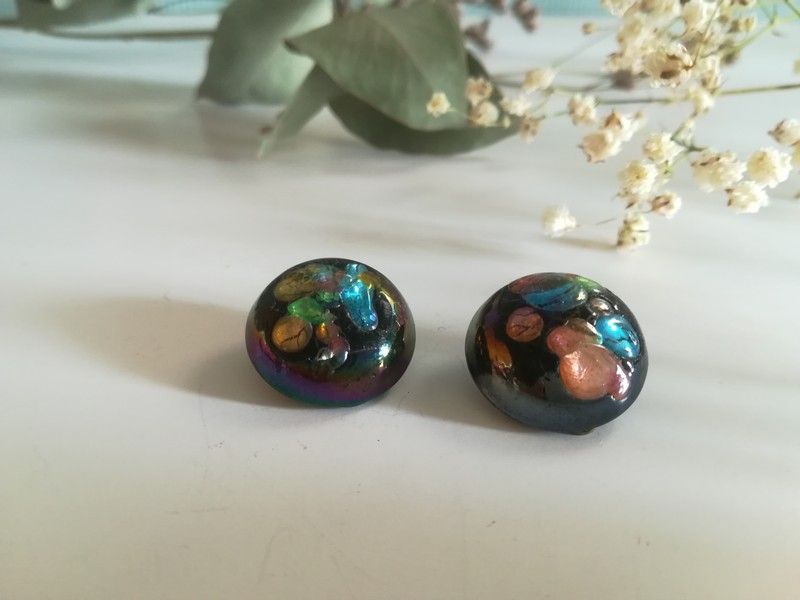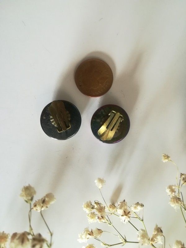 Authentique vintage. Attache à clips. Résine violette avec touche d'émaux jaune rose et bleu. diamètre 2cm