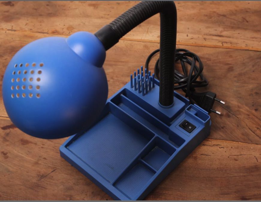 Lampe de table des années 70. Typique avec son organisateur et sa possibilité "orientable". Bleu et noir. Métal et plastique.