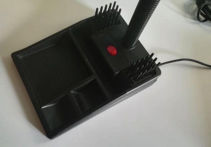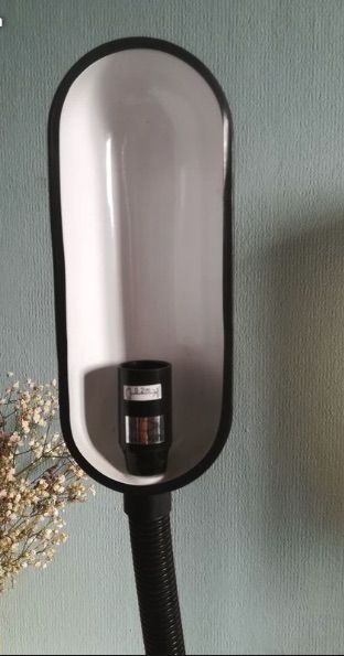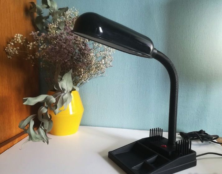 lampe de bureau avec organisateur. abajour en métal noir ovale, flexible noir en plastique et socle plastique noir. ampoule e14 40w culot à vis.
