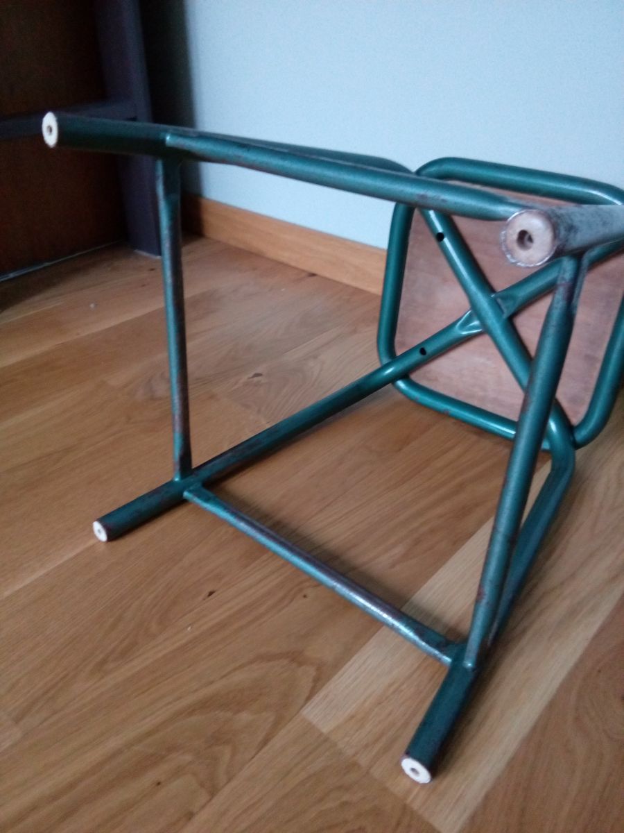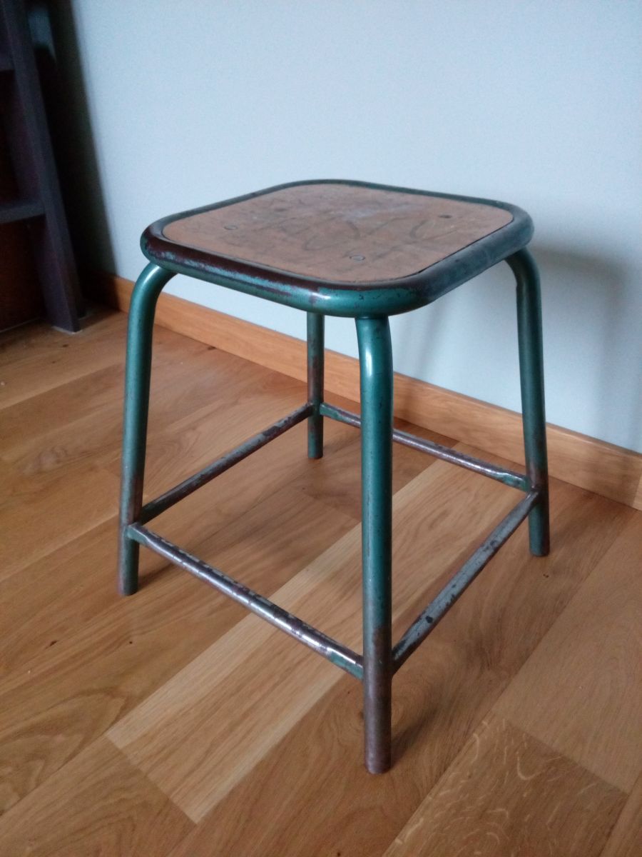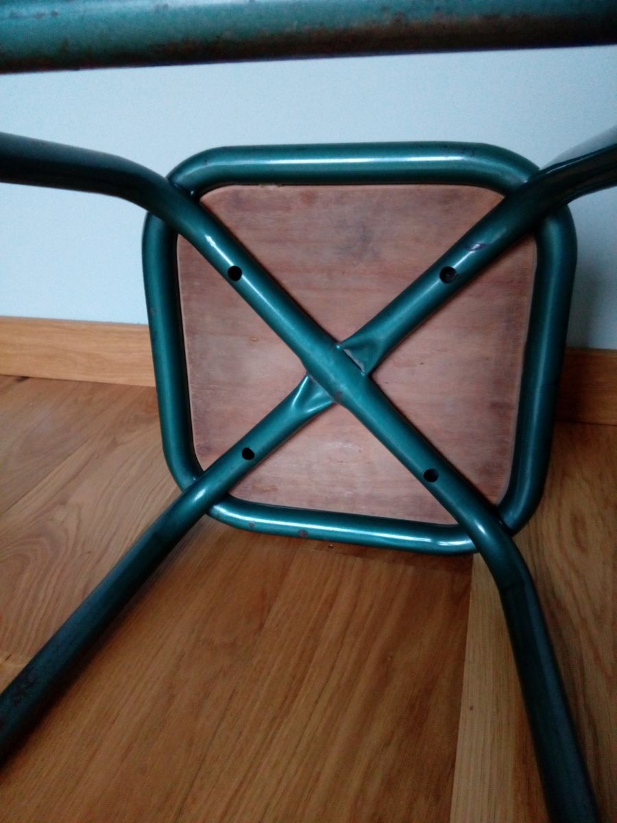 Ce joli tabouret d'école ou d'atelier ( Mullca? sans certitude aucune), mélange de vintage avec cette jolie couleur bleu vert tellement typique (souvenirs d'école des années 50 ou 60) et d'industriel avec son piétement tubulaire en acier et son assise en bois. Ce tabouret est en bon état général, stable, solide, mais dans son jus (je n'ai rien fait, je vous laisse le plaisir de décider ce que vous allez en faire). Il présente les marques de son âge et de son utilisation par des écoliers: taches et rayures sur bois, rouille superficielle sur le piétement, la couleur bleu vert est encore bien présente sur les montants verticaux, mais a disparu en partie sur les tubes horizontaux, laissant un acier gris patiné sur le pourtour du siège. Il manque les patins en plastique. Il mesure 45 cm de haut, l'assise mesure 31 cm sur 31 cm. Et 40 cm par 40 cm au niveau du piétement. Il pèse près de 5 kg.