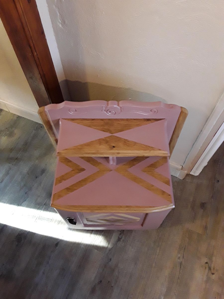 Couleur : vieux rose et bois vernis.