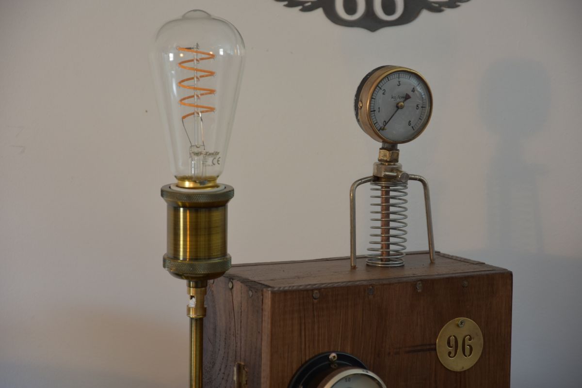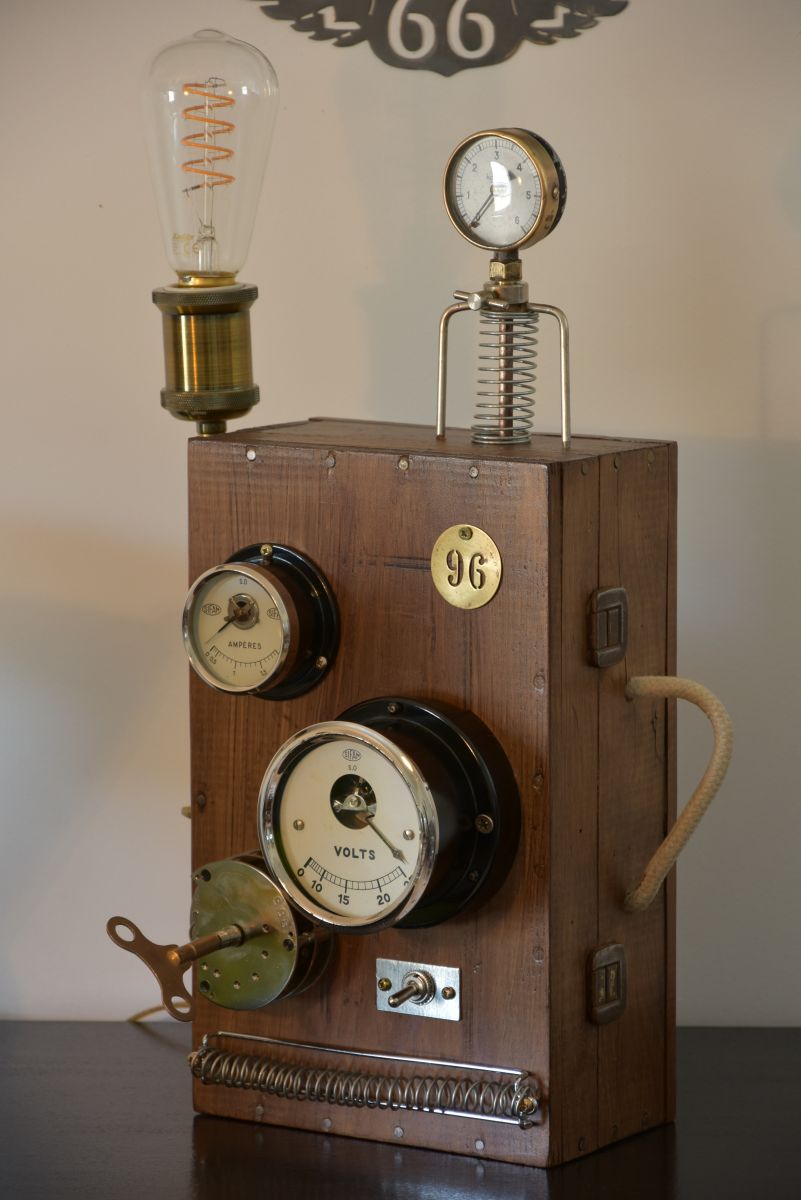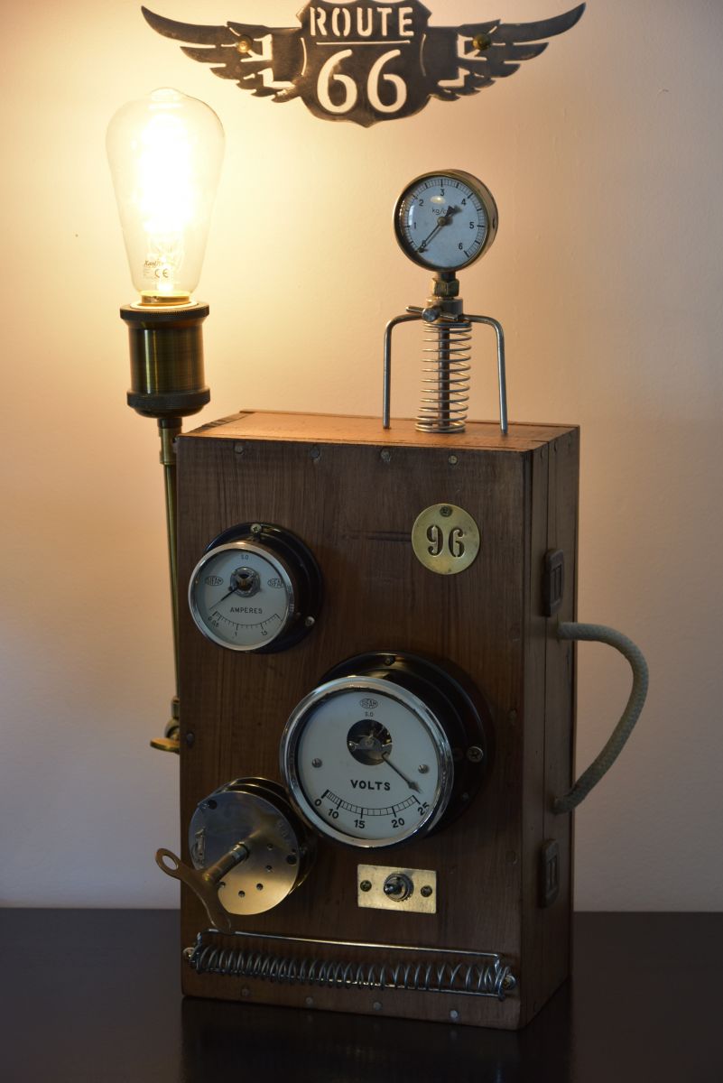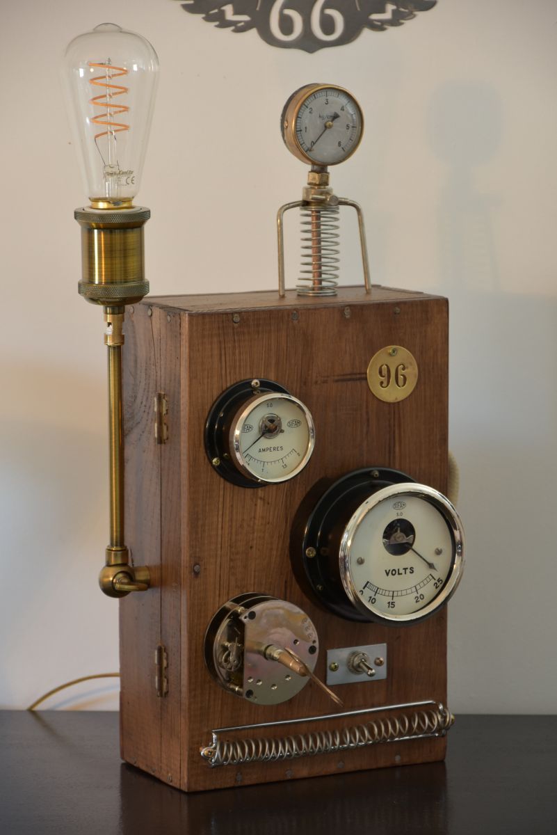Lampe unique d'inspiration steampunk intitulée"Box 96" ancien numéro de chambre d'hôtel ; tout est parti d'anciens voltmètre, ampèremètre et manomètre dénichés dans des brocantes, ajoutez à ça une horloge indus, un coffret de vin en bois et voilà Box 96 était née